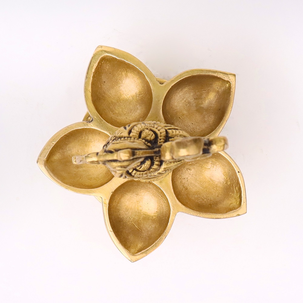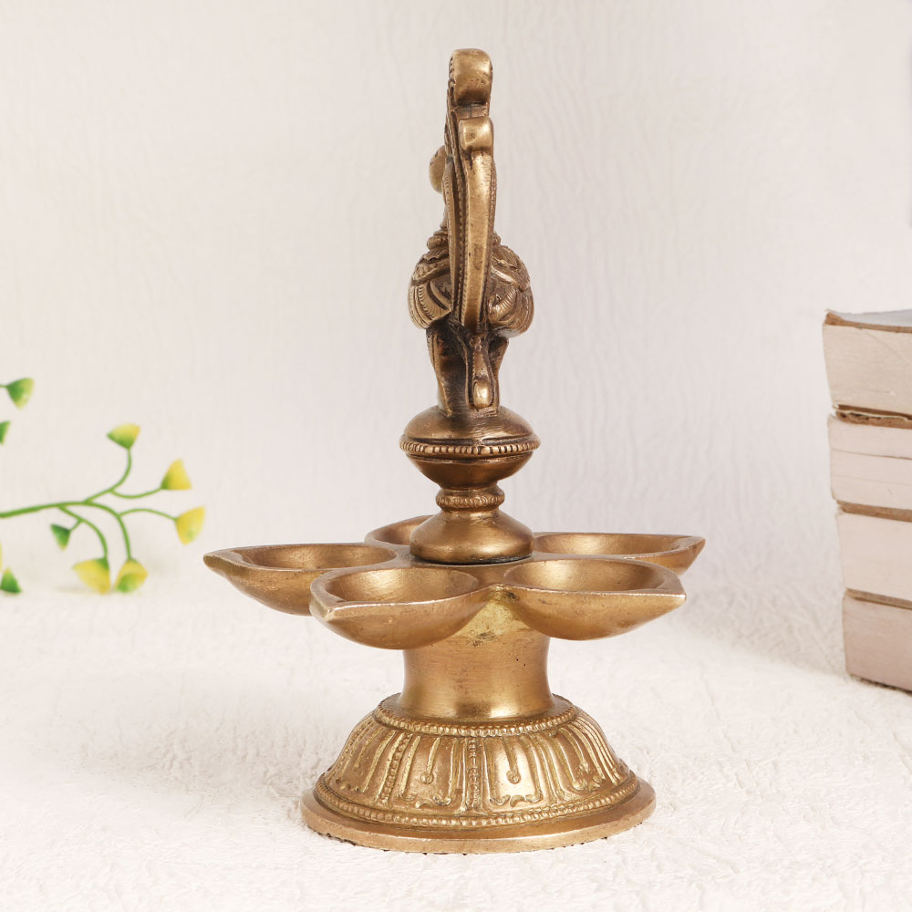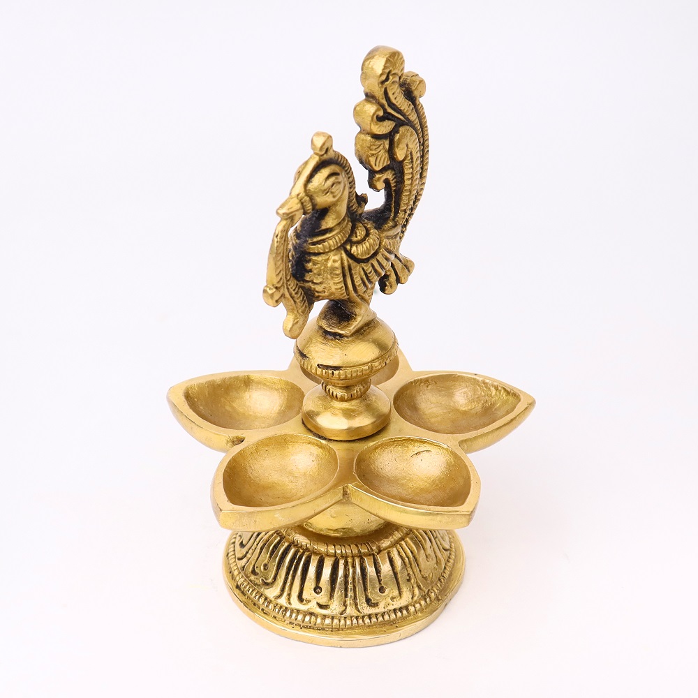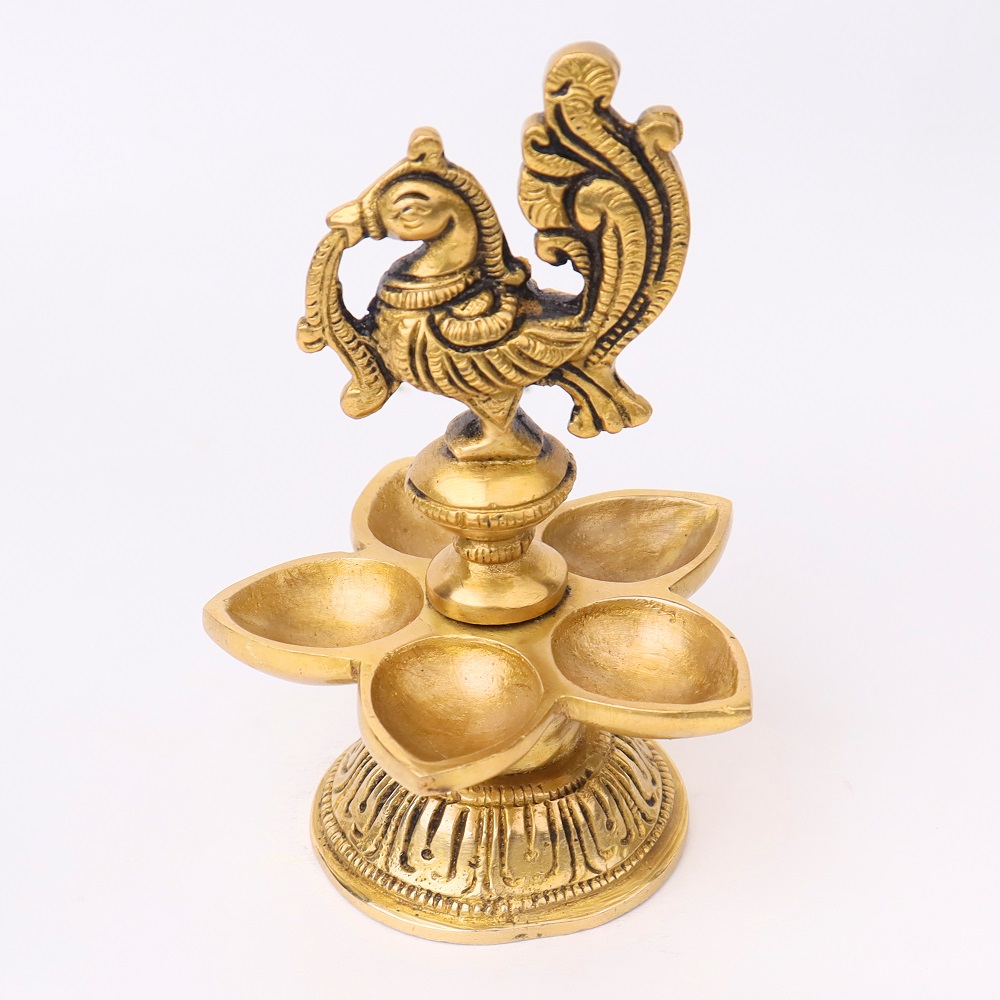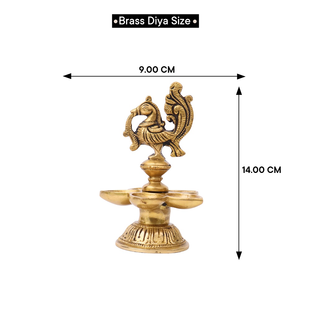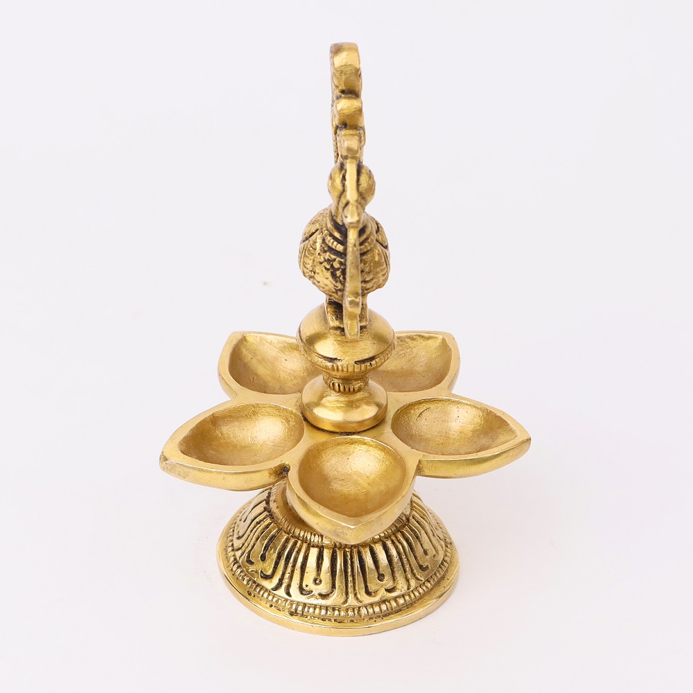 Enhance the ambiance of your space with the exquisite Brass Peacock Oil Lamp. Crafted by highly skilled and experienced Indian artisans, this masterpiece is a testament to their craftsmanship and attention to detail. This splendid oil lamp boasts a stunning antique brown finish that adds a touch of vintage charm to any setting. Its intricate design features a majestic peacock, a symbol of grace and beauty in Indian culture, making it a captivating decorative piece. Equipped with five jyots, you can illuminate them simultaneously using mustard oil or desi ghee with cotton wicks. The soft, flickering glow creates a warm and inviting atmosphere, perfect for enhancing the aesthetics of your home, office, restaurant, hotel, cafe, or shop. Whether you're an avid collector of vintage items or wish to exhibit it at special events, this lamp is a conversation starter. Additionally, it makes a thoughtful and memorable gift for your loved ones during special, festive, or auspicious occasions.