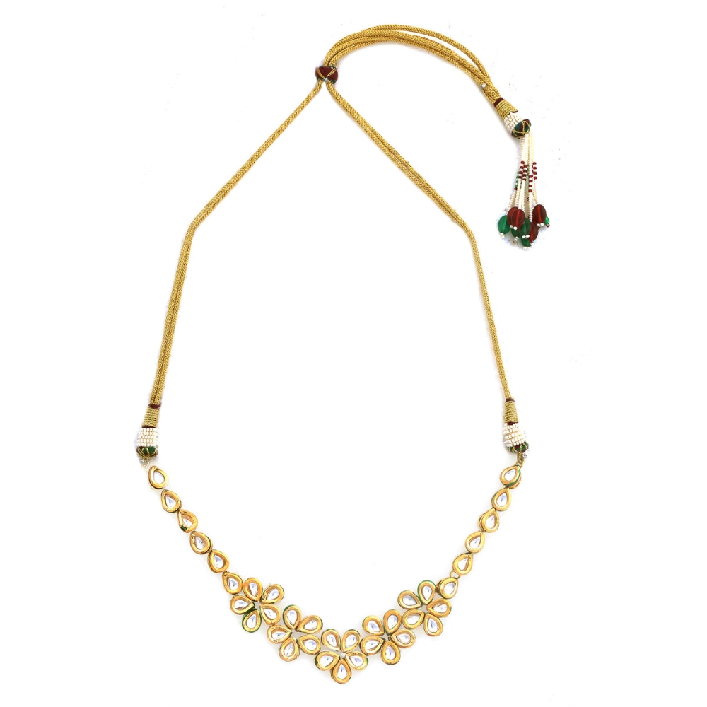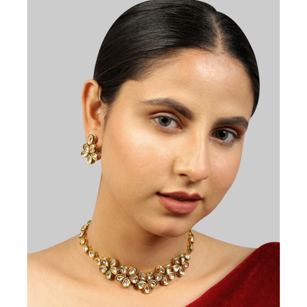 This handcrafted choker showcases floral kundan clusters arranged symmetrically, offering a harmonious blend of classic craftsmanship and graceful design.