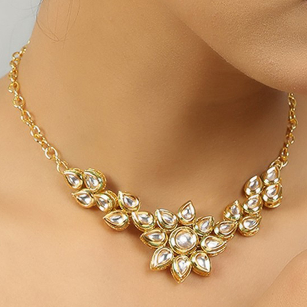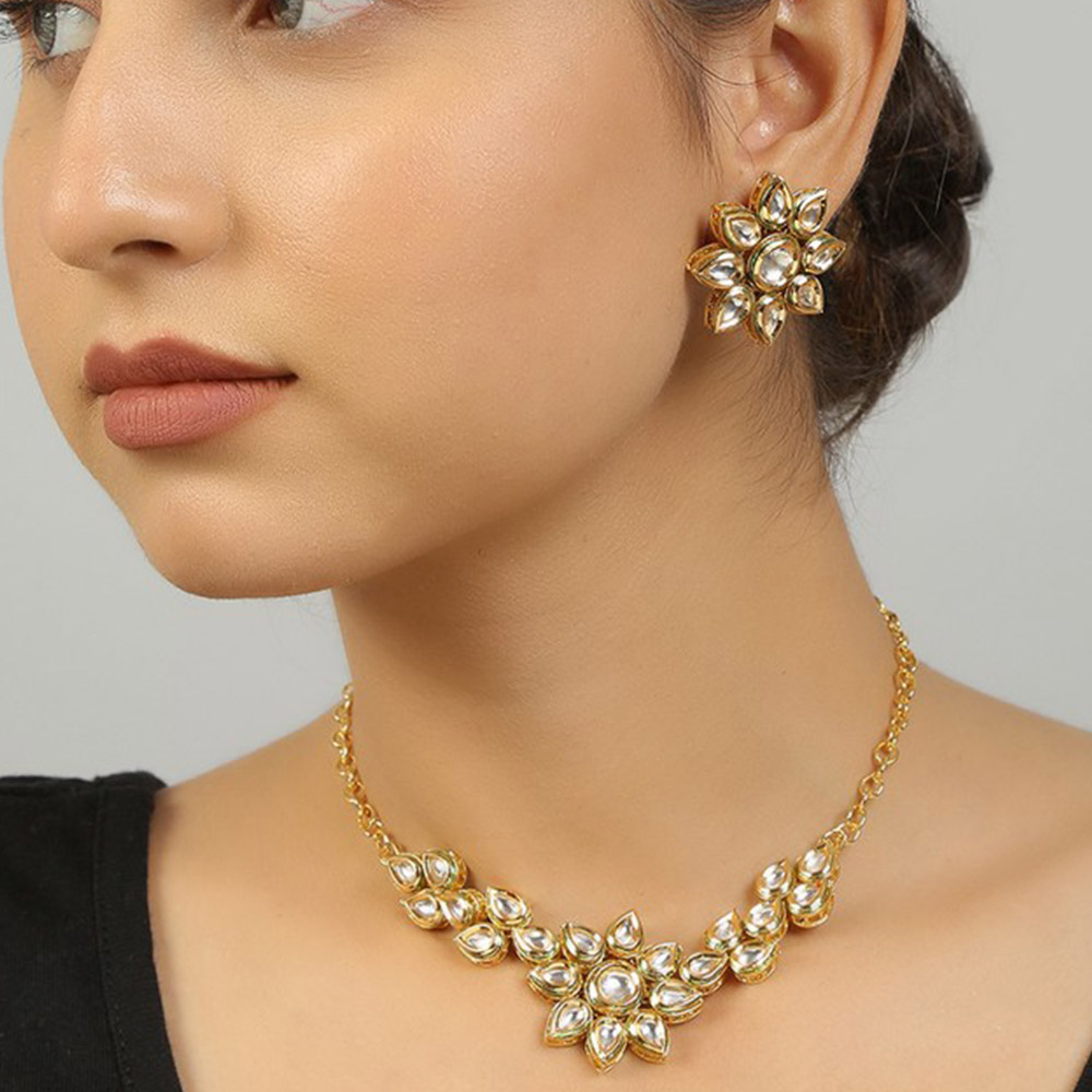 Celebrate individuality with our handcrafted 14-Inch Floral Kundan Necklace with Earrings. This exquisite set features a floral kundan necklace and matching earrings, perfect for bridal ensembles, festive occasions, and meaningful gifting. Packed & quality-checked by Indianshelf.
