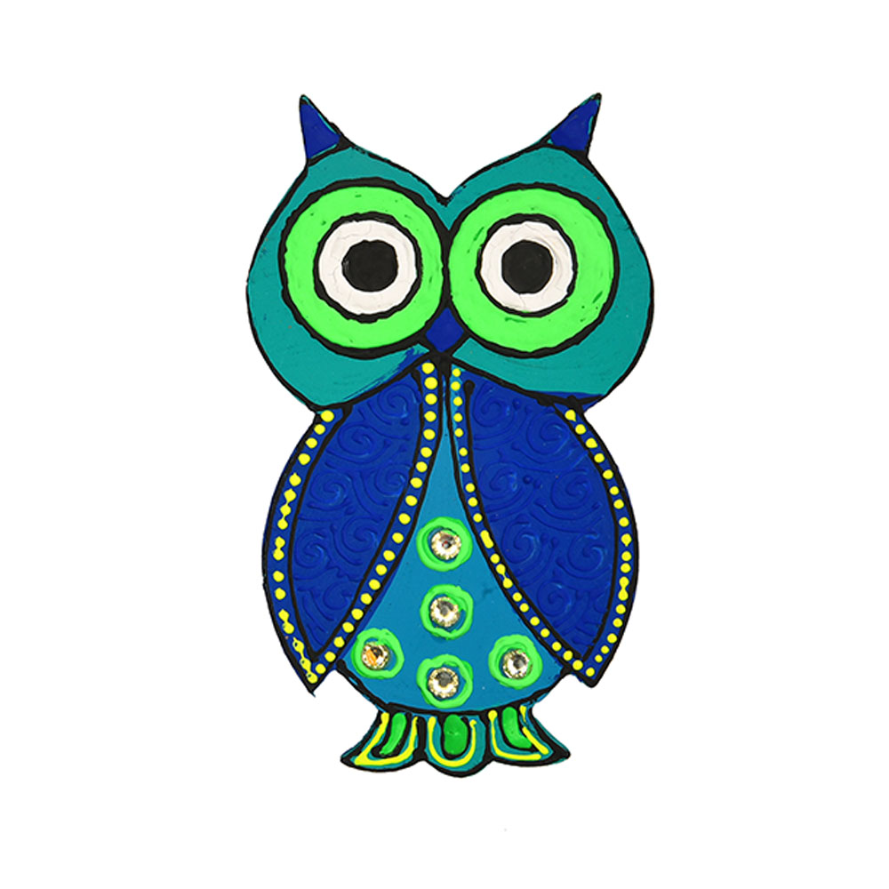 This decorative magnet features a seated owl form shaped through traditional hand techniques. Prominent eyes and patterned surface work give it a distinctive personality while maintaining a balanced handcrafted aesthetic.