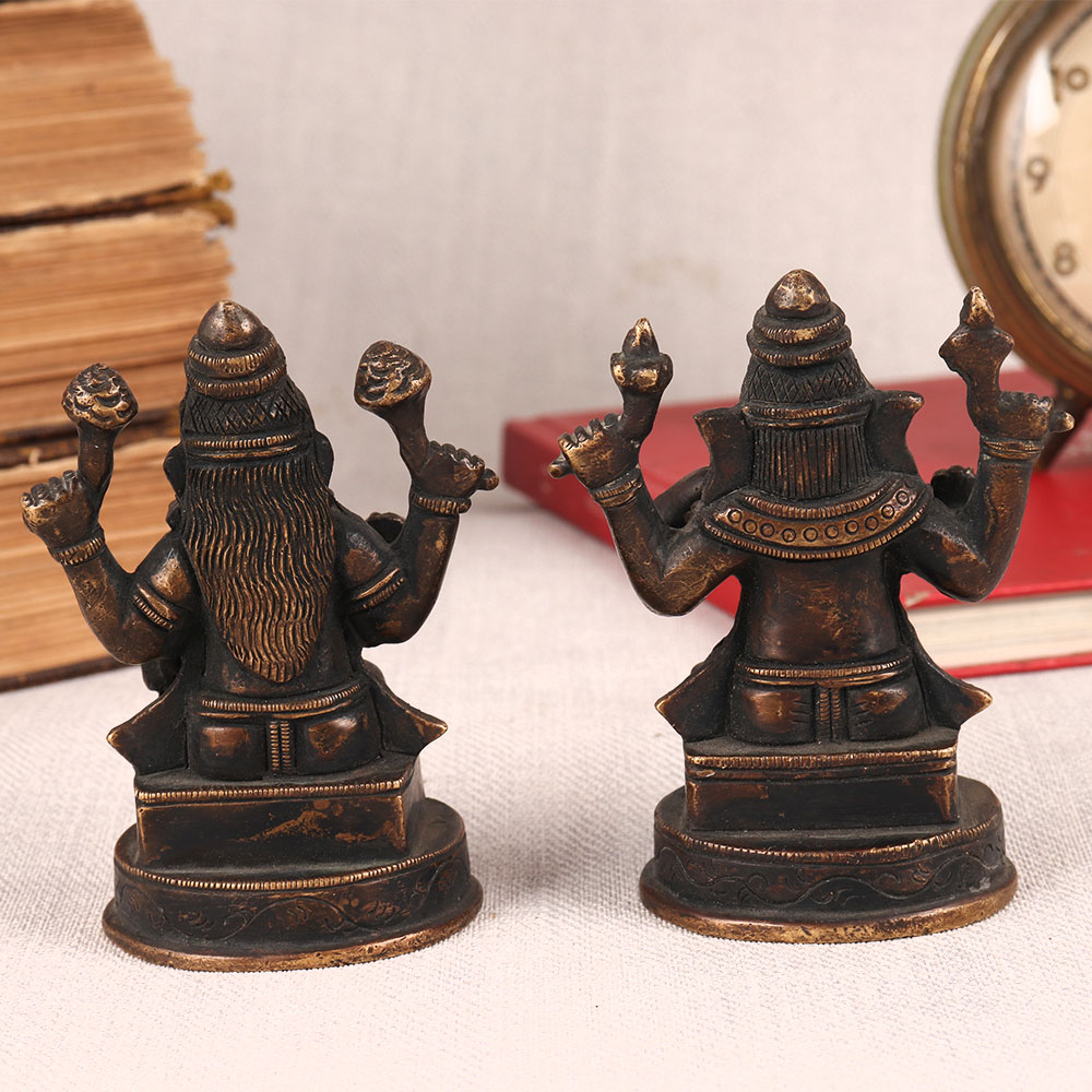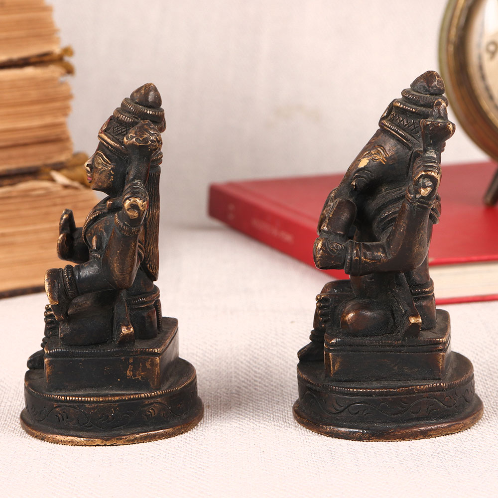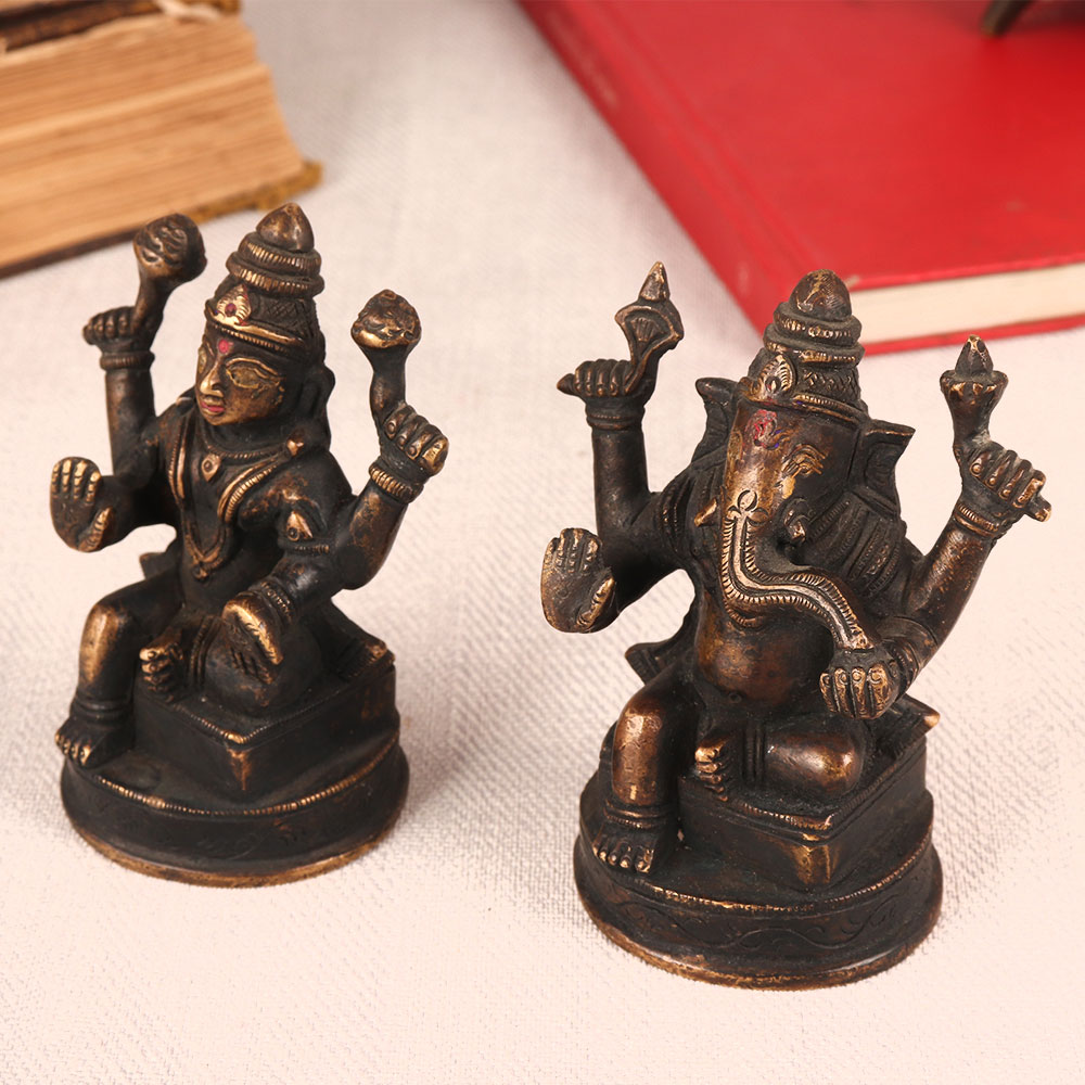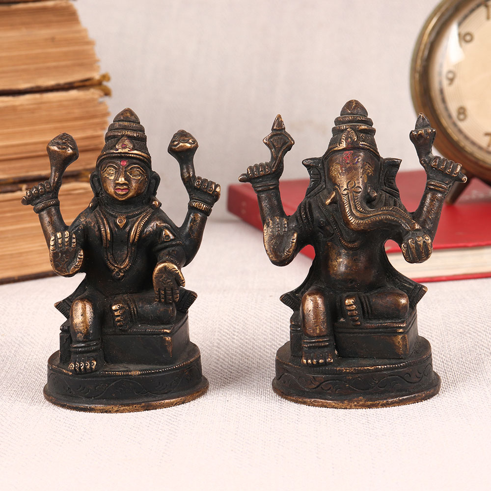 Two vintage brass statue featuring Lord Ganesha and Goddess Lakshmi each, seated gracefully on a meticulously crafted platform, adorned with an antique brown finish. This piece is a testament to the skill and craftsmanship of Indian artisans, who have poured their hearts and souls into creating a symbol of divine beauty. Lord Ganesha, the remover of obstacles, and Goddess Lakshmi, the bestower of wealth and prosperity, come together in perfect harmony to bless your space. Their presence invokes a sense of serenity and abundance, making it ideal for homes, offices, restaurants, hotels, shops, cafes, or prayer rooms. This handcrafted masterpiece not only serves as a spiritual focal point but also doubles as a stunning decorative item. Its antique brown finish exudes a rustic charm that complements both traditional and contemporary aesthetics. Whether you're a vintage collector, an art enthusiast, or seeking an elegant addition to your exhibition, this brass pair will captivate all who behold it. Moreover, it makes for an impeccable gift for your family, friends or relatives on special, festive, or auspicious occasions, symbolizing your wishes for their prosperity and obstacle-free journey in life.