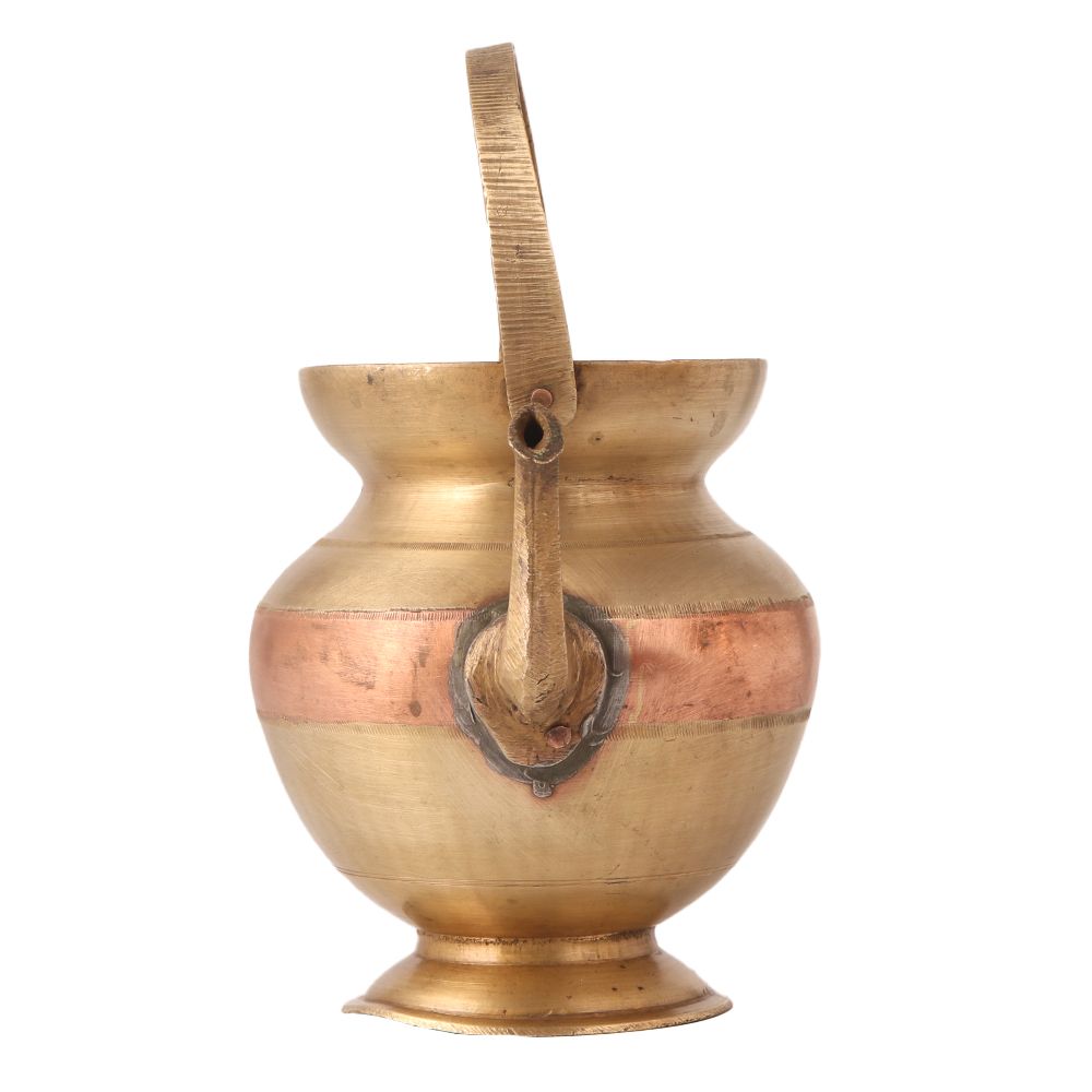 Buy a handcrafted brass kamandalu or water pot for sale online on our website. Kamandal or Kamandalam is an oblong shaped water pot used by saints to store holy water and distribute it after Pooja. In Hinduism, the water in the kamandal represents amrit, the elixir of life. It is made of high quality brass and covered with copper in the center, which is why it is also known as the Ganga Jamuna water pot. Place this incredible piece in a museum, exhibition or in your vintage art collection. This water pot will add an ethnic touch to the interior of your home, office or hotel. A promising gift for housewarming, anniversary, wedding, birthday or auspicious function to your near and dear one.