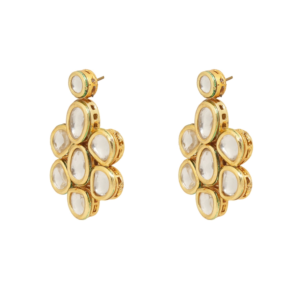 These handcrafted stud earrings feature a symmetrical cluster of kundan stones in a geometric floral layout, offering a harmonious blend of tradition, structure, and modern simplicity.