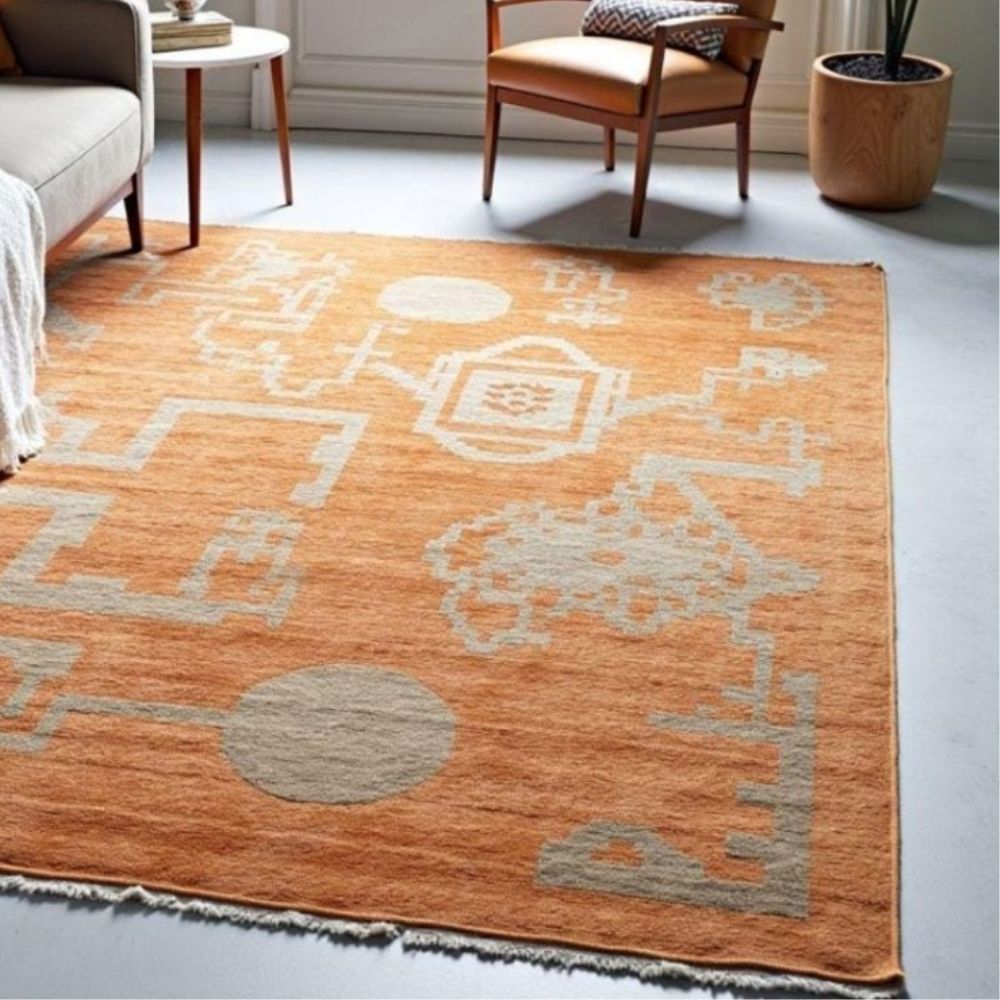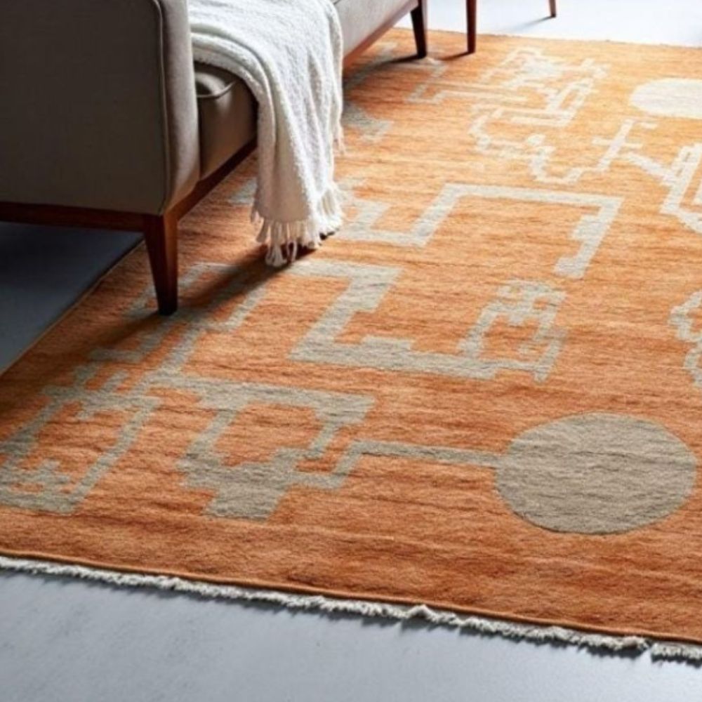 Make a bold design statement with this hand knotted modern abstract wool rug, featuring an intricate interplay of geometric shapes and artistic patterns in a warm orange and soft beige palette. The unique layout blends circles, angular forms, and traditional-inspired motifs, resulting in a rug that is both visually striking and deeply versatile. Wools insulating properties keep your space cozy, while the hand-knotted construction ensures a high-quality, heirloom-worthy piece built to last for generations. The vibrant orange base brings warmth and energy to your home, while the beige pattern adds a sophisticated, grounding element. This fusion of bold color and neutral detailing makes it an excellent fit for a variety of stylesfrom modern and contemporary to bohemian and eclectic interiors. Whether used as a focal point in your living room, under a coffee table, or in an office lounge, it instantly elevates the rooms ambiance with texture, color, and personality. Key Features: Material: 100% Hand Knotted Wool Design: Modern Abstract with Geometric Shapes Colors: Warm Orange & Soft Beige Durability: Long-lasting and naturally stain-resistant Soft Texture: Comfortable and inviting underfoot.