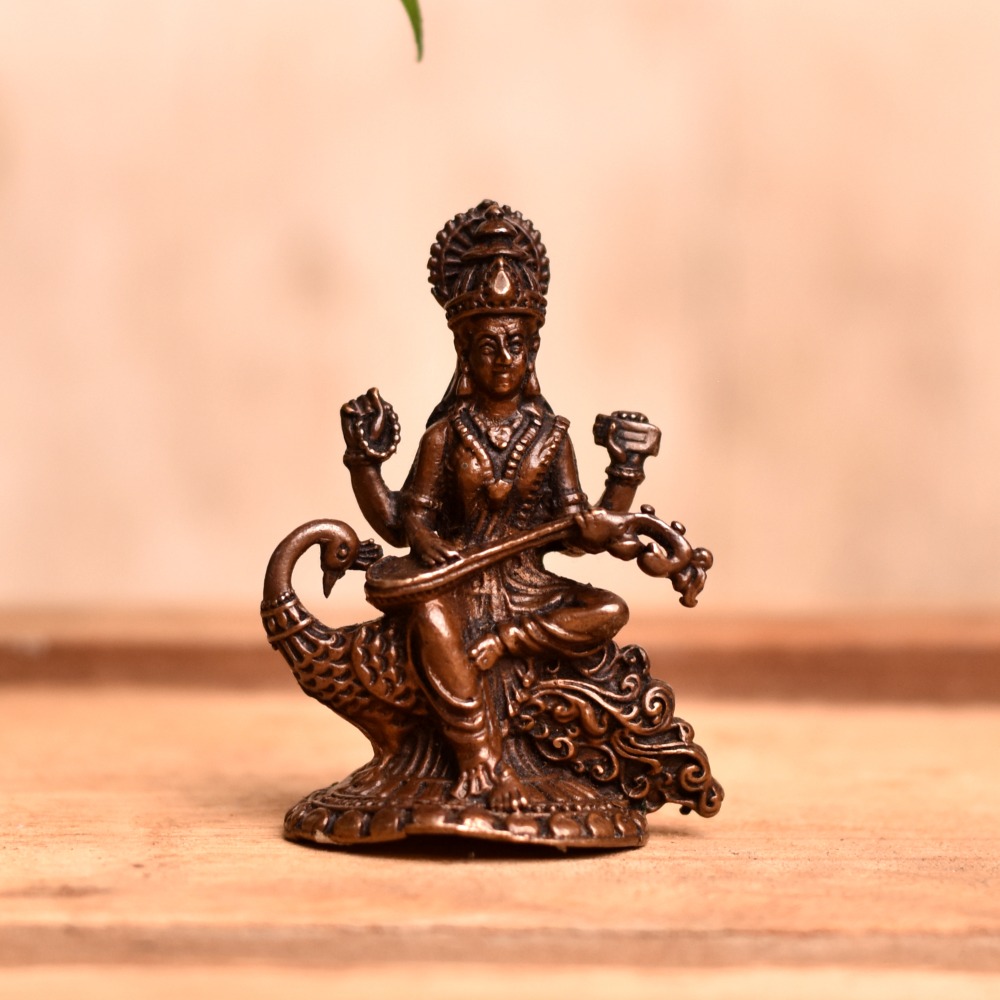 A stunning handmade copper statue of Goddess Saraswati that is a masterpiece of skilled Indian artisans, and is the perfect addition to any prayer room, temple, or home. The intricate details of the statue make it a unique and valuable piece of art, with the goddess seated on her vahana swan and playing her musical instrument, the veena. Copper is considered to be an auspicious metal in India, making this goddess Saraswati murti even more special. Worshipped in many Indian temples, the statue can also be placed in a home temple, office, restaurant, hotel, cafe, or shop. Its beauty and elegance will surely inspire and add a sense of divine presence to any space. This god statue is not only a beautiful piece of art, but it is also a meaningful and thoughtful gift for loved ones on special or festive occasions. With the convenience of buying a Goddess Saraswati idol online, you can easily purchase this statue and enjoy the blessings of the goddess in your home or workspace.