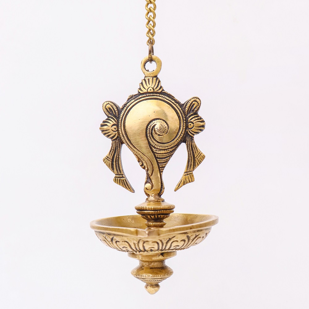 This artistic handmade golden brass hanging diya with a chain can be used to decorate the living room, pooja room, foyer, altar, meditation room, entrance to your home and office during Diwali or other festivals.