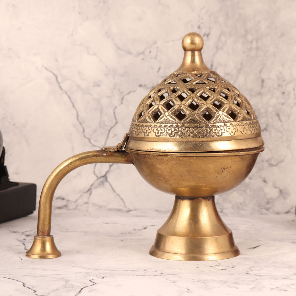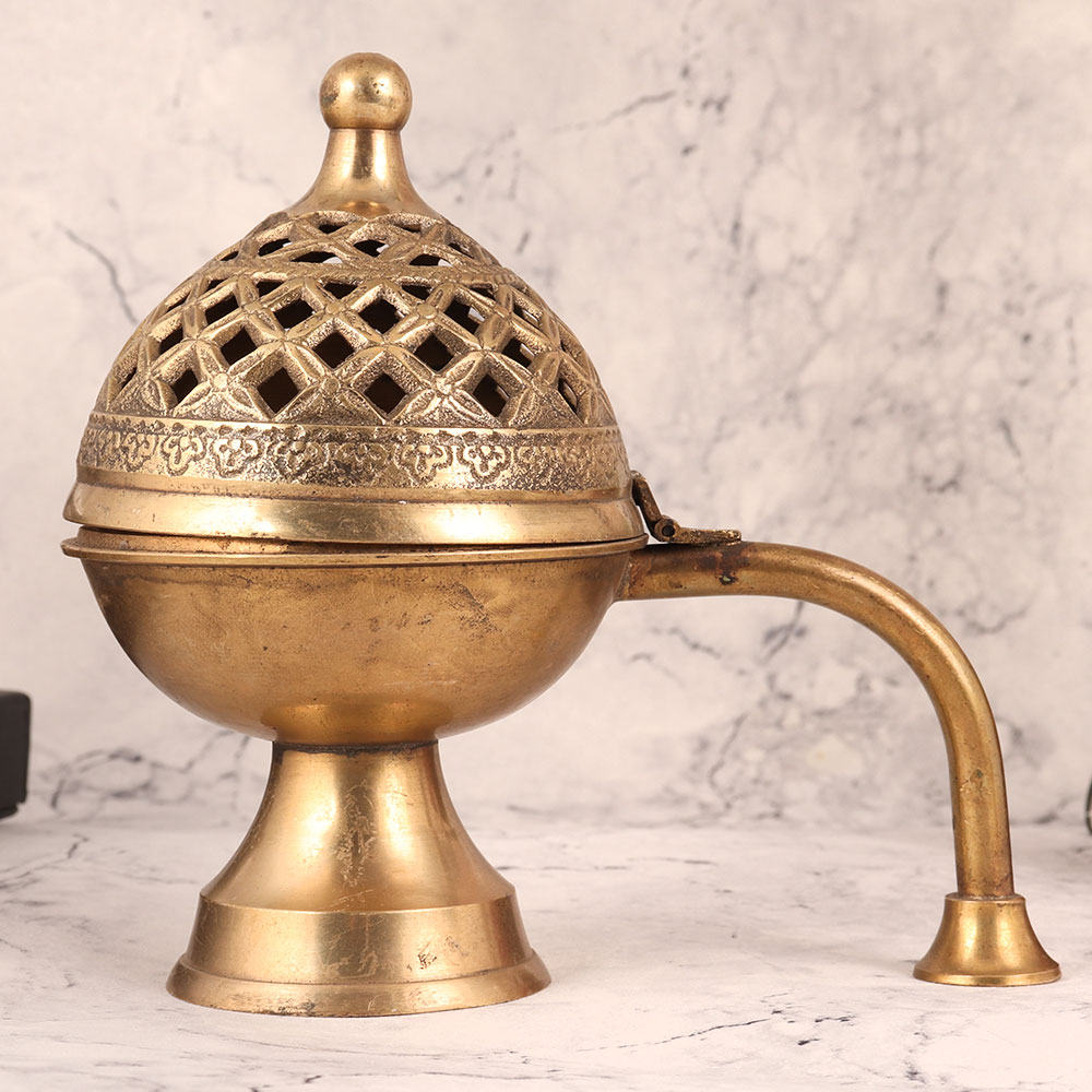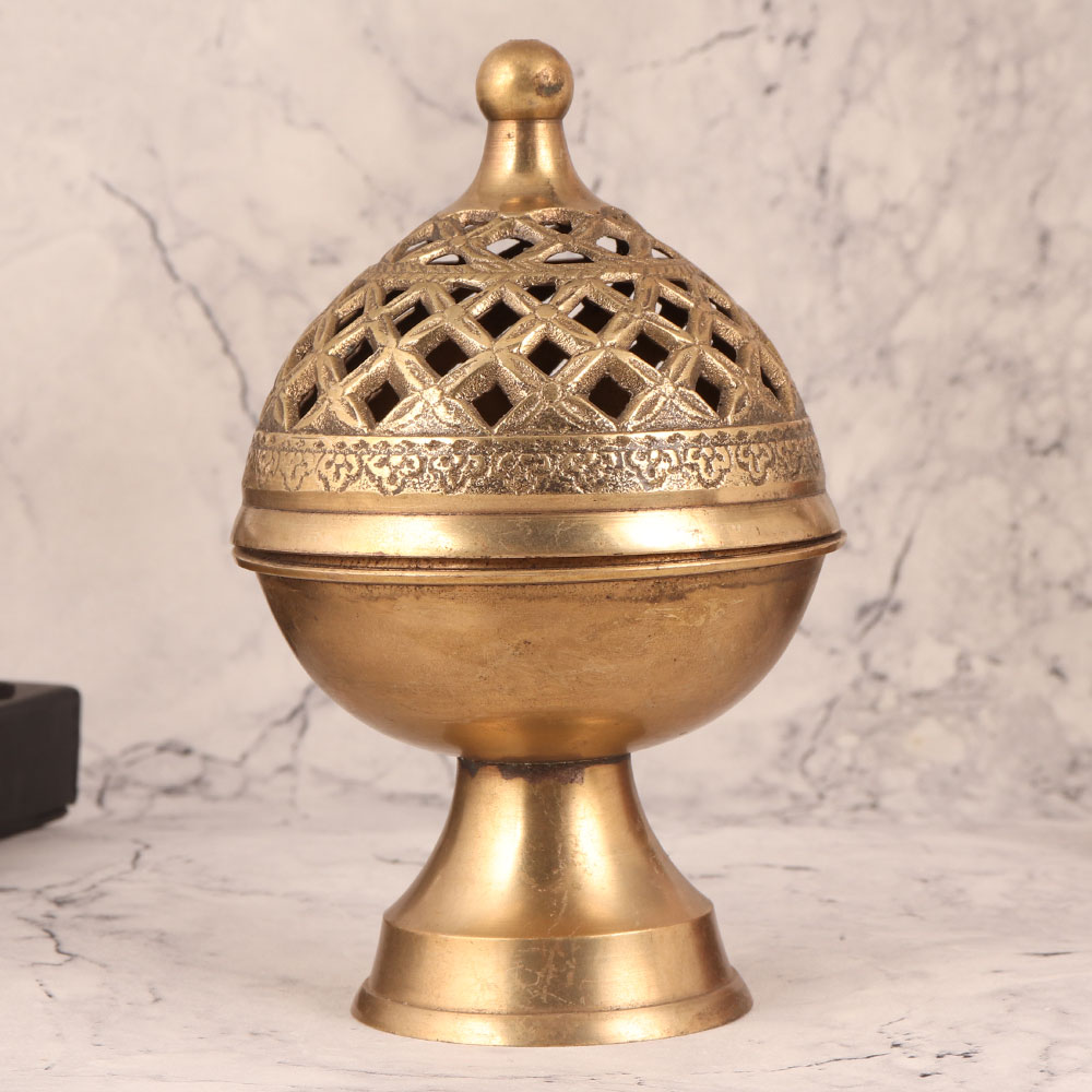 Enhance your surroundings with the exquisite beauty of this Brass Incense Burner. This magnificent piece is adorned with an antique golden finish and carved with intricate jali work, is a testament to the unmatched craftsmanship of skilled Indian artisans. Handcrafted from premium quality brass, this incense burner is a versatile addition to any setting. Place it in your home, office, restaurant, hotel, cafe, or shop to infuse your space with an aura of serenity and charm. Its versatility shines through as it effortlessly transforms into an incense, dhoop (incense cone), or loban burner (resin incense), filling your space with the soothing scents of your choice. For collectors, this piece is a true gem, a valuable addition to your vintage collection that tells a story of timeless artistry. It's also a thoughtful gift option for your family, friends or relatives on special, festive, or auspicious occasions, imparting a sense of tradition and spirituality.