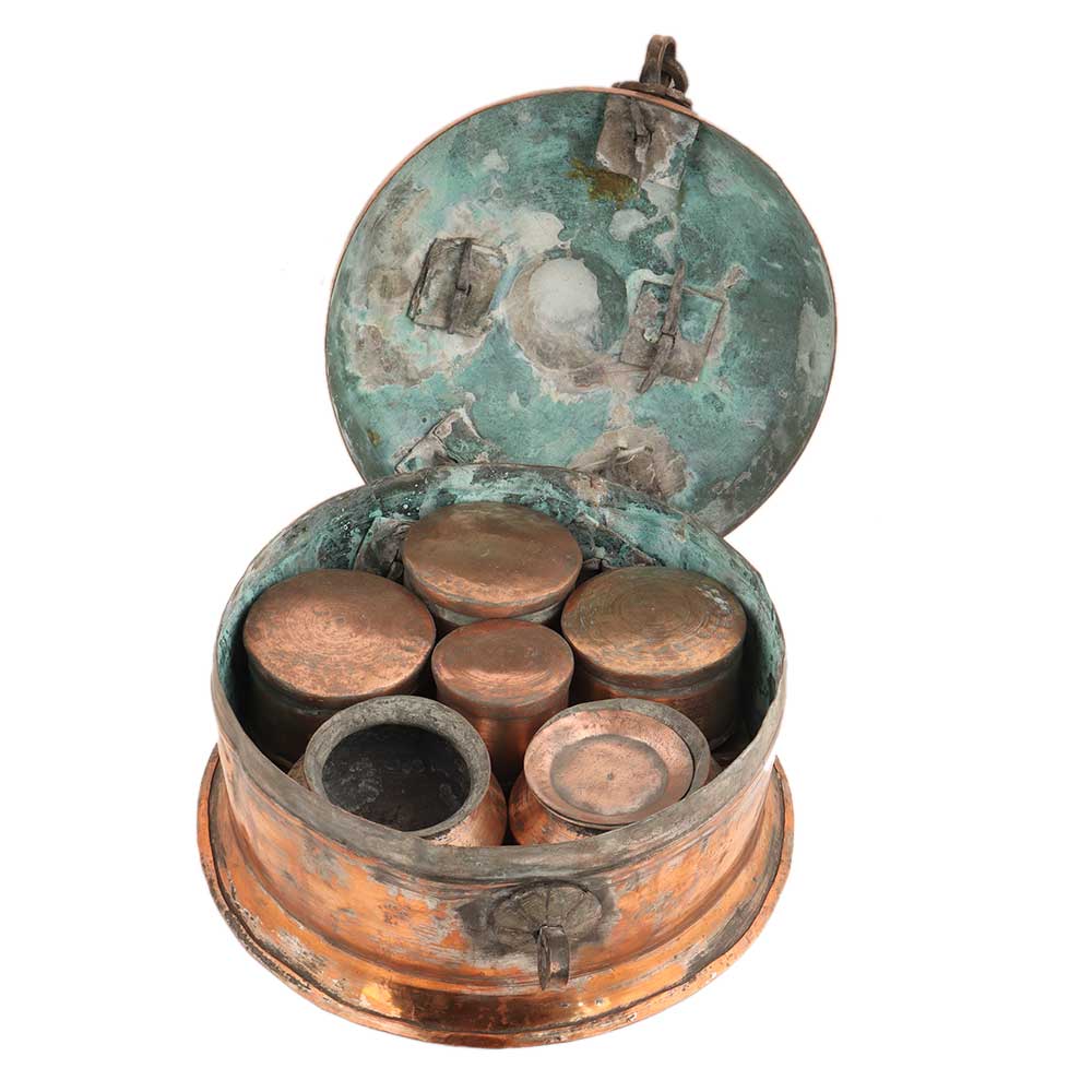 This is an old brass multipurpose storage box or jewelry with dome shaped lid ad handle . It is an exquisite work of craftsmanship and can be used for gifting or for your own collection.