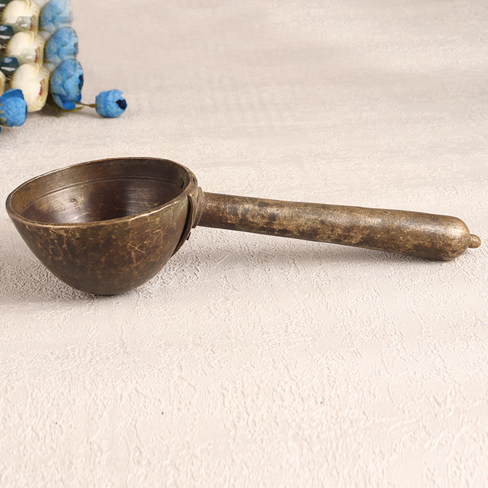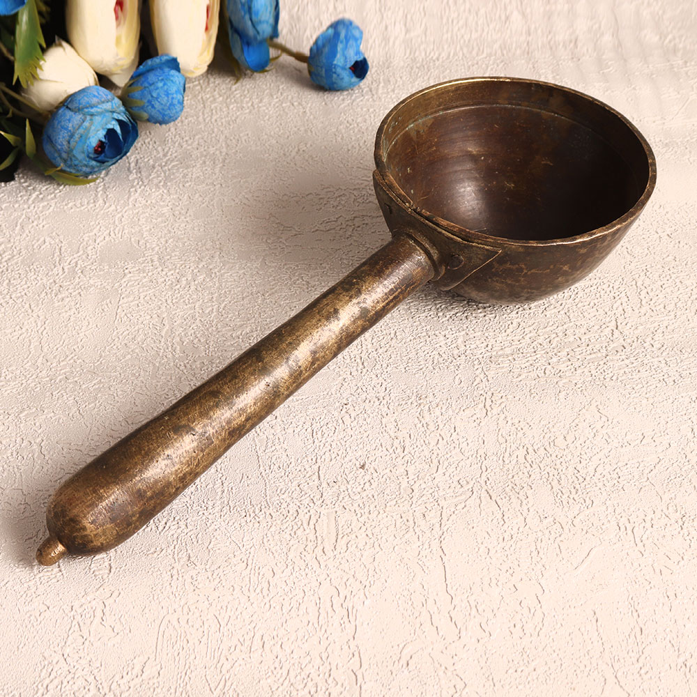 Enhance your decor with a touch of timeless elegance by adding this Vintage Brass Holy Spoon to your collection. Crafted with precision and care by highly talented Indian artisans, this piece showcases the rich heritage of traditional craftsmanship. The spoon features an antique brown finish and is a testament to the mastery of these artisans. Handmade from high-quality brass, this ornate spoon serves multiple purposes. Its versatility allows it to be a striking decorative piece in your home, office, hotel, cafe, shop, or restaurant. Its intricate design and historical appeal make it a captivating addition to any space. For those seeking spiritual significance, this holy spoon is ideal for havan ceremonies, adding a sacred touch to your rituals. Moreover, it's a splendid addition to any vintage collection, and its unique charm can be showcased at exhibitions, serving as a conversation piece. This Vintage Brass Holy Spoon also makes for a thoughtful and cherished gift, perfect for your family, friends or relatives on special, festive, or auspicious occasions.