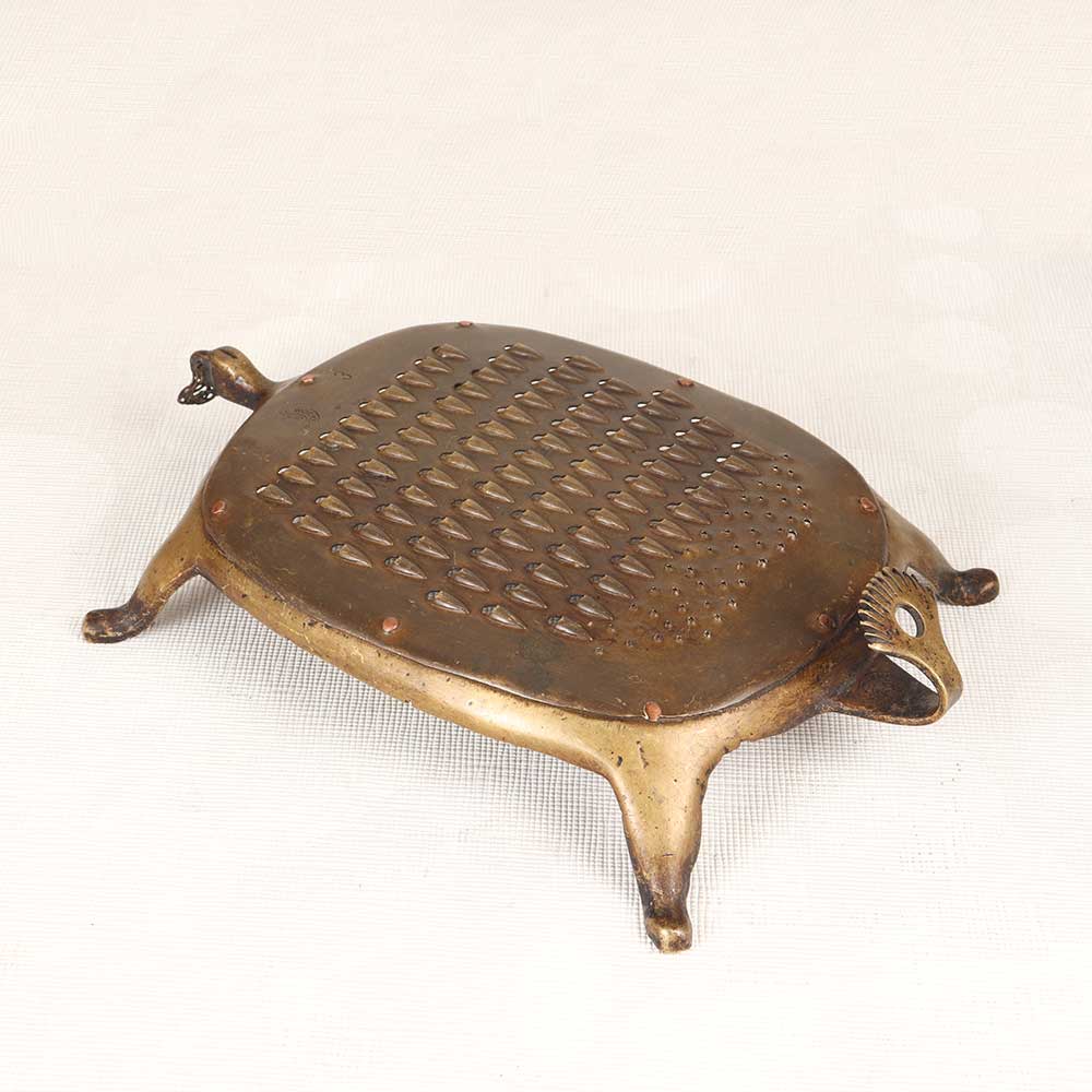 Add a touch of vintage charm to your kitchen with this antique brass vegetable grater from Gujarat Art. While no longer functional, its distressed brass body and intricate etchings provide vintage appeal. Once an essential kitchen tool, this grater's sturdy brass construction allowed cooks to freshly grate vegetables, cheeses, chocolate, and more. Now, its etched surface and aged patina tell a story of loving use in days past. This decorative accent piece is ideal for vintage design lovers. Place on your kitchen counter or shelf to infuse your space with old-world character and charm. Its nostalgic style acts as a distinctive conversation piece for any decor. Cooks, antique collectors, and design enthusiasts will all appreciate this unique vintage decor item. While it can no longer assist in food preparation, it remains a beautiful relic. Display in your home to add a touch of aged charm and artistry.