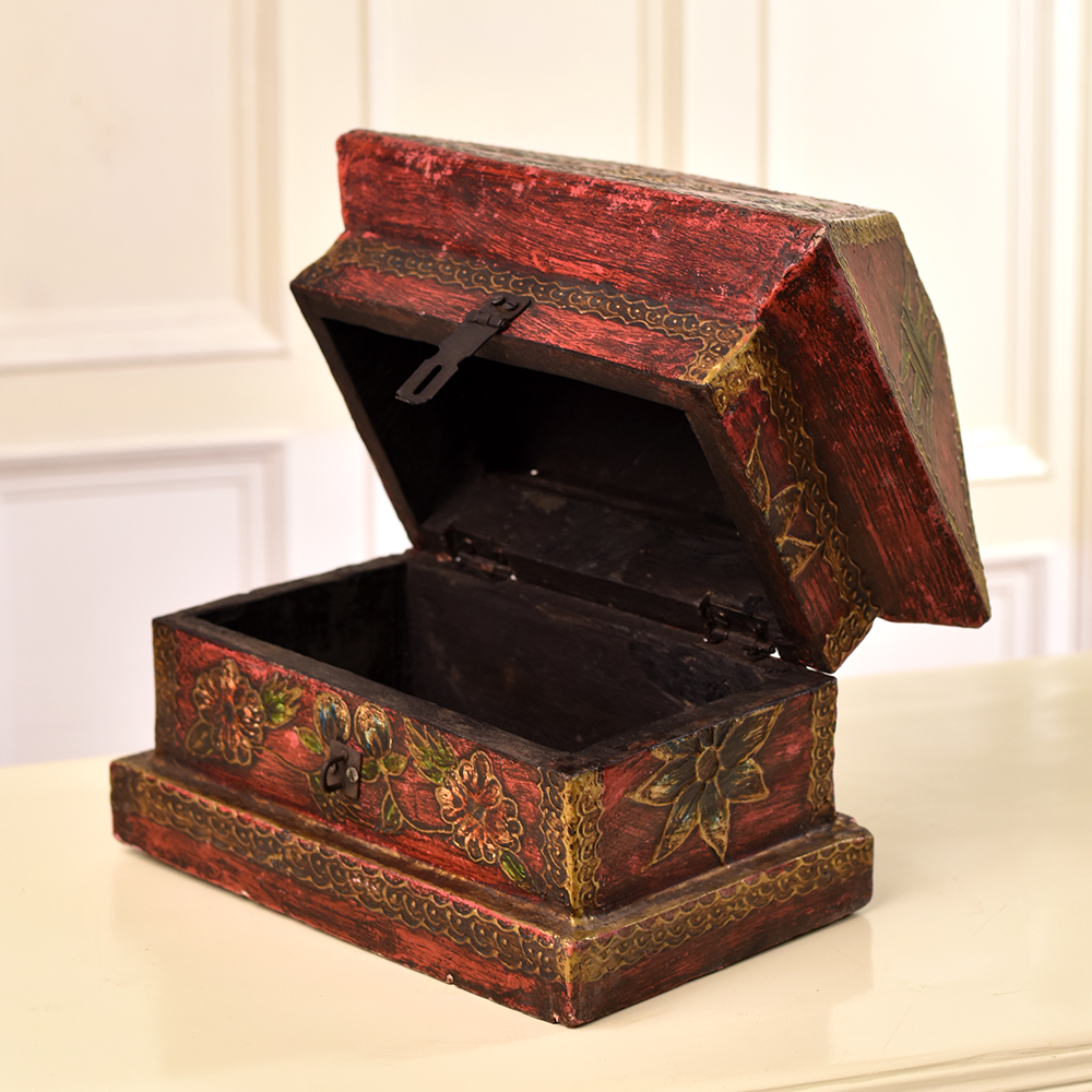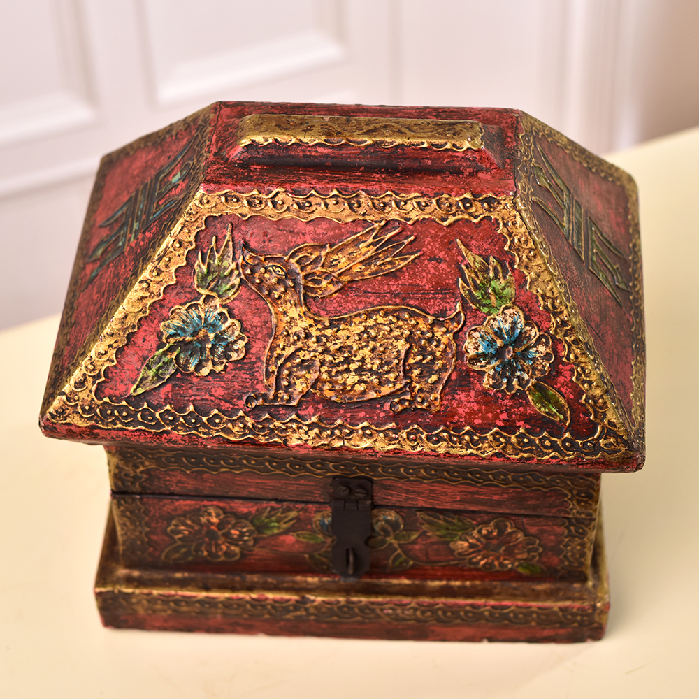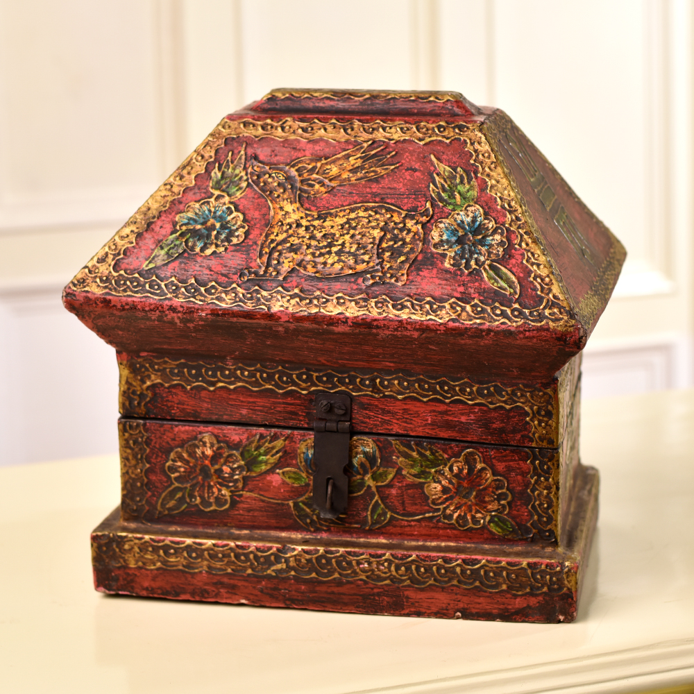 Buy a handmade wooden box online which is a testament to the skillful artistry of Indian craftsmen. Crafted from premium-quality wood, the box boasts a rich tapestry of animal and floral engravings, each stroke telling a story of tradition and precision. The vibrant, multi-coloured palette adds a touch of whimsy, making it a visual delight. Equipped with a charming latch, this box is not only a repository for your cherished jewelry but also a home for small trinkets and treasures. Its versatility extends beyond practicality - it's a piece of art that begs to be showcased. Picture it adorning your dressing table or stealing the spotlight at an exhibition, capturing attention with its intricate details. As a gift, this box transcends the ordinary. Delight your family, friends or relatives on special or festive occasions with a token of artistry and tradition.