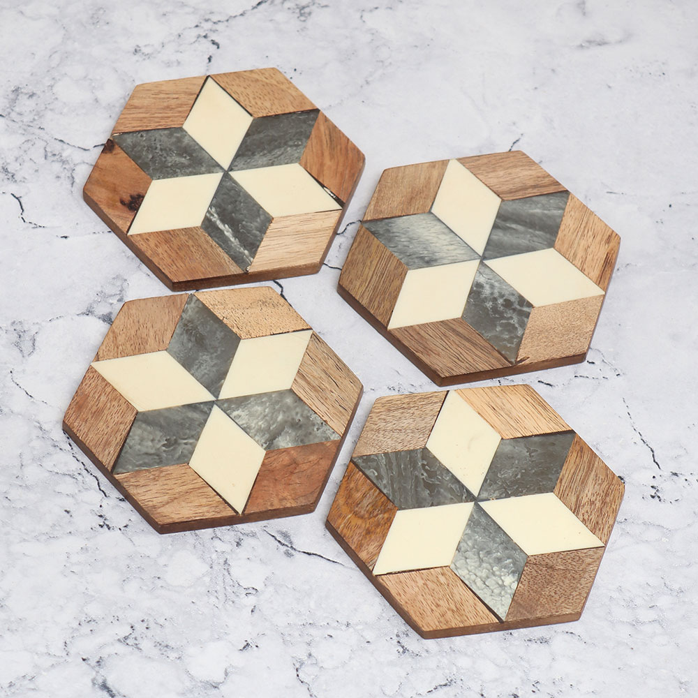 A beautiful Pack of 4 wooden coasters that is meticulously crafted from high-quality wood by talented artisans in India. These coasters boast a unique hexagonal shape, designed to add an elegant touch to any table setting. Each coaster is carefully handcrafted, ensuring exceptional craftsmanship and attention to detail. With a captivating grey and brown coloured pattern and an antique finish, these coasters serve not only as practical drink holders but also as stunning decorative pieces for your home or office. Protect your surfaces from unsightly stains caused by water, tea, juice, or coffee glasses with these best wooden coaster sets. Whether at home, office, restaurant, hotel, or cafe, these coasters provide a stylish solution to prevent any liquid spills from marring your furniture. They also make for a thoughtful gift for your loved fours on special or festive occasions, showcasing the rich cultural heritage of Indian craftsmanship.