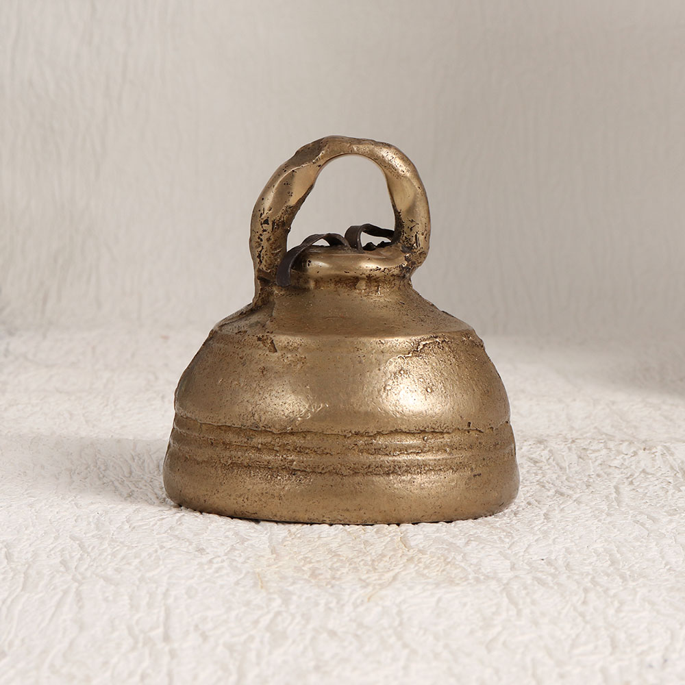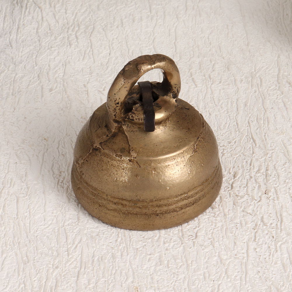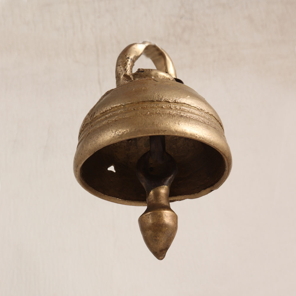 A Vintage Bell Metal Bell with a hanging loop that showcases an enchanting antique brown finish. Crafted by skilled Indian artisans in the renowned Himachal Art tradition, this bell embodies the rich heritage of bell metal craftsmanship. Constructed using high-quality bell metal, this bell resonates with a melodious chime that adds a touch of serenity and elegance to any space. Its versatility knows no bounds, it's perfect for adorning your home, office, restaurant, hotel, cafe, or shop prayer room. Place it by your entrance for a warm welcome or hang it in your prayer room to create a tranquil ambiance during your moments of reflection. This exceptional piece isn't just a decor item, it's a cherished artefact that can grace your vintage collection or become the centerpiece of your exhibition. As a thoughtful gift, it carries a touch of tradition and spirituality, making it a meaningful gesture for your family, friends or relatives on special, festive, or auspicious occasions.