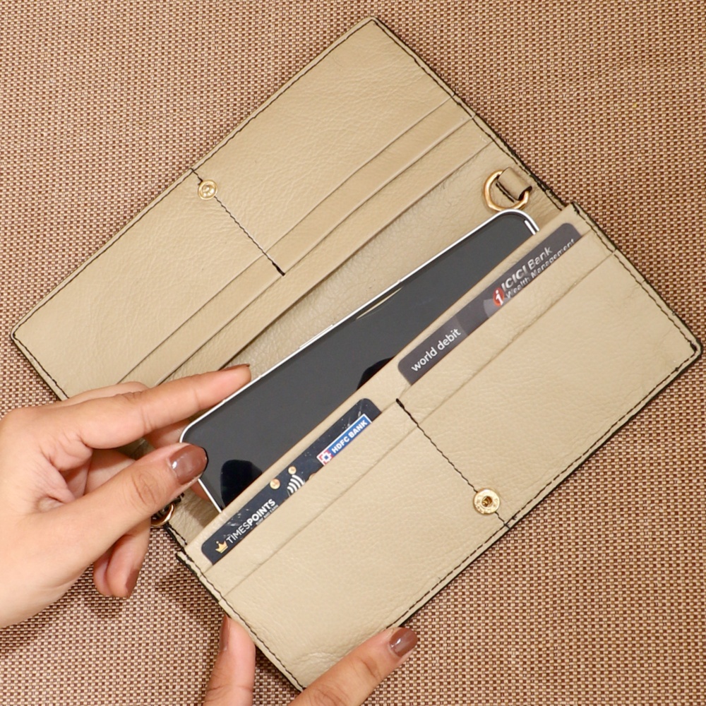 Crafted from amazing Honey Dew leather, it features a snap button closure for secure storage, this sleek wallet features 10 card slots for all your essentials, a currency slot to keep cash neatly tucked away, and even a mobile pocket for added convenience. Plus, with its adjustable and detachable sling, you can effortlessly transform it into a compact crossbody, perfect for hands-free wear.
