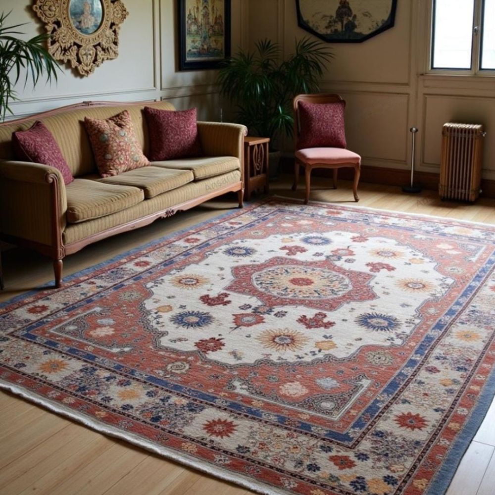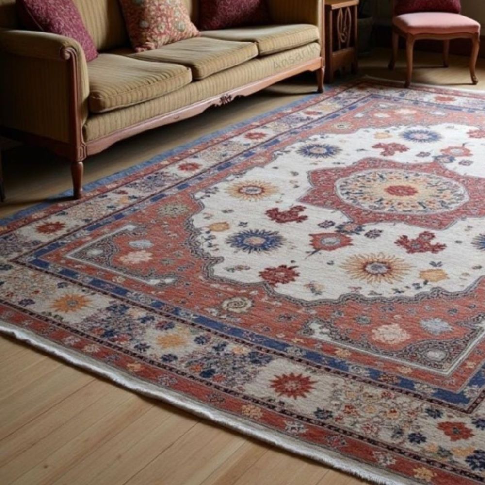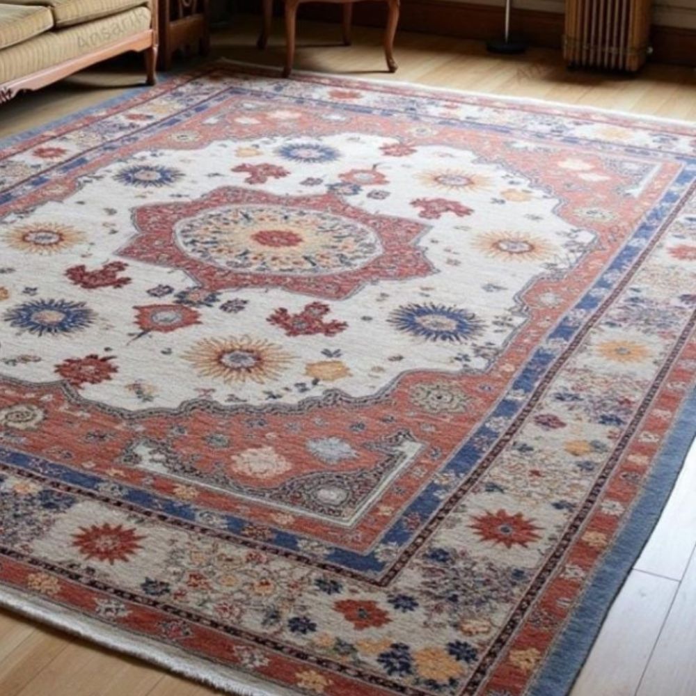 Elevate your space with this stunning handmade wool rug, intricately designed in a Persian-inspired floral medallion pattern. Featuring rich tones of terracotta red, ivory, deep blue, soft gold, and hints of maroon, this rug seamlessly blends traditional artistry with timeless elegance. Due to its handmade nature, slight variations may occur, making each piece truly one of a kind. As it Appears Pack of One Piece.
