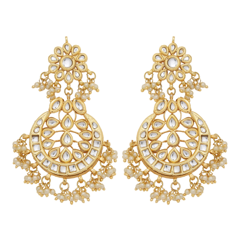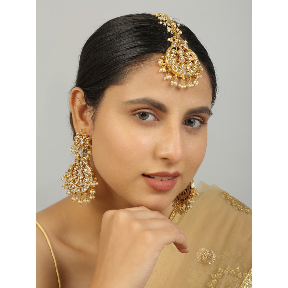 The crescent-inspired kundan motifs paired with pearl clusters create a refined yet celebratory aesthetic.