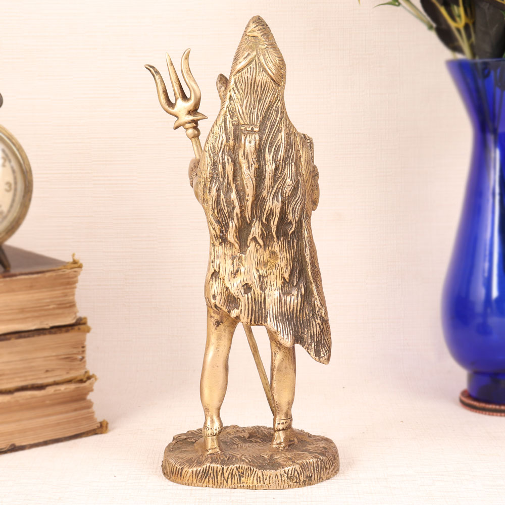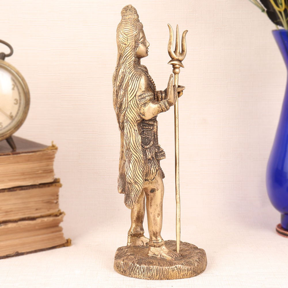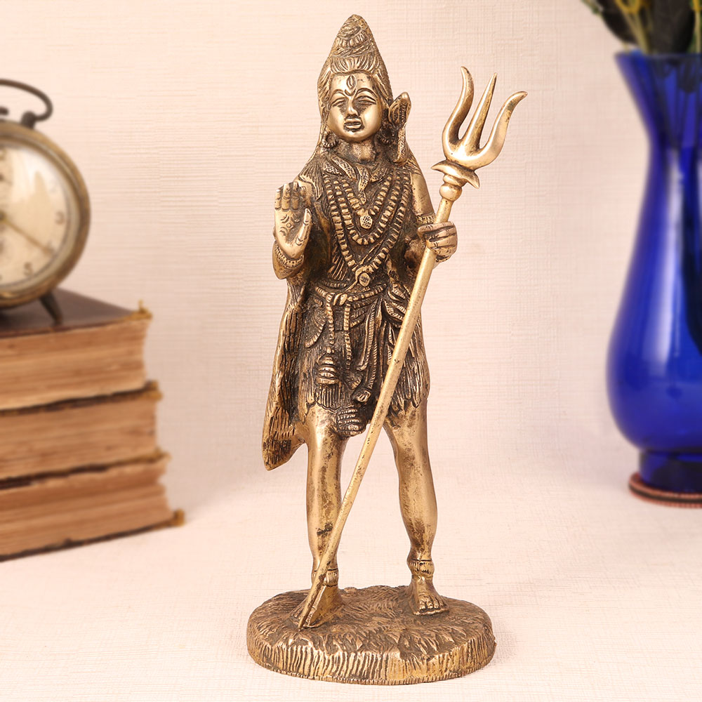 Enhance your decor with the timeless grace of our vintage brass statue of Lord Shiva. This exquisite masterpiece is handmade by highly talented Indian artisans, embodies the essence of Himalayan artistry. Standing majestically with his divine trident in hand, Lord Shiva exudes an aura of serenity and strength, capturing the very essence of this revered deity. Meticulously crafted from high-quality brass, the antique brown finish adds an aura of authenticity and character, making it a true collector's item. Whether you seek to adorn your home, office, restaurant, hotel, shop, or cafe's prayer room, this statue serves as a powerful symbol of spiritual energy and devotion. Lord Shiva, the lord of destruction and transformation in Hinduism, represents the cyclical nature of life. His presence can inspire introspection and a deeper connection to the divine. This stunning piece also finds its place as a decorative marvel, enhancing the aesthetics of any setting. Perfect for vintage collectors and a captivating exhibit at any event or exhibition, it tells a story of centuries-old craftsmanship. Furthermore, it makes for an unforgettable gift for your family, friends or relatives on special, festive, or auspicious occasions, carrying with it the blessings and symbolism of Lord Shiva himself.
