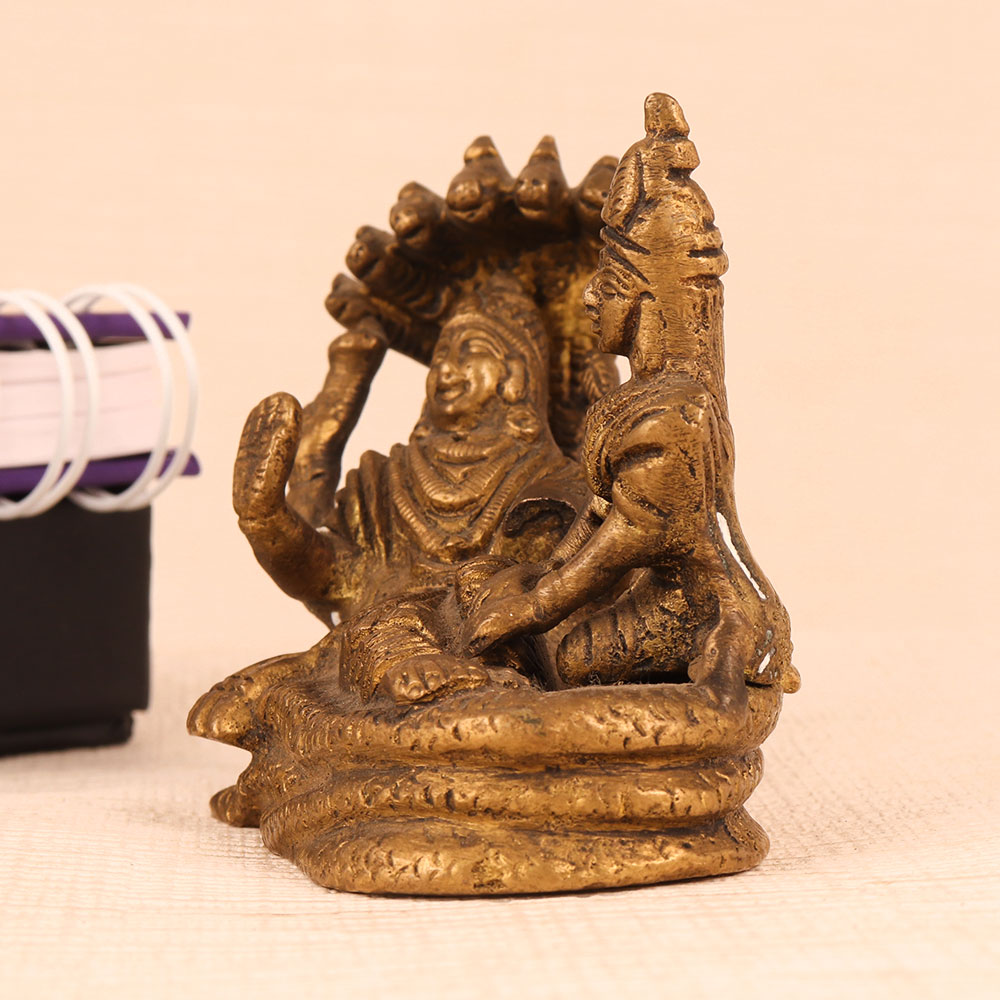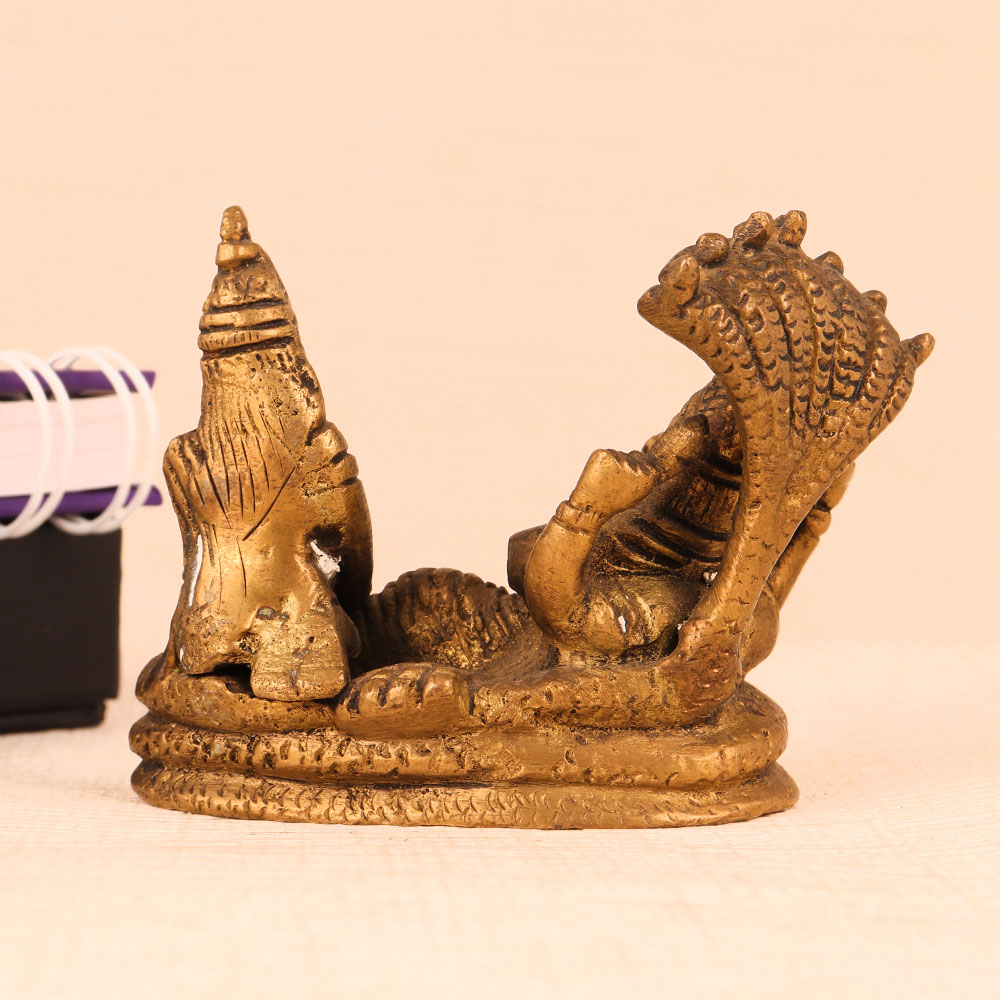 Enhance your living space with the exquisite presence of this stunning brass statue, a mesmerizing embodiment of Lord Vishnu resting on the divine serpent, Sheshnag, with the graceful Goddess Lakshmi by his side. Crafted with unwavering devotion by highly skilled and experienced Indian artisans, this masterpiece exudes a timeless charm with its antique brown finish. Made from high-quality brass, this intricately detailed sculpture captures the essence of Hindu mythology and craftsmanship. It serves as a profound symbol of peace, prosperity, and divine protection, making it a perfect addition to your home, office, restaurant, hotel, cafe, or shop's prayer room. Whether you seek a focal point for worship or an opulent piece of decor, this statue effortlessly blends spirituality with aesthetics. For collectors of vintage treasures, this brass masterpiece is a must-have addition to your curated collection, infusing an air of heritage and tradition. Moreover, it makes for an exquisite gift to cherish your loved ones on special, festive, or auspicious occasions, symbolizing your best wishes for their well-being and abundance.