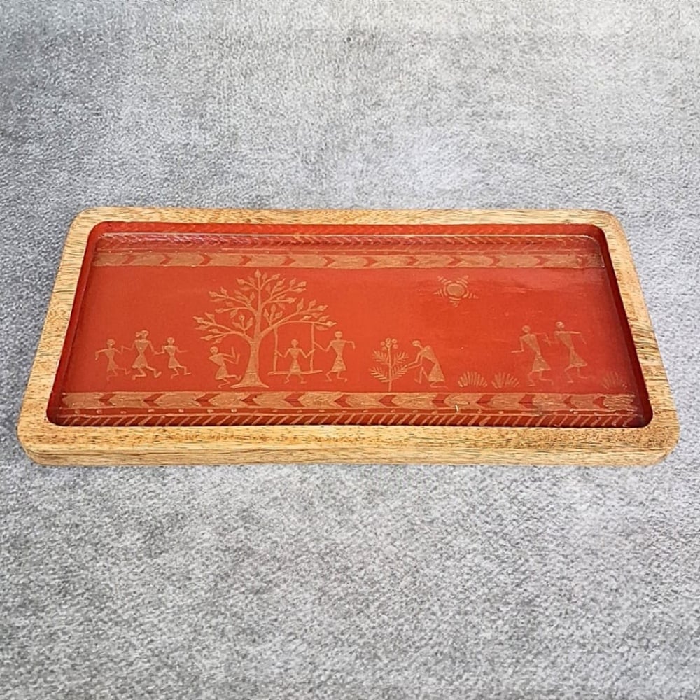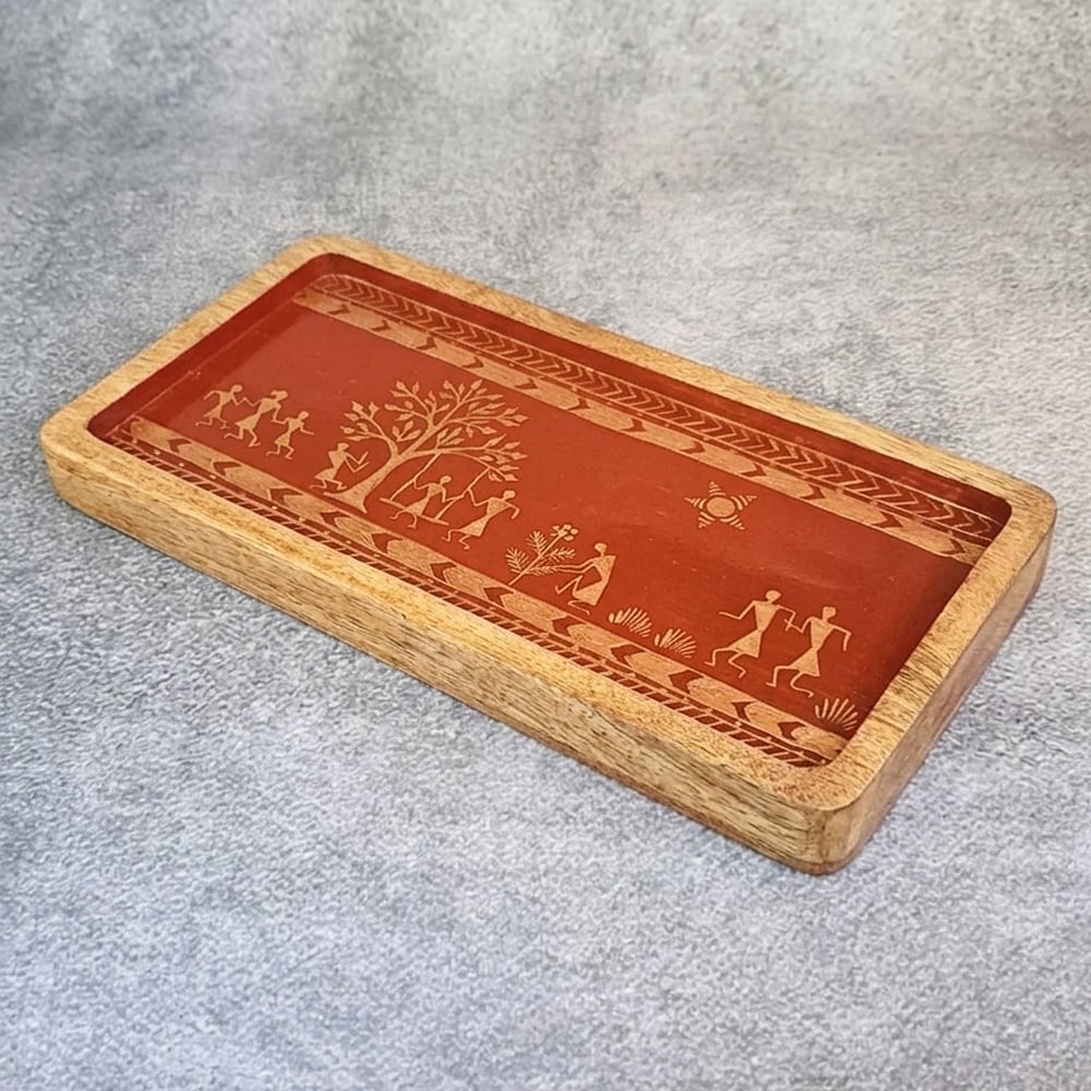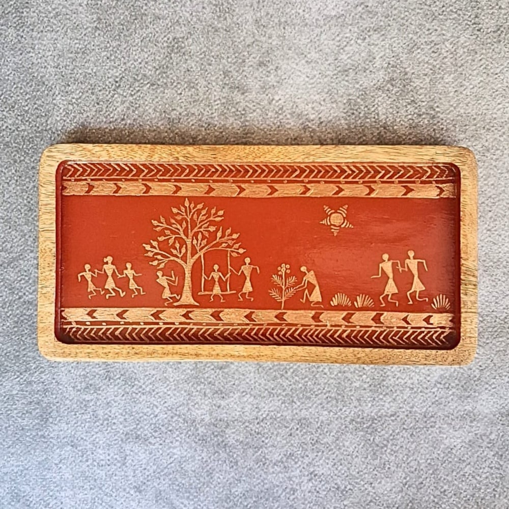This handcrafted mango wood Warli hand painted tray combines traditional tribal artistry with everyday functionality. Featuring intricate Warli figures on a rich earthy base, this tray brings a cultural and handcrafted charm to your serving and decor experience.