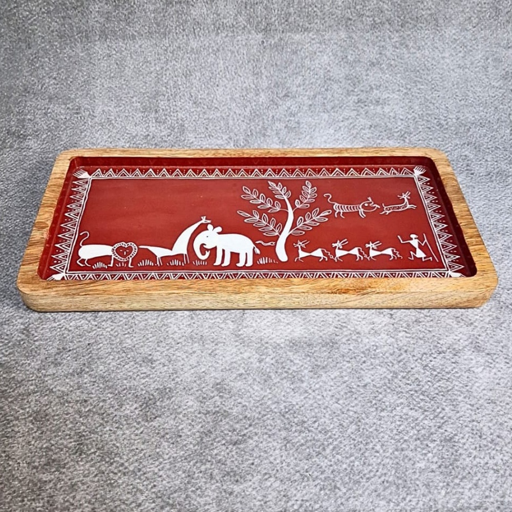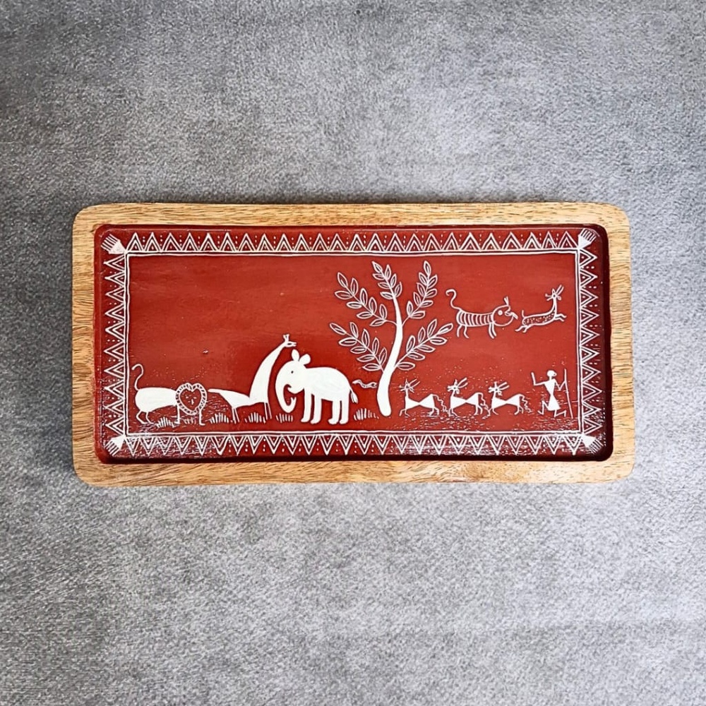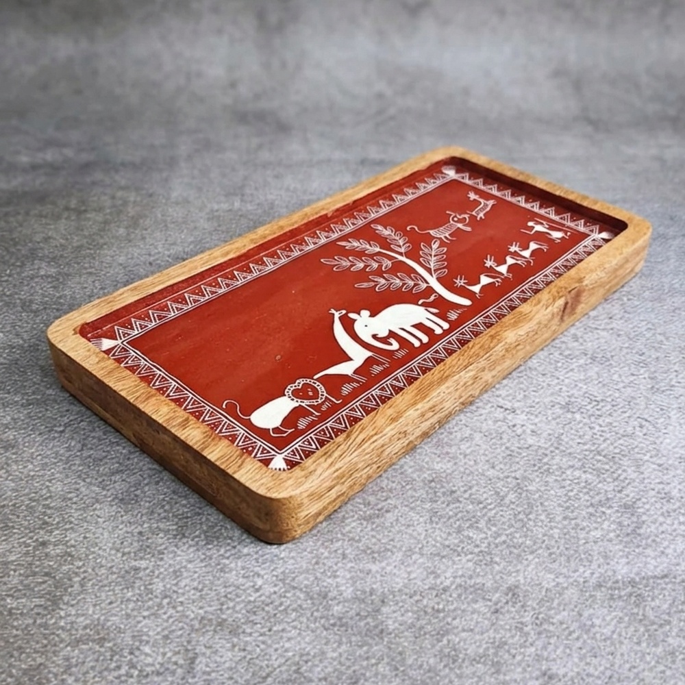 This handcrafted mango wood Warli hand painted tray features a rich red base with detailed tribal artwork inspired by traditional storytelling. The combination of natural wood and intricate hand painted motifs makes this tray a perfect blend of culture and functionality.