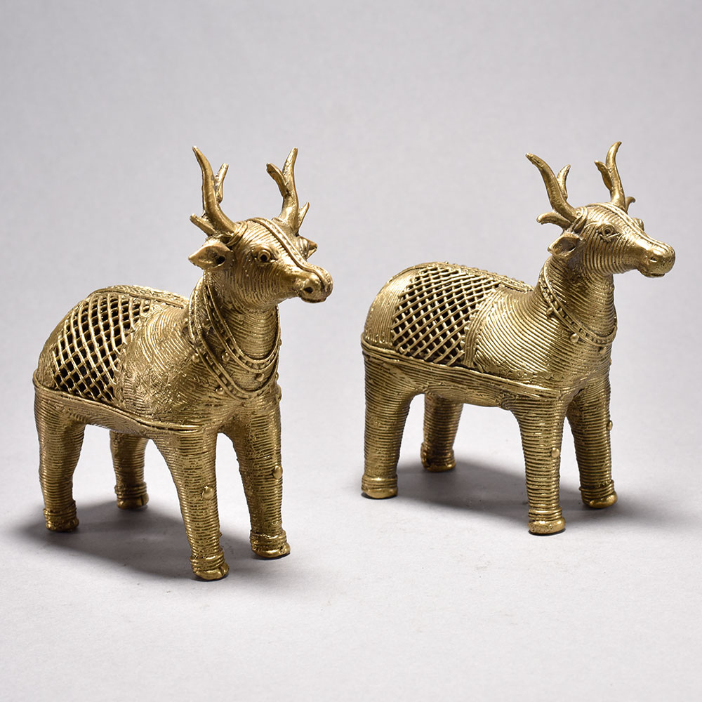 Bring home the timeless charm of traditional Indian craftsmanship with this beautifully handcrafted Metal Dhokra Deer Statue Pair. Made using the ancient lost-wax casting technique, each deer showcases intricate detailing and a stunning jali (lattice) pattern that highlights the artisans skill and cultural heritage. The warm brass-toned finish adds a rustic yet elegant appeal, making these statues perfect for both modern and traditional interiors. Ideal for living rooms, sideboards, office desks, entryways, or festive dcor, this Dhokra deer pair instantly uplifts the ambiance with its artistic presence. The statues represent harmony, grace, and prosperitymaking them an excellent gift choice for housewarmings, anniversaries, festive celebrations, or for collectors of tribal and ethnic art. Thoughtfully crafted by skilled tribal artisans of India, each piece is completely handmade, ensuring slight variations that enhance its uniqueness and authenticity. These statues are not just dcor items but meaningful pieces of art that bring cultural richness into your home. Durable, elegant, and visually striking, this Metal Dhokra Deer Pair is a true embodiment of traditional artistry blended with timeless design.