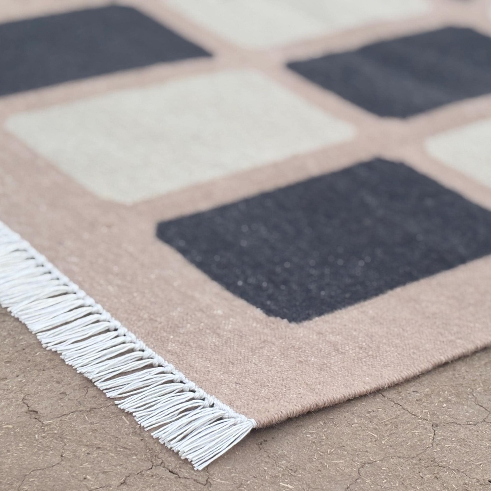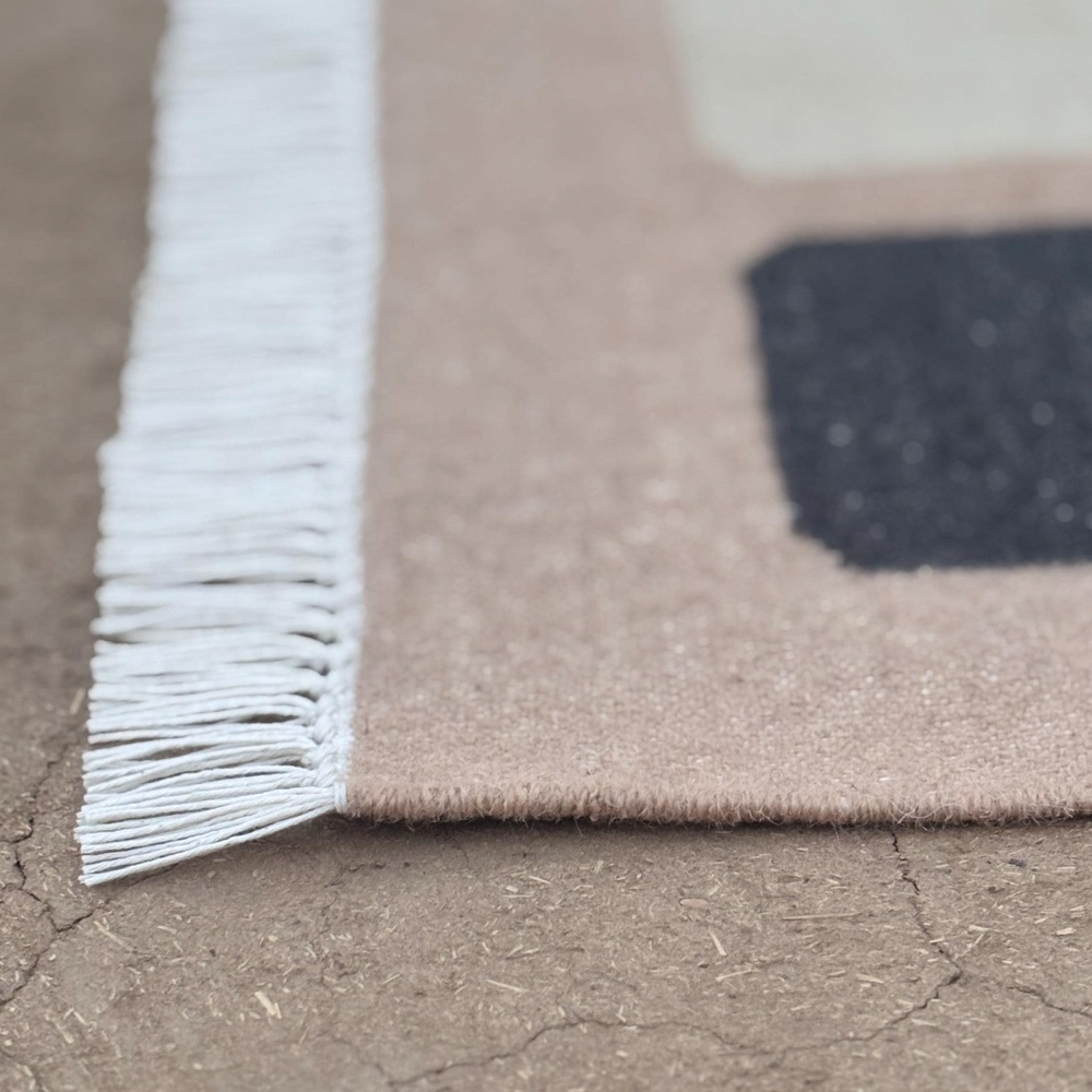 The pattern is distinctly minimalist, dhurrie, incorporating subtle tones of natural that add depth and character.