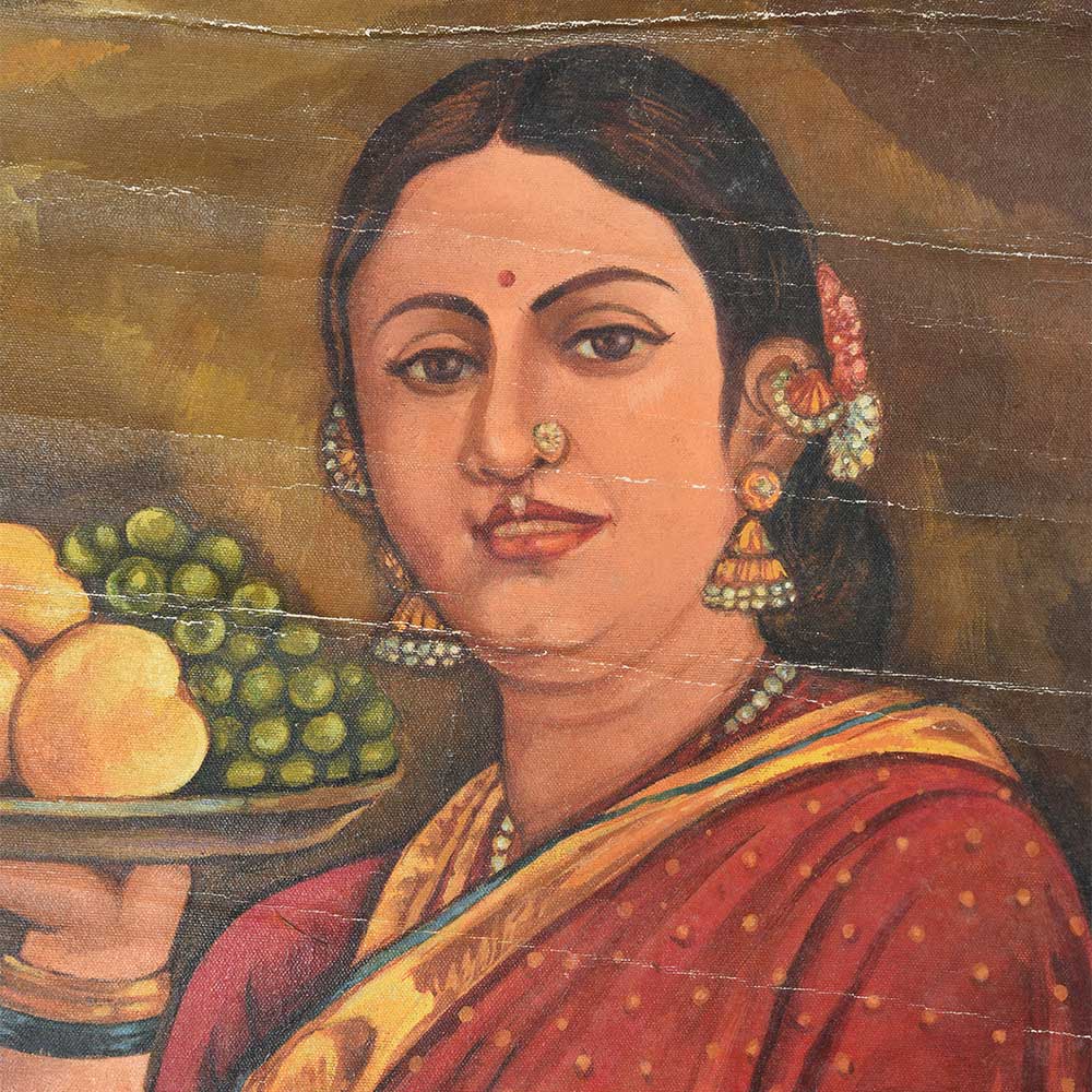A handmade Indian canvas painting of a woman holding a plate of fruit for upholstery, office decoration as a gift to friends and family for housewarming, weddings and other occasions.