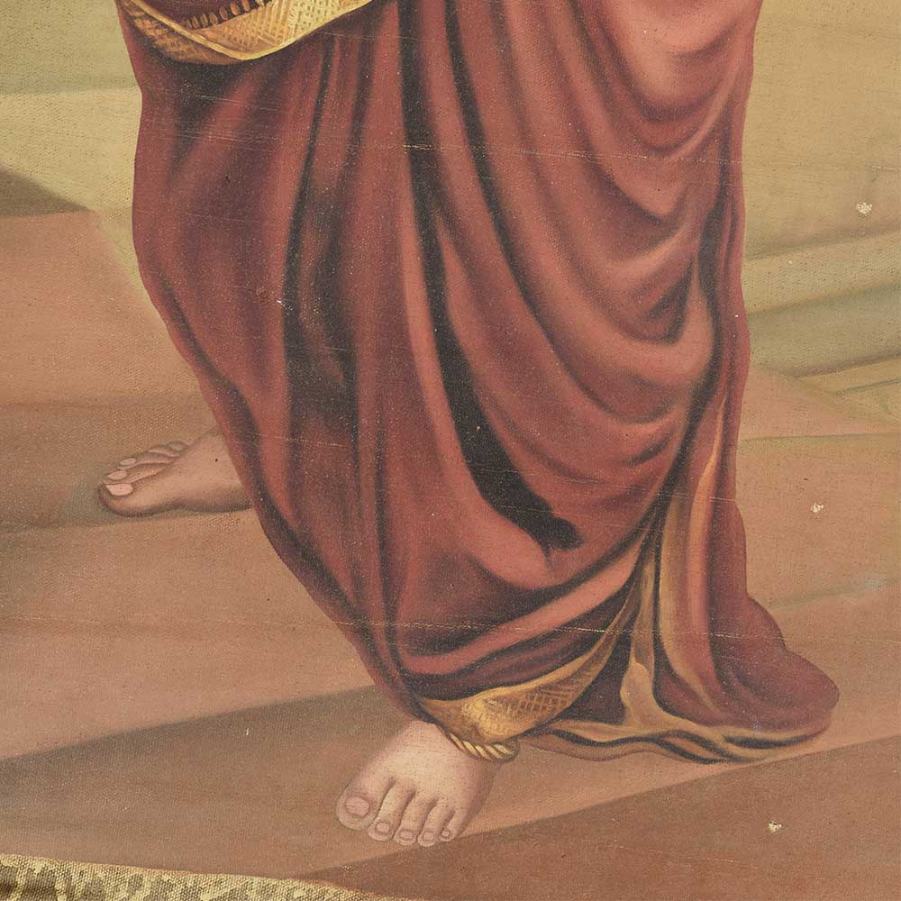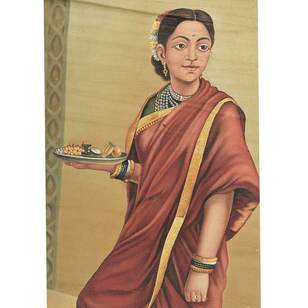 This colorful painting of a indian women going for puja in shiva temple. The lady has worn a nauvari sri with a floral garden tied to the bun. This painting makes the wallsour home , office or hotel look awesome, elegant and beautiful.