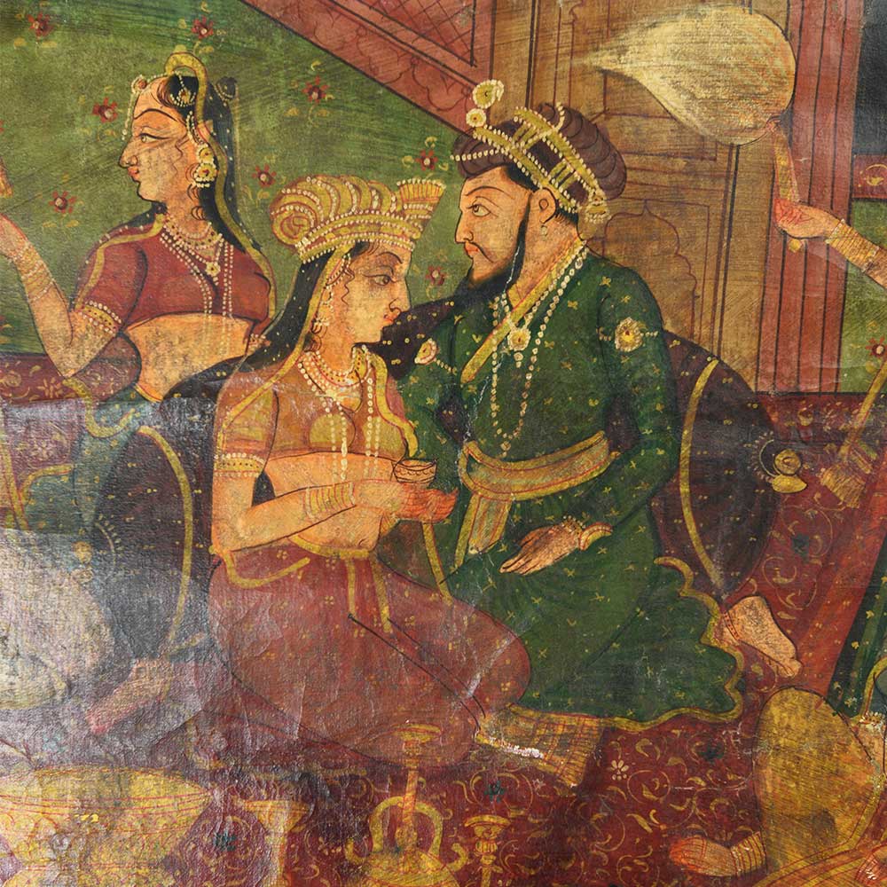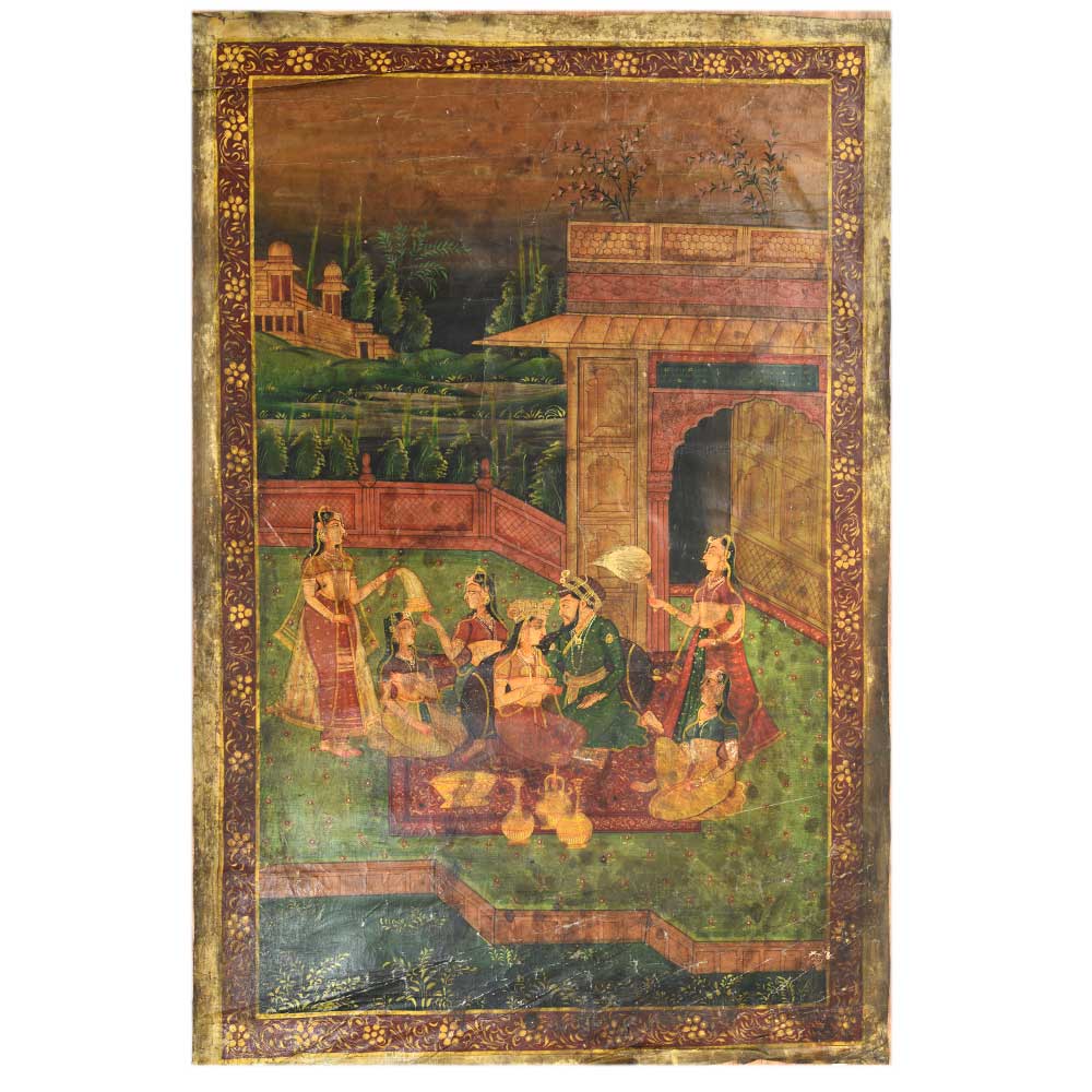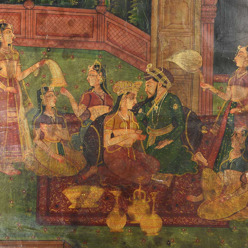 You'll adore this magnificent painting, which depicts the Mughal emperor in the open terrace harem court, enjoying wine and rhythmic dance. This painting will add colour and traditional feel to your home, office and hotel interiors. You can also use it for gifting.