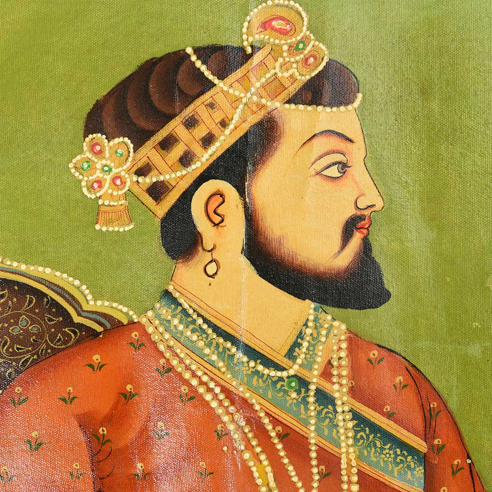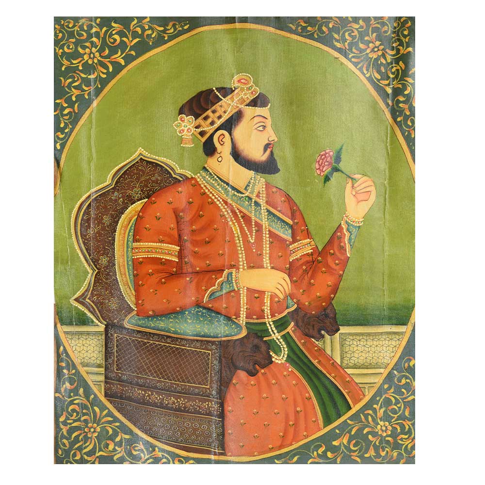 Handmade multi-coloured painting of emperor shah jahan on lion head throne is ideal for display, collection and for gifting purpose.