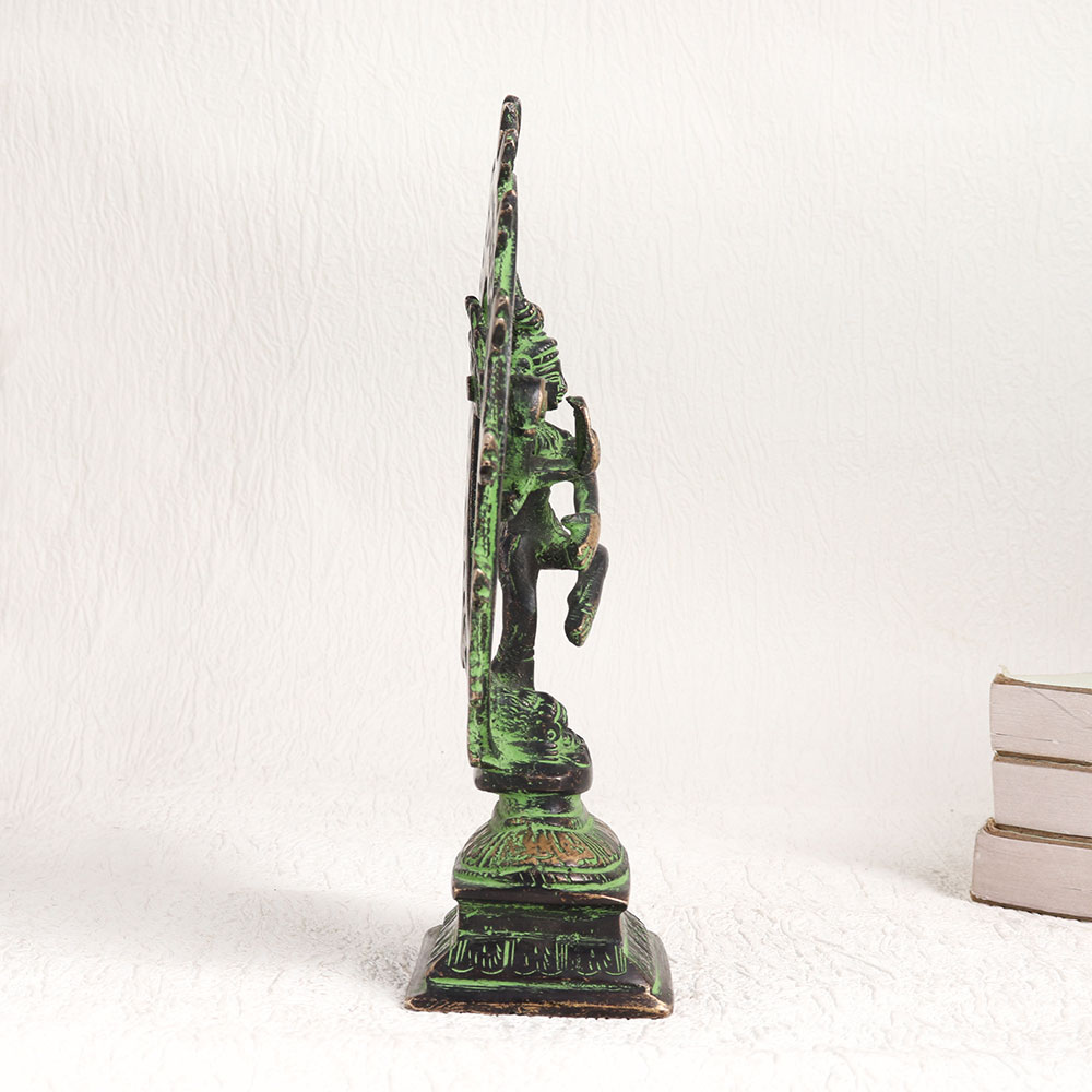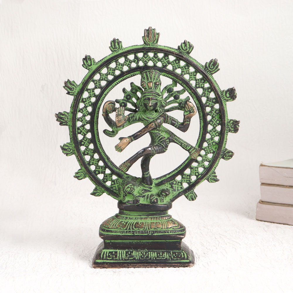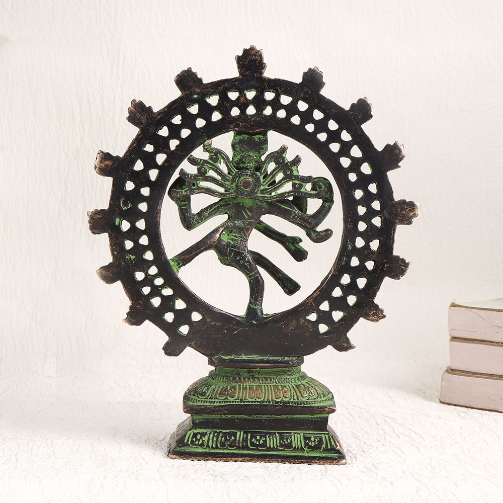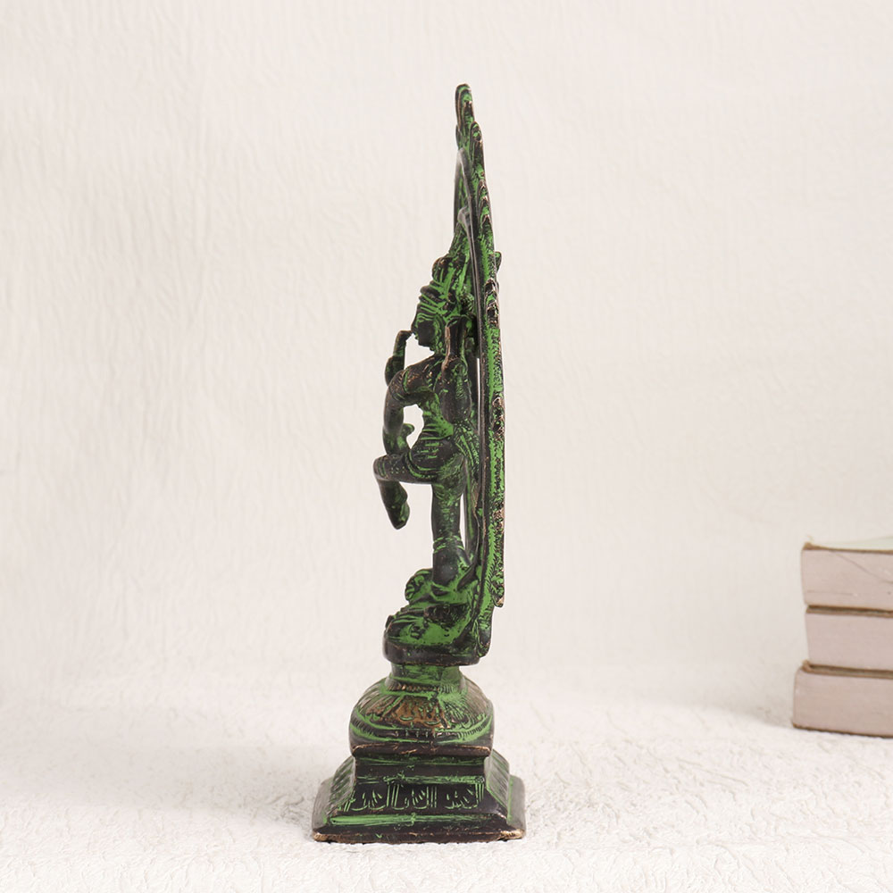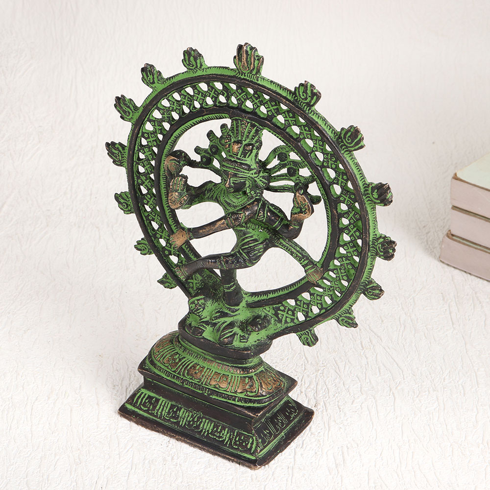 Enhance your space with the exquisite elegance of our brass statue depicting Natraja, the divine avatar of Lord Shiva. This captivating piece of artistry standing on a platform that beautifully captures the essence of Lord Shiva's cosmic dance known as the Tandava in an antique green and black finish. Crafted by highly talented Indian artisans, this masterpiece is a testament to their expertise and devotion. Handcrafted with meticulous attention to detail, this Natraja statue is fashioned from high-quality brass, ensuring its durability and timeless beauty. Versatile in its use, it can grace your home, office, restaurant, hotel, cafe, or shop, adding an aura of spirituality and sophistication to any space. Whether for worship or decoration, it exudes a sense of divinity and grace. This Natraja statue is also a treasure for collectors and can be a stunning addition to exhibitions. It makes for a thoughtful and meaningful gift for your family, friends or relatives on special, festive, or auspicious occasions, embodying the blessings and symbolism associated with Lord Shiva's divine dance.