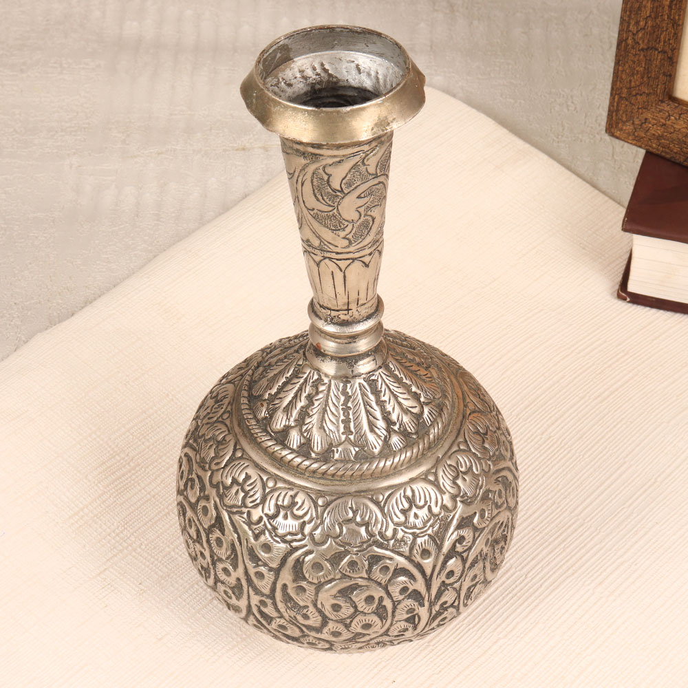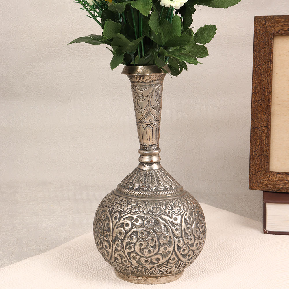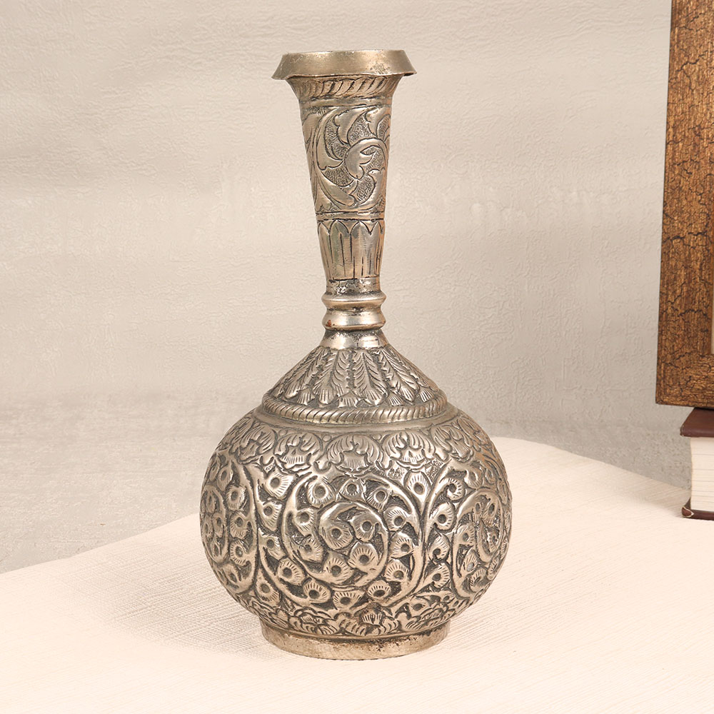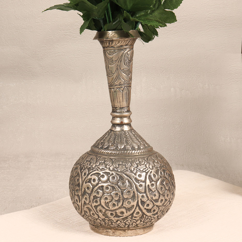 This Nickel-Plated Brass Flower Pot is a true masterpiece handmade by highly talented Indian artisans with a passion for detail and a commitment to quality. This stunning piece is made from high-quality brass, meticulously engraved to perfection, and finished with an antique silver touch that exudes timeless elegance. The intricate engravings on the flower pot showcase the artisan’s exceptional craftsmanship, adding a touch of sophistication to any space. Whether placed in your home, office, restaurant, hotel, or cafe, this versatile piece effortlessly complements various settings, bringing a sense of charm and luxury. This flower pot is not just a decorative item; it's a statement piece that can be proudly added to your vintage collection. Its classic design transcends trends, making it a timeless addition to any decor style. Moreover, it makes for a thoughtful and meaningful gift for your family, friends or relatives on special, festive, or auspicious occasions, embodying the artistry and tradition of Indian craftsmanship.
