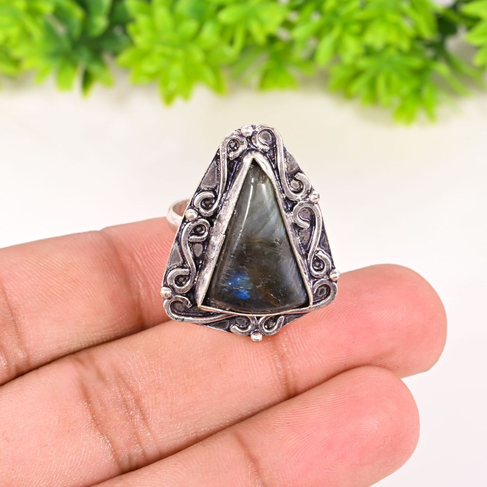 The Handmade Oxidized Brass Ring with Natural Labradorite Gemstone for Women is a soulful blend of earth-born beauty and artisan technique. Crafted in brass and finished with an antique oxidized patina, this ring showcases a natural labradorite gemstone known for its organic flashes of blue, grey, and smoky sheen. The compact form keeps it easy to wear, while the stone brings quiet drama and depth. Designed for women who appreciate authenticity and meaning, this ring feels grounded and timeless.