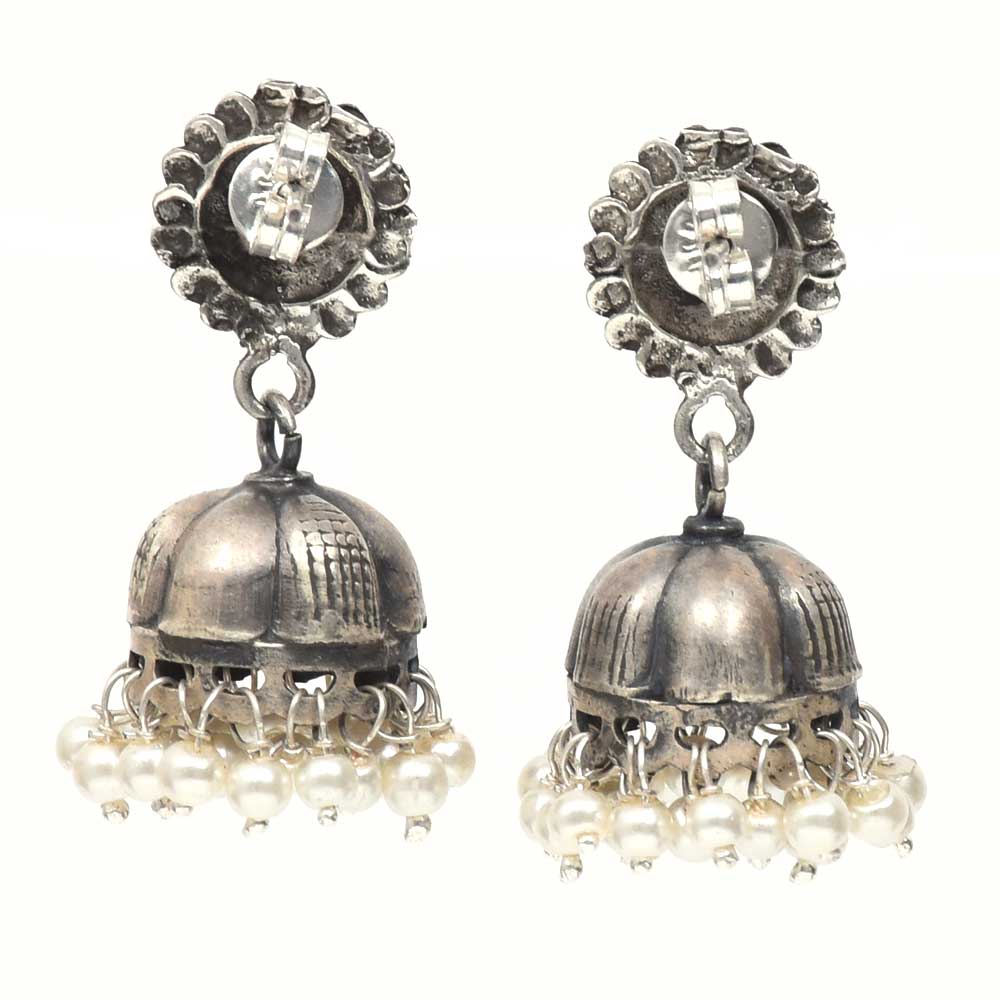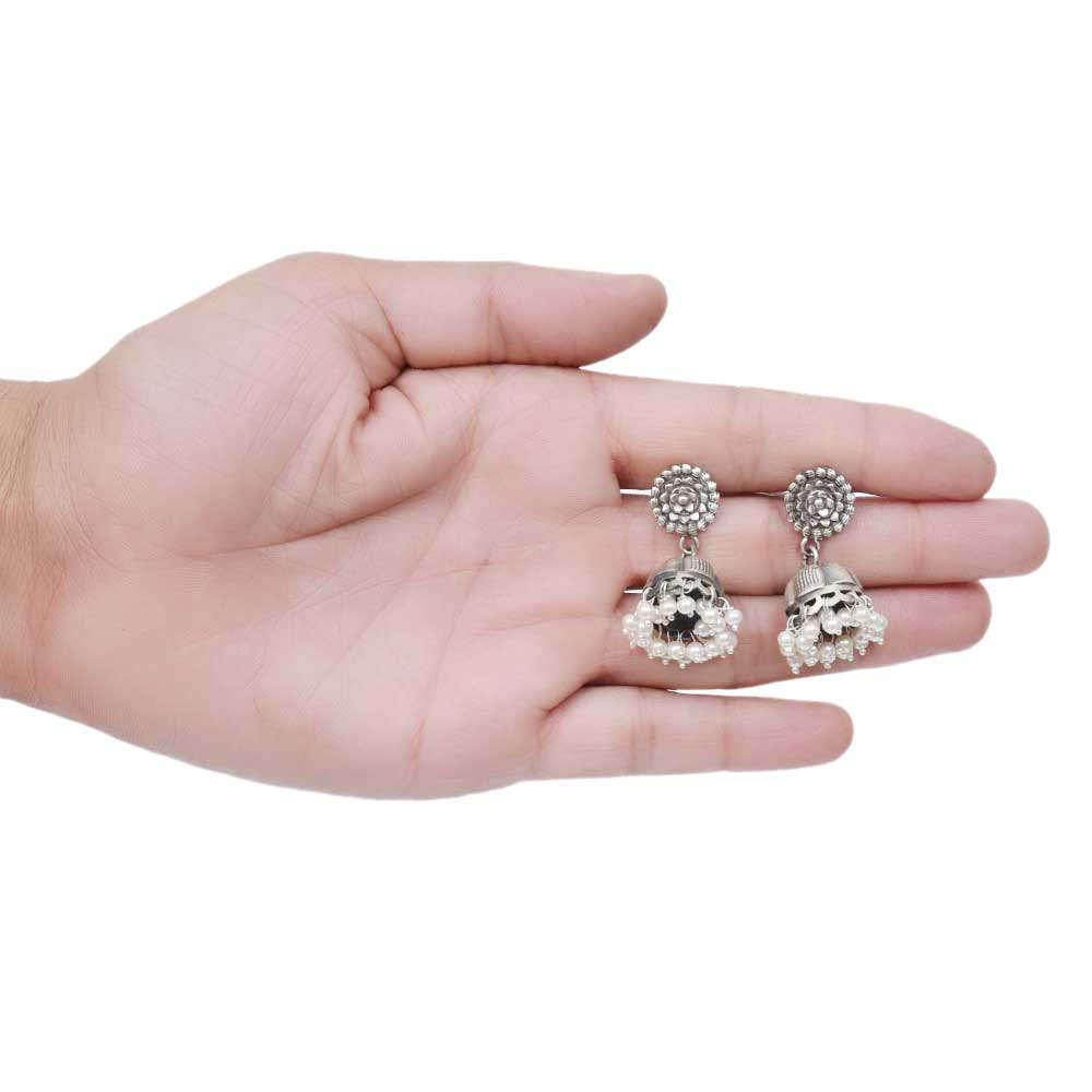 Oxidized Silver Floral Stud Jhumki Jhumka Earring with Pearl beads is stunning and very suitable for all kinds of dressing occasions. Great for college wear, office wear, party wear.