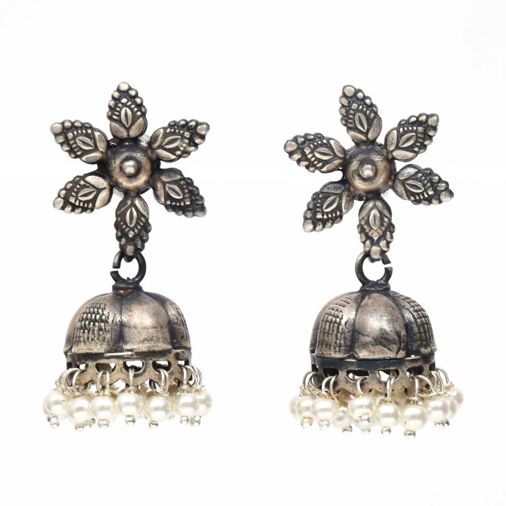 Wear these handcrafted Oxidized Silver Jhumkis with a large petal flower nail design and pearl hanging for weddings, parties, festivals, and special occasions to create unforgettable moments