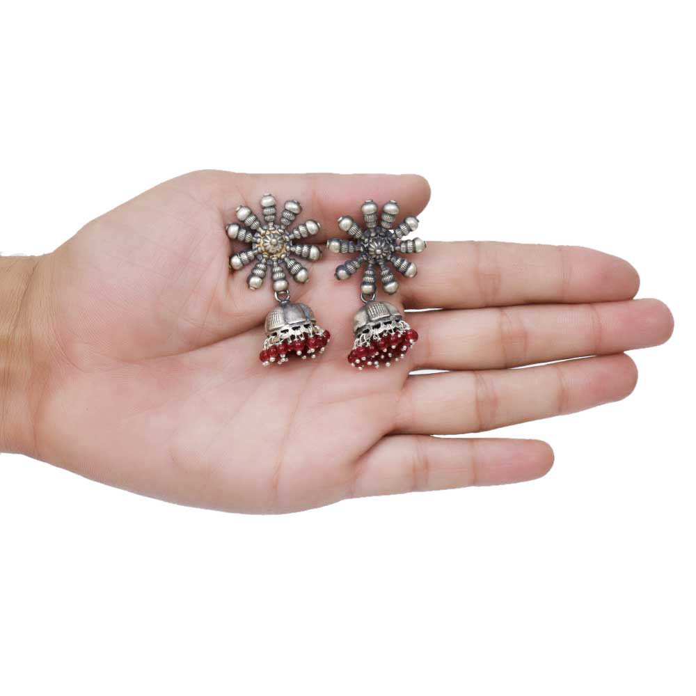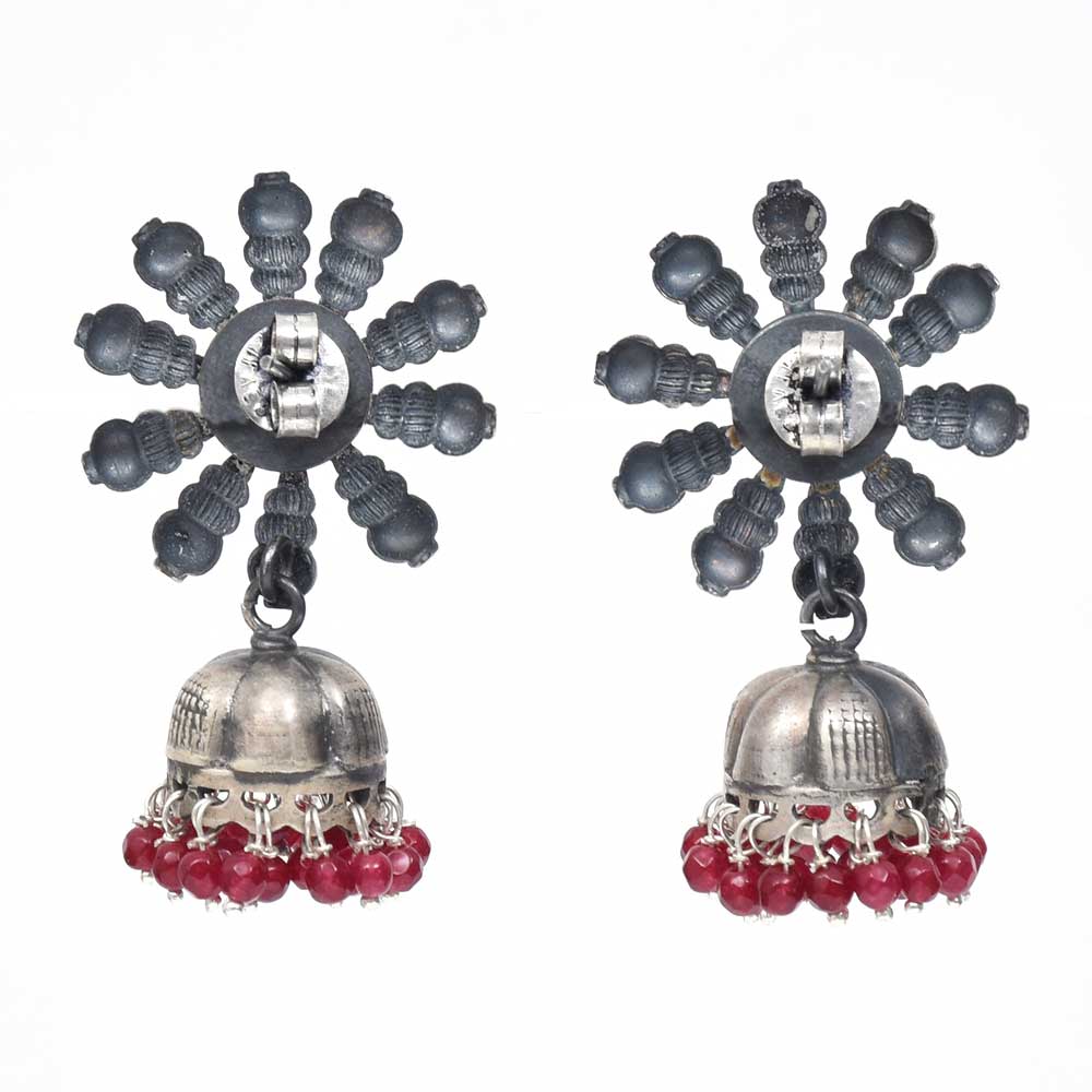 Handmade Oxidized Silver Jhumka stud earrings with red beads make you look charming. Wear it on all auspicious occasions like ring ceremonies, weddings or festivals.