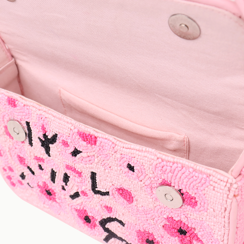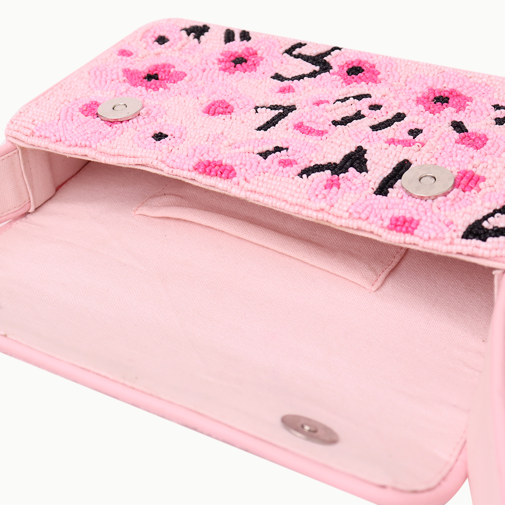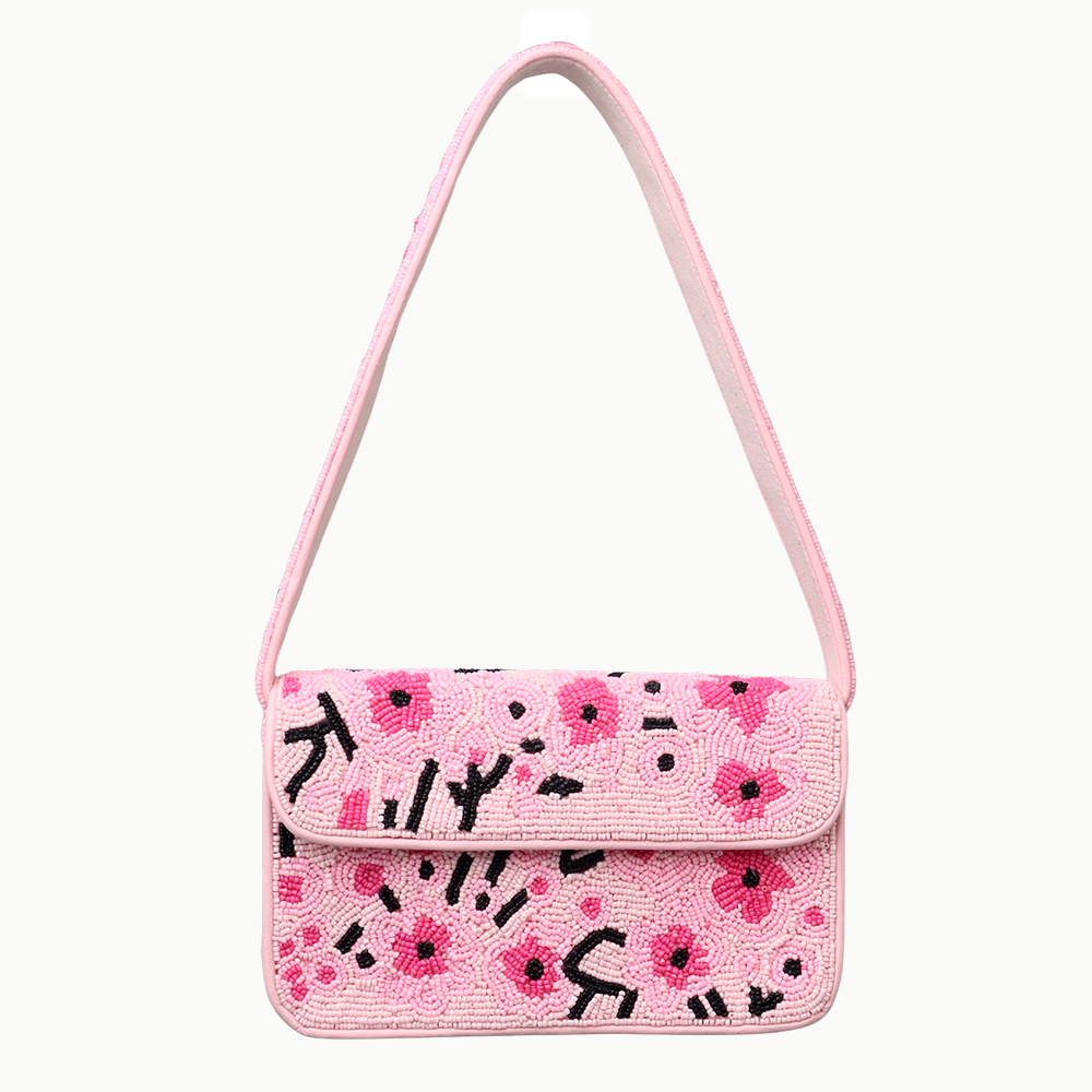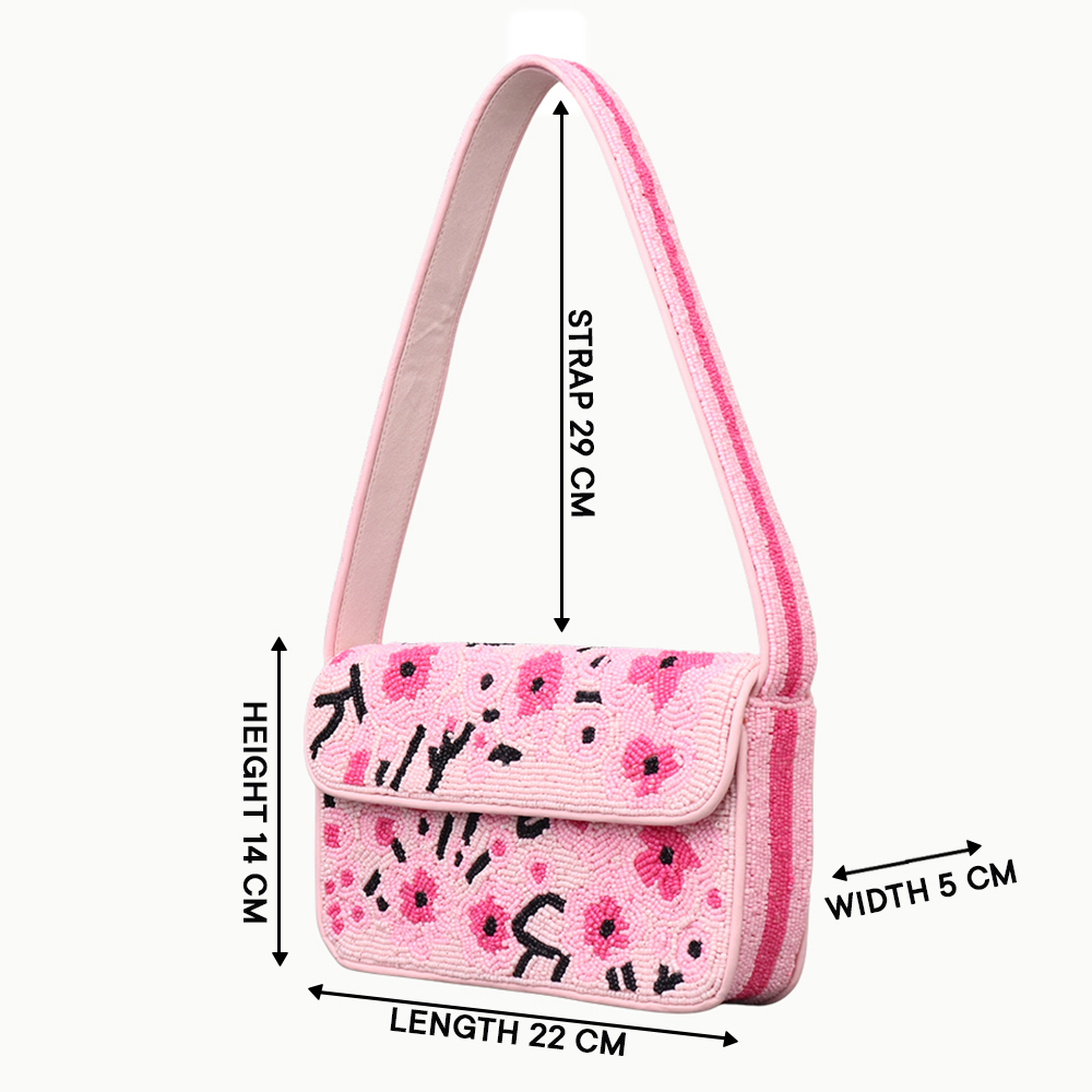 Brighten your wardrobe with this handmade pink beaded shoulder bag, beautifully crafted with vibrant floral embroidery. Adorned with delicate seed beads in shades of pink and black accents, this bag exudes a playful yet elegant charm. Its spacious interior and sturdy strap make it perfect for daily outings, parties, or casual wear, adding a fun and fashionable touch to any outfit. A true blend of artistry and practicality.