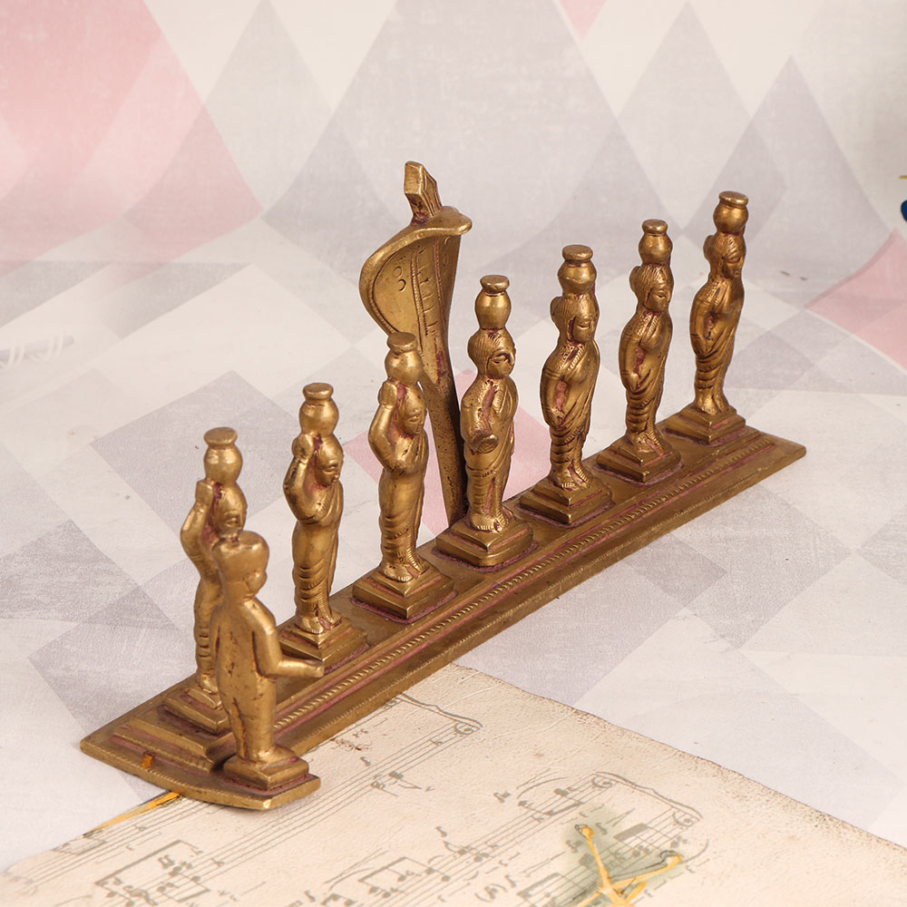 A handmade brass statue that encapsulates the essence of Indian artistry. This exquisite piece features eight figures, with seven graceful ladies forming a row while one stands aside. Each of these women balances a pot on her head, showcasing the skilled craftsmanship of Indian artisans. The centerpiece of this stunning statue is the center lady, with a majestic cobra head rising above her back, exuding an aura of mystique and allure. The entire sculpture boasts an antique golden finish, lending it an air of timeless elegance that effortlessly enhances any space. Crafted by talented Indian artisans with a keen eye for detail, this brass statue is a testament to their dedication and expertise. It's a versatile piece, perfect for adorning your home, office, restaurant, hotel, cafe, or shop, adding a touch of Indian culture and heritage to any environment. Whether you're an art enthusiast, a collector of vintage treasures, or an exhibitor looking to dazzle your audience, this statue is a captivating choice. Moreover, it makes for a thoughtful and meaningful gift for your family, friends or relatives on special, festive, or auspicious occasions, symbolizing the rich tradition and artistry of India.