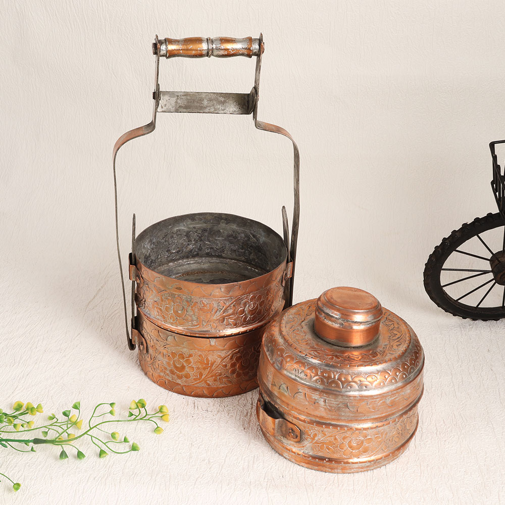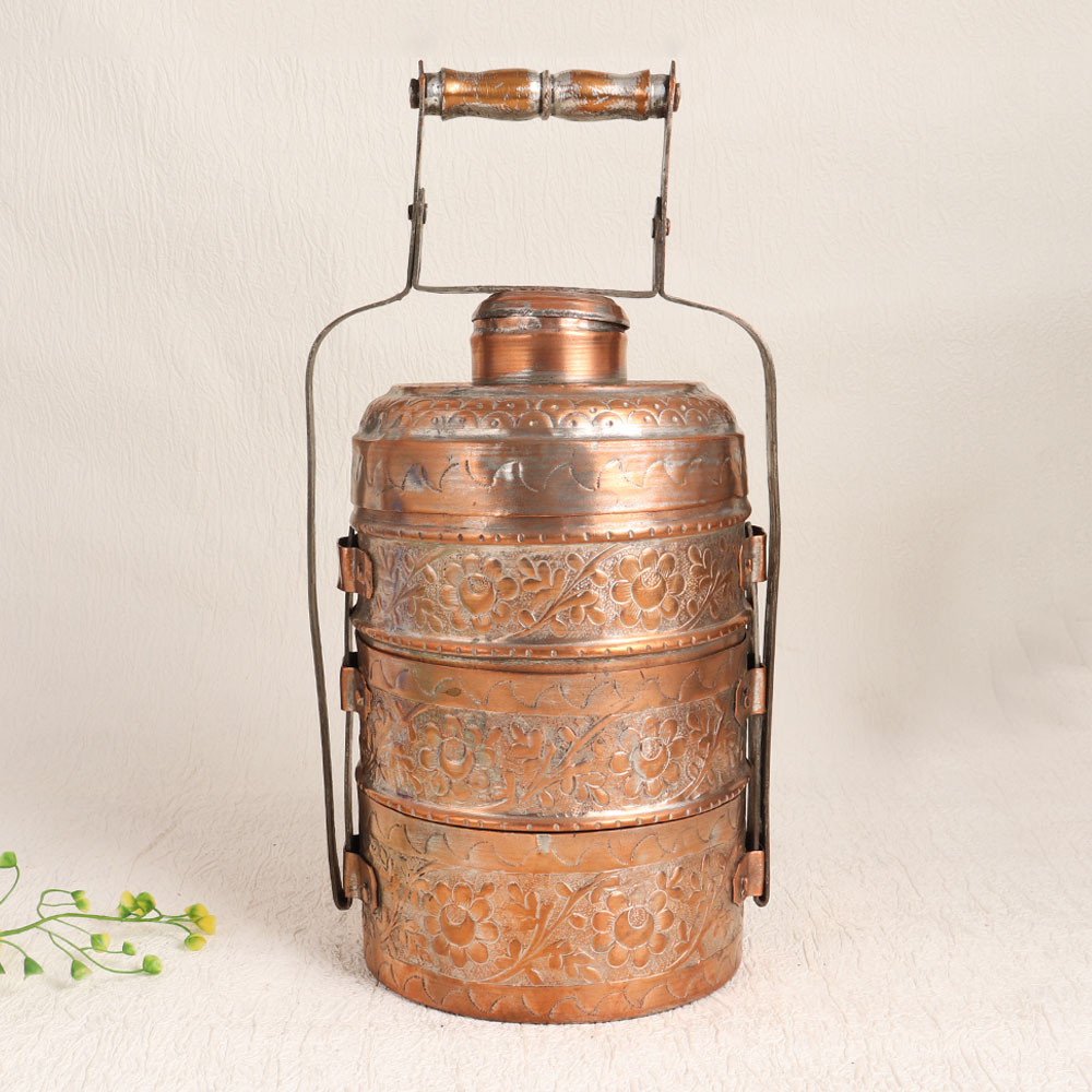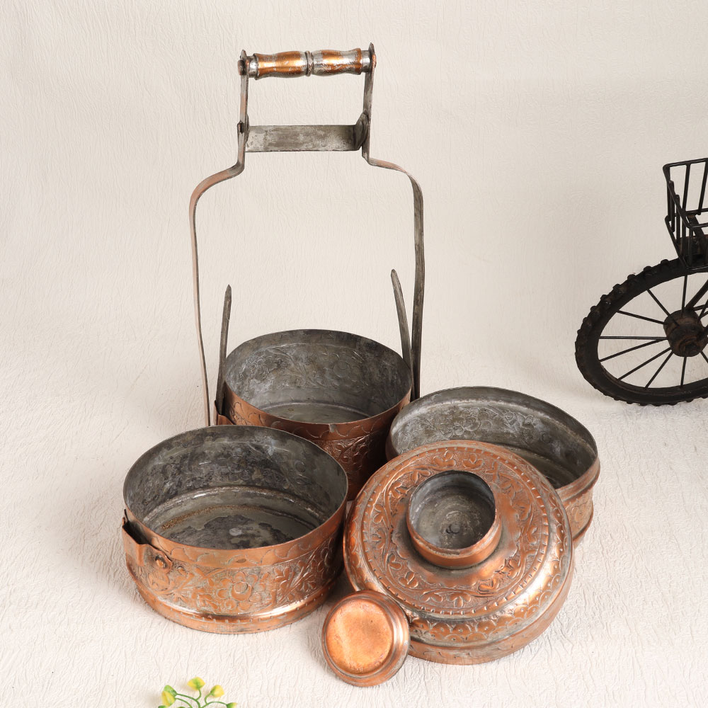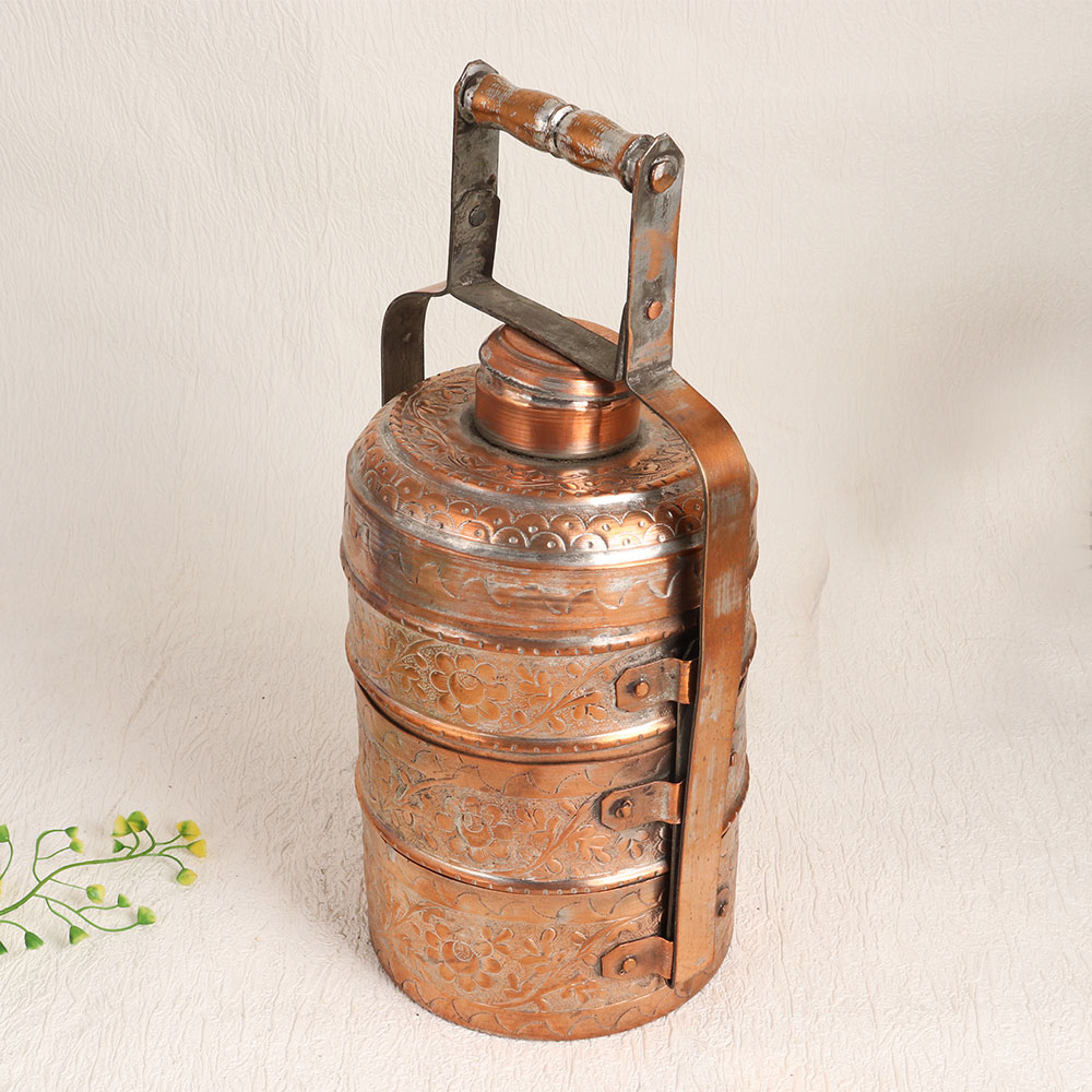 Buy a Vintage Copper Tiffin Box online from our website and get a hassle free delivery at your doorstep. Handmade by professional artisans in the exquisite tradition of Islamic Art, this stunning piece exudes an air of nostalgia and elegance. Crafted from high-quality copper, this tiffin box boasts a rich antique brown finish that enhances its vintage charm. The intricate engravings, reminiscent of a bygone era, lend a touch of sophistication to this exquisite piece. Featuring three spacious compartments for storing your culinary treasures and a small compartment for added convenience, it's a versatile addition to your decor. While it can be used at home, office, restaurant, hotel, cafe, or shop for decoration, please note that due to its vintage nature, we recommend it primarily for decorative purposes. This Vintage Copper Tiffin Box makes for an exceptional addition to your vintage collection or a captivating display at exhibitions. It also serves as a thoughtful gift for your family, friends or relatives on special, festive, or auspicious occasions, commemorating the beauty of craftsmanship and the allure of the past.