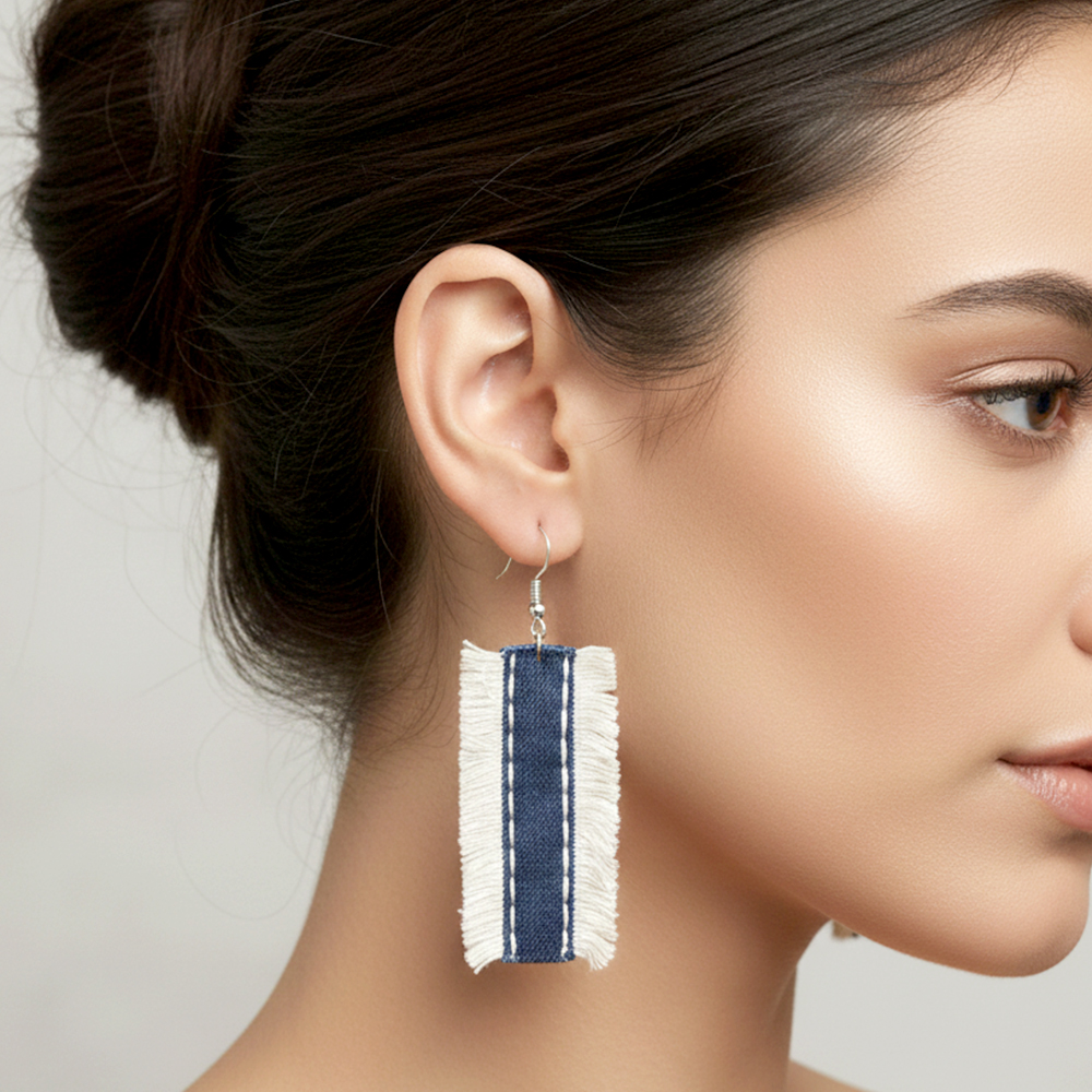 These handmade rectangular drop earrings are designed as lightweight accessories that bring a clean artistic accent to everyday styling. With a slim elongated form and soft fringe edges they offer visual texture while remaining comfortable for long wear. Simple expressive and easy to pair these earrings suit casual outfits thoughtful gifting and daily use. Packed and quality checked by Indianshelf. Structured Shape With Soft Movement The rectangular form creates a balanced drop while the fringe detailing adds gentle movement. Designed to sit comfortably on the ears these earrings combine visual interest with easy wearability. Handcrafted rectangular drop earrings with stitched detailing Entirely handmade no machines used Lightweight construction suitable for extended wear Essential Product Information Origin India Safely packed and quality checked by Indianshelf Pair of rectangular drop earrings included Styling And Wearing Ideas Pair with casual outfits for everyday use Add an artistic accent to simple looks Suitable for gifting and personal collections Works well for boutique displays and curated accessory sets Care And Handling Guidance Avoid contact with moisture and sharp objects. Clean gently using a dry cloth. Store separately to maintain shape and fringe edges. Frequently Asked Questions Are these earrings lightweight Yes they are designed to be comfortable for all day wear. Can they be worn daily Yes the simple design makes them suitable for regular everyday use. Will both earrings look exactly the same Minor variations may occur due to the handmade process. Are these suitable for gifting Yes their handcrafted design makes them a thoughtful gift option. Handcrafted With Care Every piece reflects heritage artistry and careful attention to detail. All our products are handmade never machine made ensuring individuality.