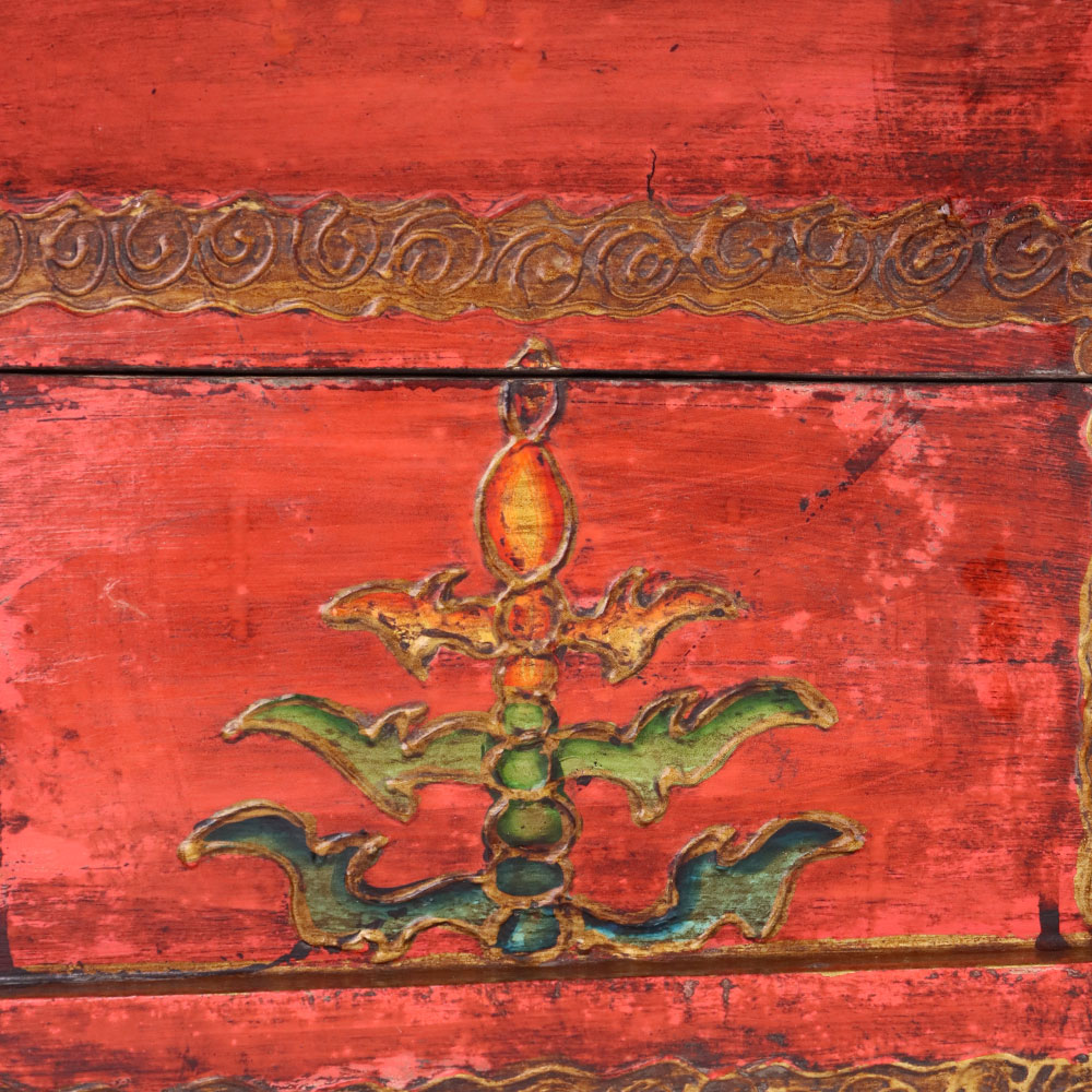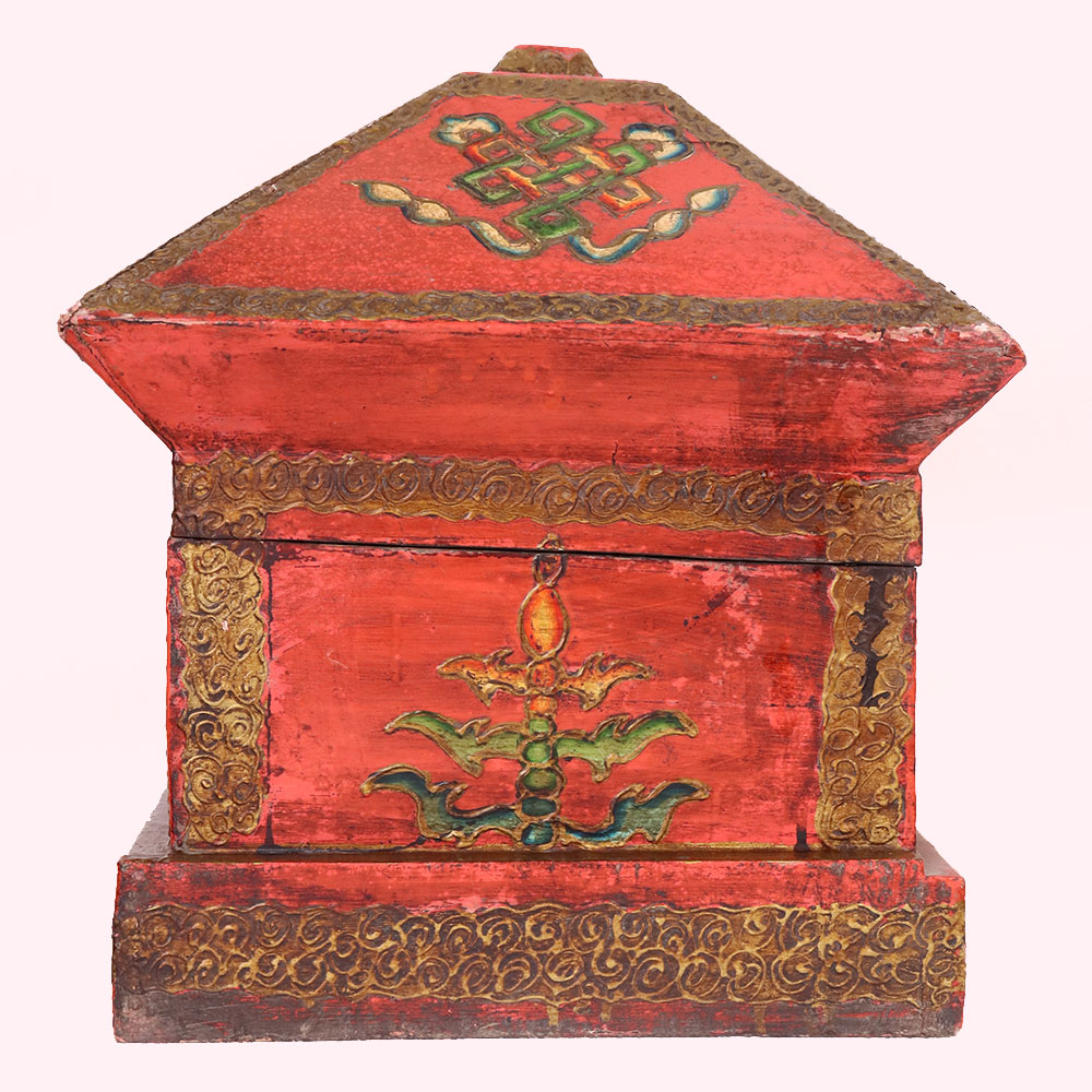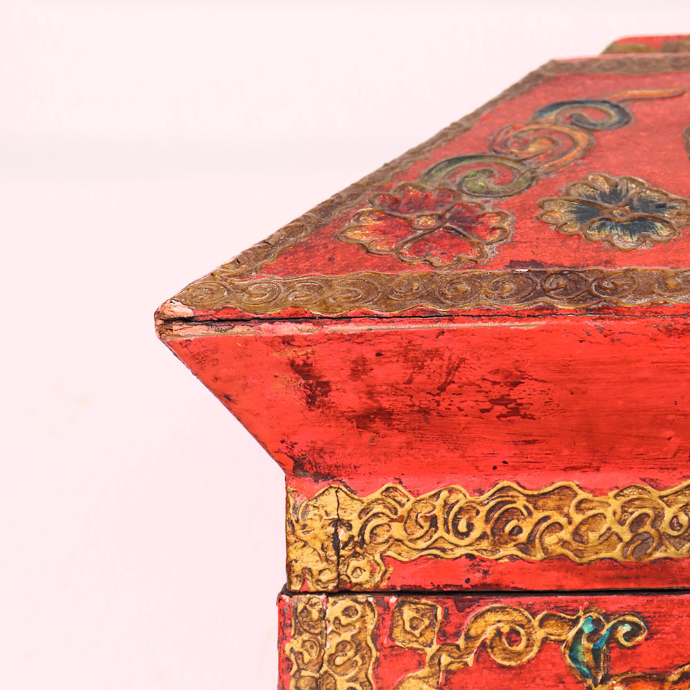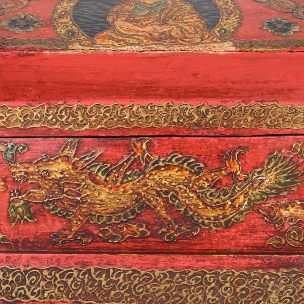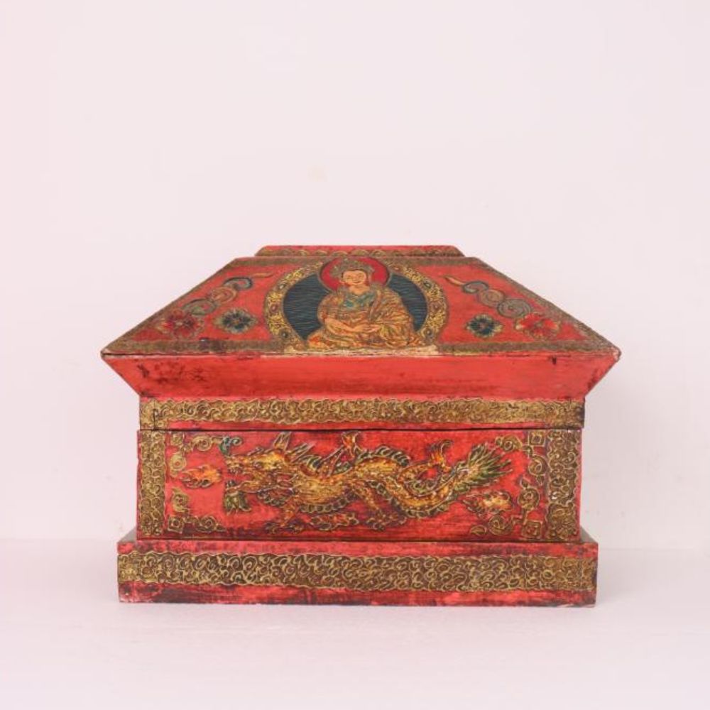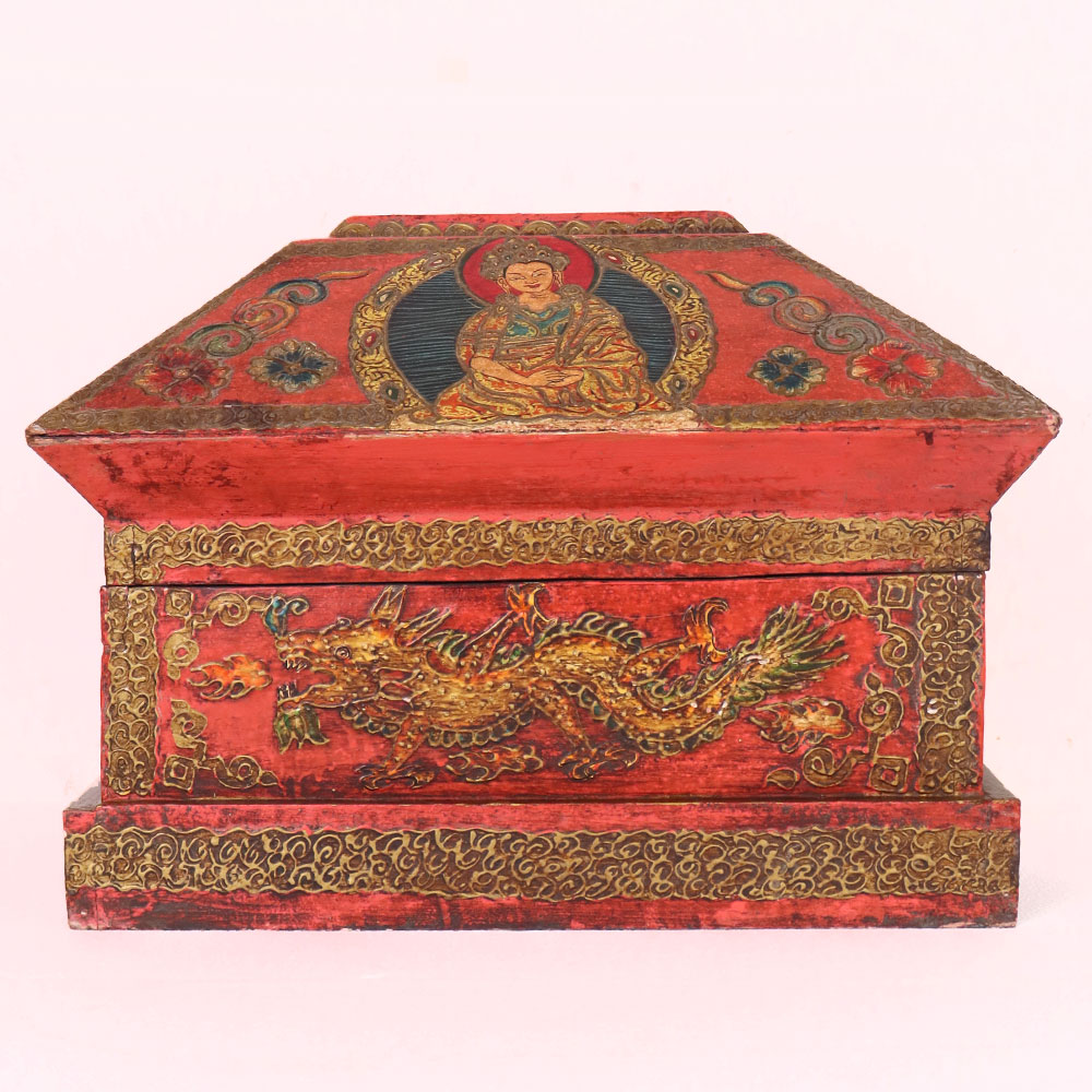 Elevate your décor with this handmade wooden box, richly hand-painted in deep red with intricate Buddha and dragon motifs. The Buddha artwork on the slanted lid symbolizes wisdom and serenity, while the golden dragon carvings represent power, strength, and protection. Framed with ornate gold detailing, this antique-style chest beautifully blends spiritual symbolism with traditional Himalayan craftsmanship. Made from durable wood, it offers a compact yet functional storage solution for jewelry, keepsakes, or sacred objects. Its distressed vintage finish enhances authenticity, making it a unique collectible and décor accent. Ideal for meditation spaces, heritage-inspired homes, or as a thoughtful gift, this artisan-crafted box embodies both cultural depth and timeless beauty. Each piece is uniquely hand-painted, ensuring no two are exactly alike.