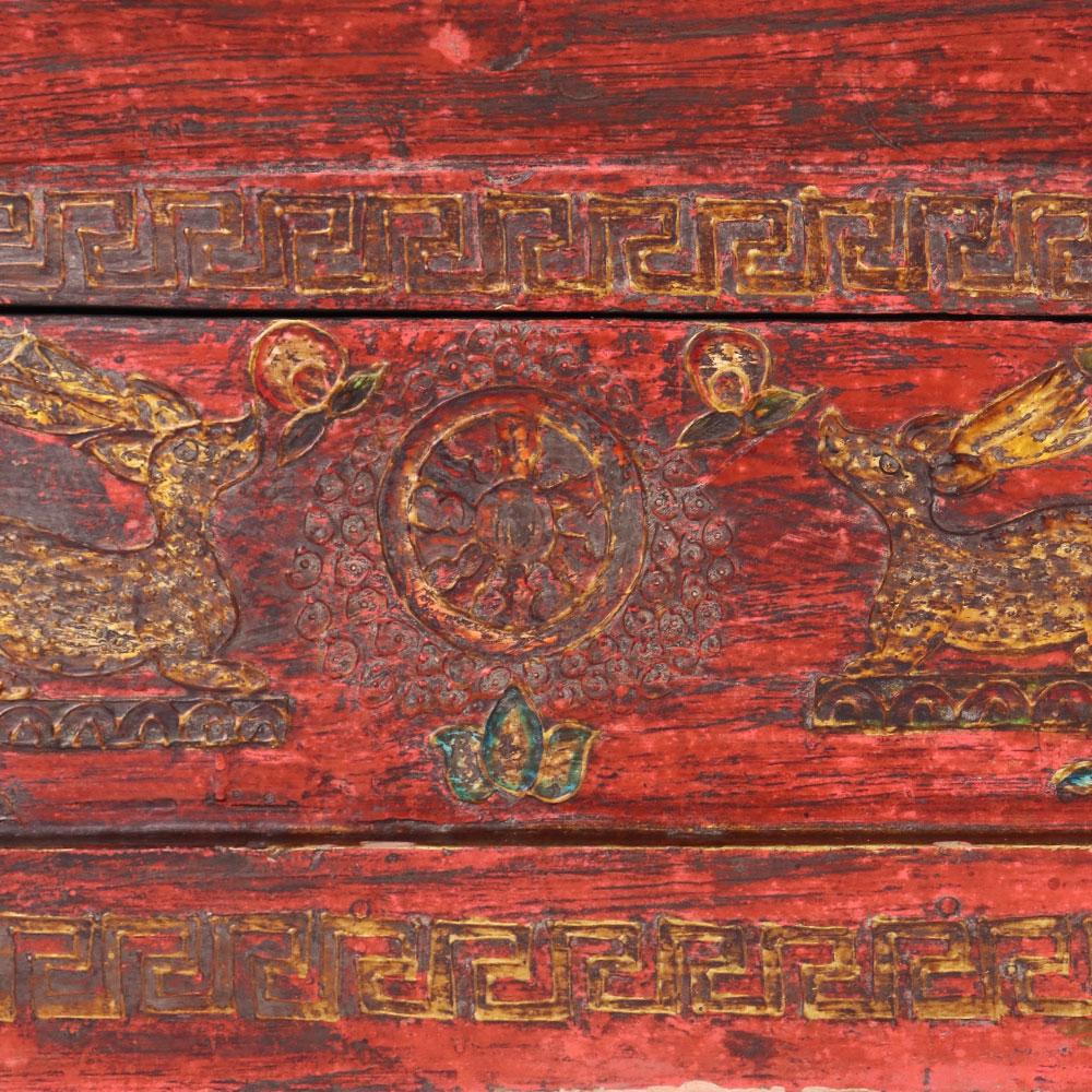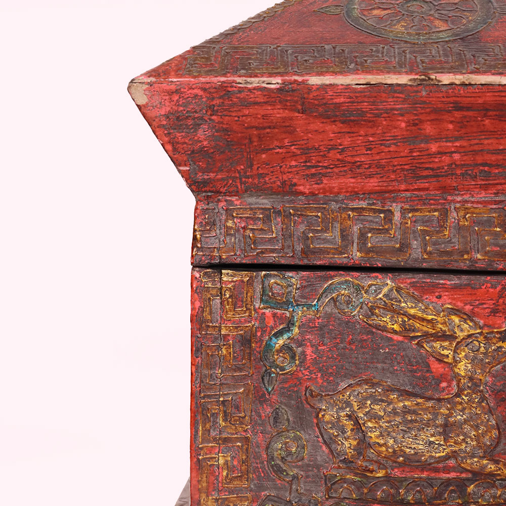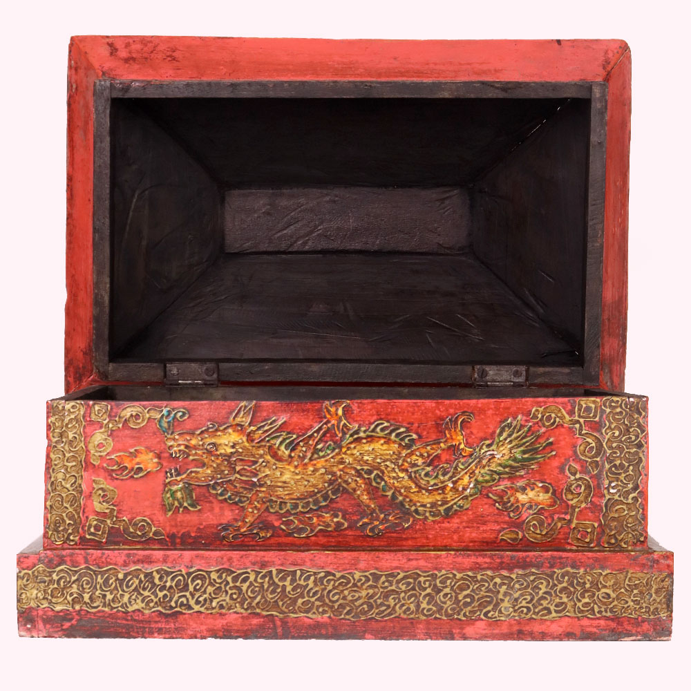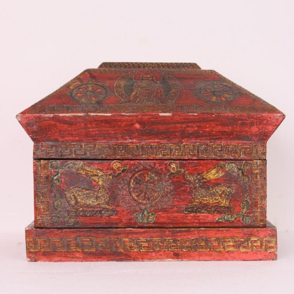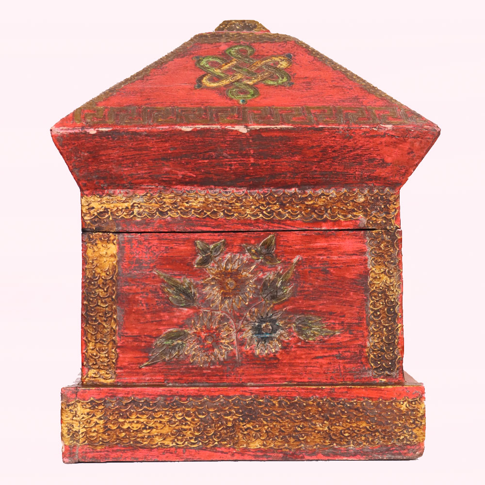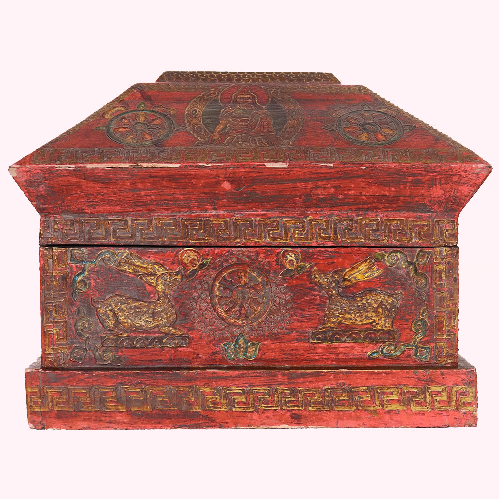 Bring cultural elegance into your home with this handmade antique wooden box, hand-painted in a striking red finish with intricate Buddha artwork and sacred symbols. The lid features a serene Buddha surrounded by traditional motifs, while the front panel is adorned with golden deer and Dharma Wheel designs, symbolizing peace, wisdom, and enlightenment. Detailed golden borders and geometric patterns frame the box, showcasing the artistry of skilled Himalayan craftsmen. Crafted from durable wood, this vintage chest offers both beauty and functionality, ideal for storing jewelry, keepsakes, or sacred objects. Its compact size and distressed finish add authentic antique charm, making it a meaningful accent for meditation spaces, heritage-inspired interiors, or spiritual altars. Each piece is individually hand-painted, ensuring no two boxes are the same, making it a unique collectible or thoughtful gift.