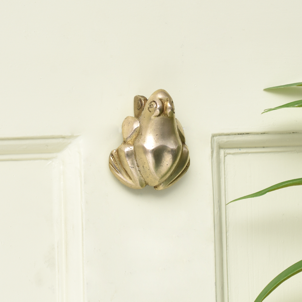 Very Interesting handmade Frog door knocker made of high quality brass by expert artisans and craftsmen of india. This frog door knocker bring a forest feel to the interiors since it has an integrated slim back plate that gives a loud knocking sound when the knocker is banged on the plate.