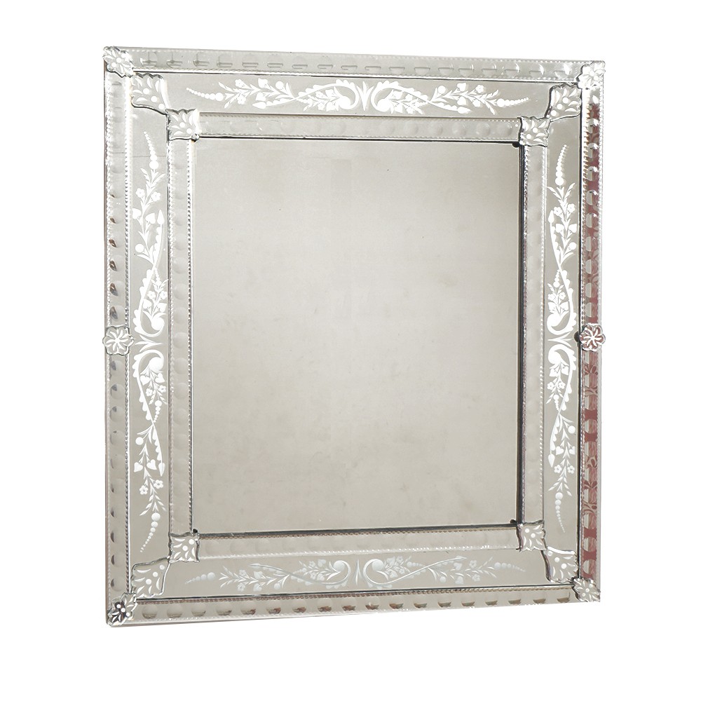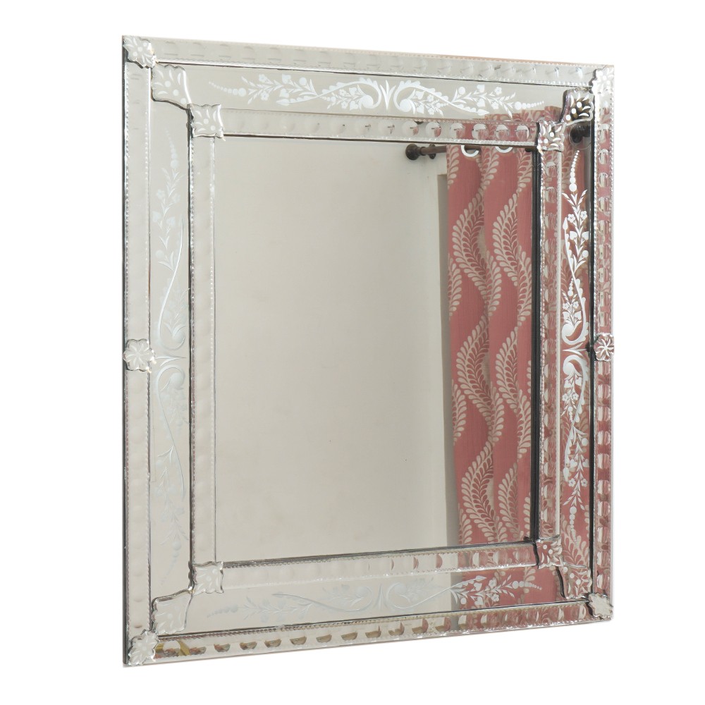 The square mirror shape reveals a contemporary design feel without losing the classic elegance. The outer frame is made from a beautiful separate mirror layer with exquisite flower and scroll engravings, each hand cut and individually assembled. This frame has a large central square mirror that adds depth and interest to any large room.
