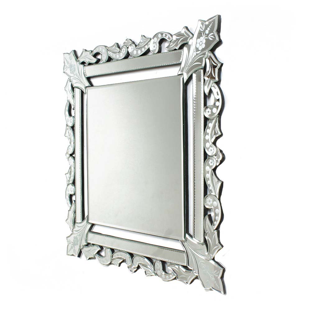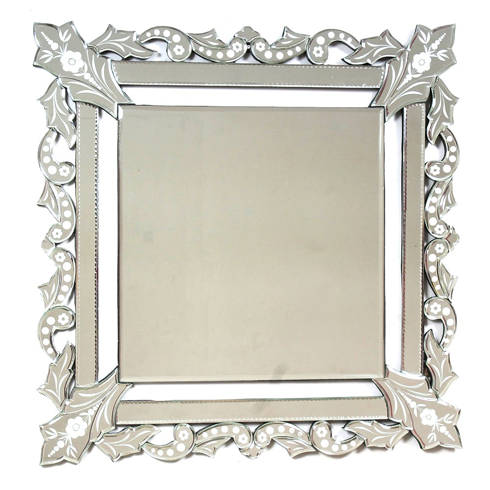 This mirror has a very luxurious appearance with an elegant and detailed frosting design on the edges. The mirror itself is made up of smaller individual mirrors in addition to the central square shaped mirror.