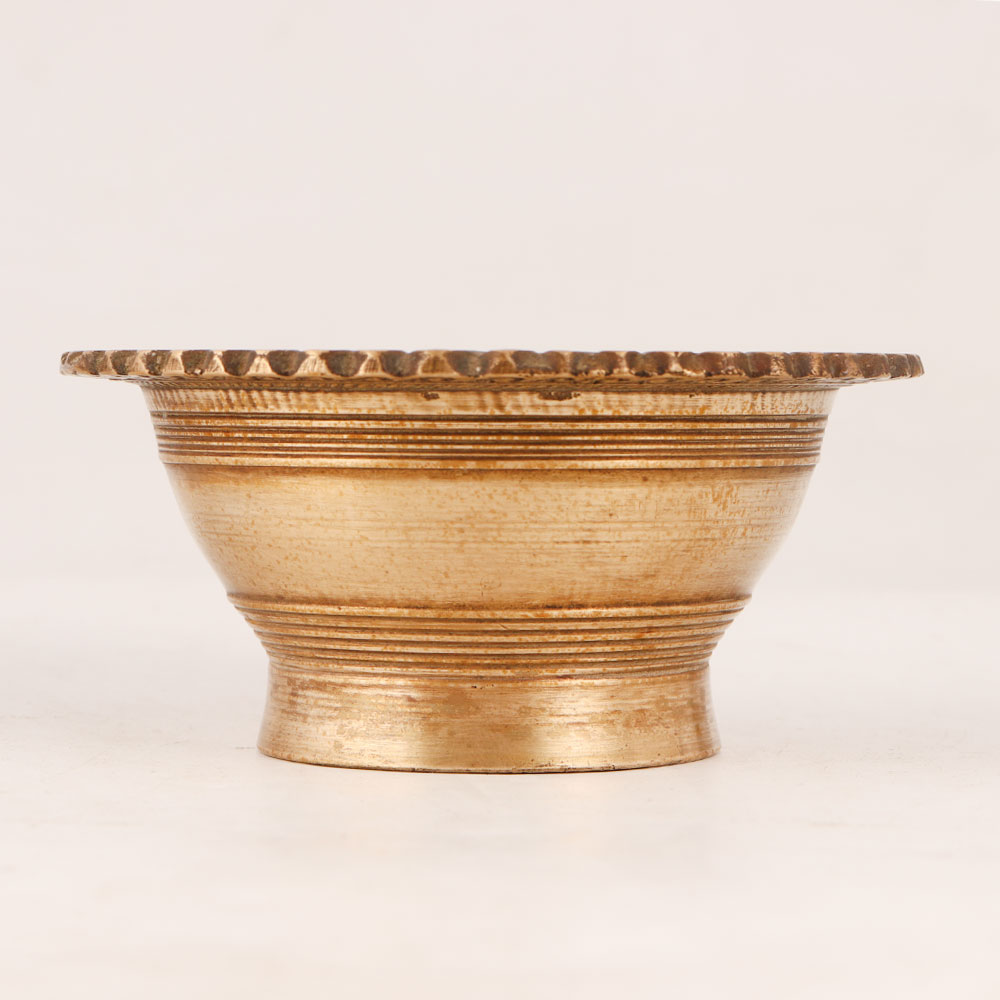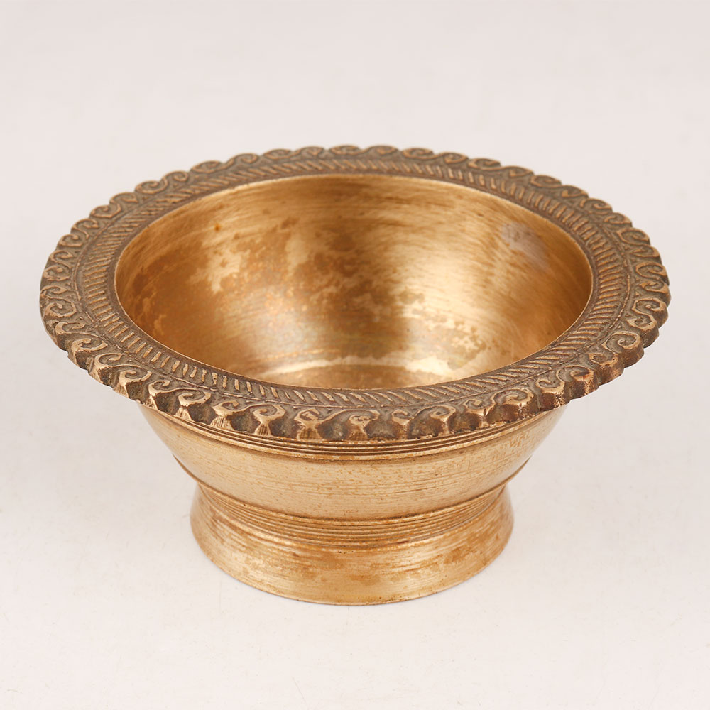 Enhance your spiritual rituals and create an atmosphere of divine connection with this exquisite brass bowl, meticulously crafted for Kumkum Tilak ceremonies. Handcrafted by highly skilled and experienced Indian craftsmen, this small brass bowl showcases an antique golden finish that exudes timeless elegance. Designed to hold Kumkum, the sacred red powder used in Hindu rituals, this bowl is perfect for placing a Tilak, the mark between the eyebrows symbolizing the spiritual third eye. Its high-quality brass construction not only ensures its authenticity but also resonates with tradition. This versatile piece transcends its ritualistic purpose and becomes an adornment for various settings. Whether adorning your prayer room, temple, home, office, or commercial spaces like restaurants, hotels, and cafes, its presence emanates an aura of spiritual tranquillity and aesthetic allure. Consider this exquisite brass bowl for gifting on special occasions, festivals, or auspicious events. Its intricate craftsmanship and cultural significance make it a thoughtful present, while its potential to enrich a vintage collection or enhance exhibition displays is boundless.