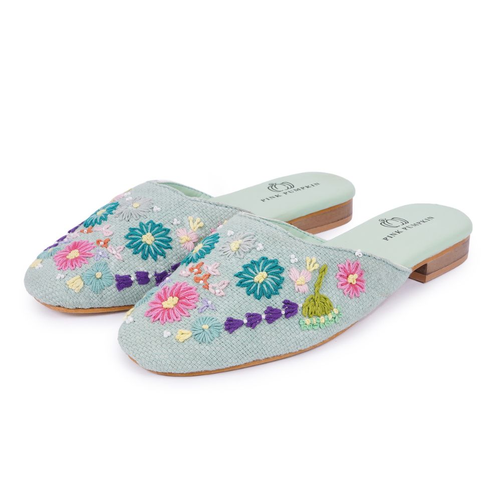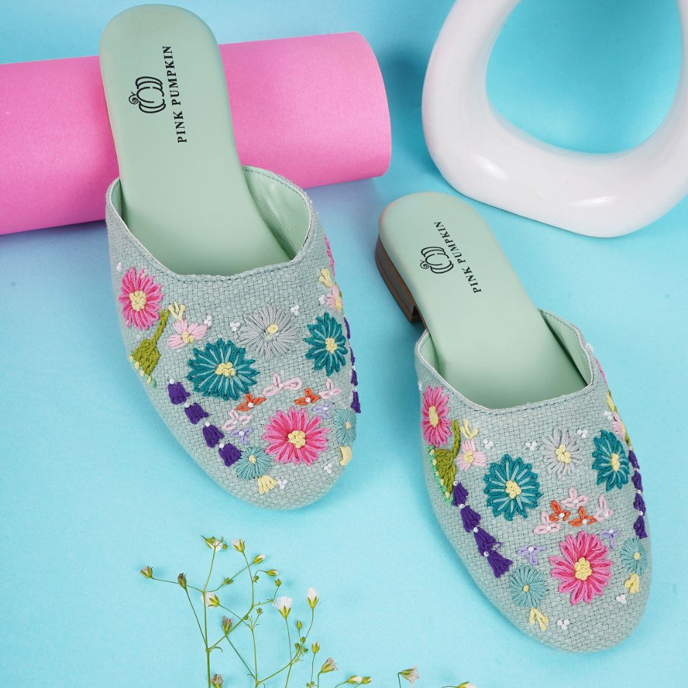 This mules unites floral, pastel, soft design with cotton fabric, rexin, tunit craftsmanship in a soft pastel, pastel palette. Created for decorators, it enhances personal style or makes a memorable gift. Packed and quality checked by Indianshelf. Each piece is uniquely crafted by skilled artisans.