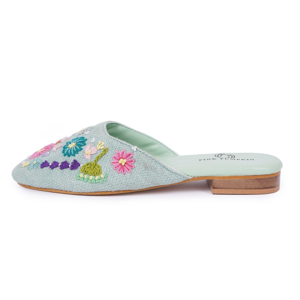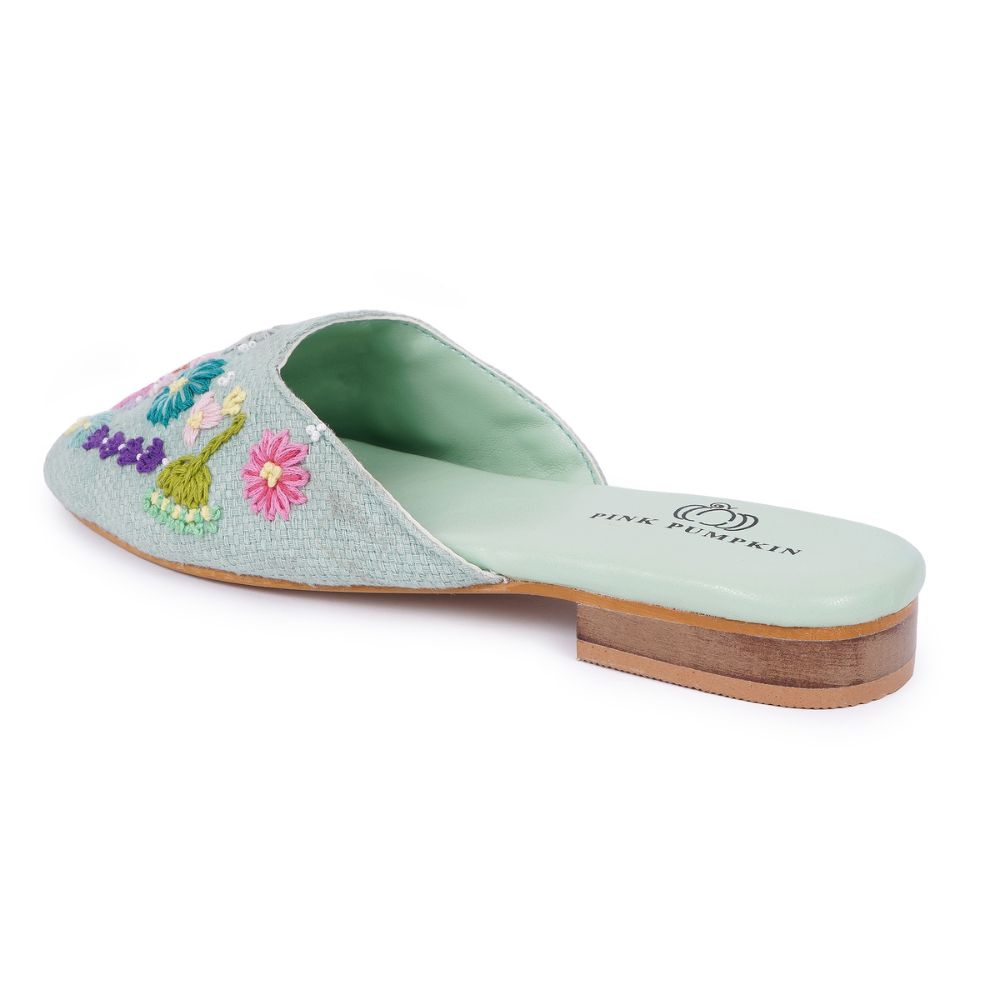 Gently clean floral mules with a soft brush; store in a cool dry place and avoid prolonged sun exposure.
