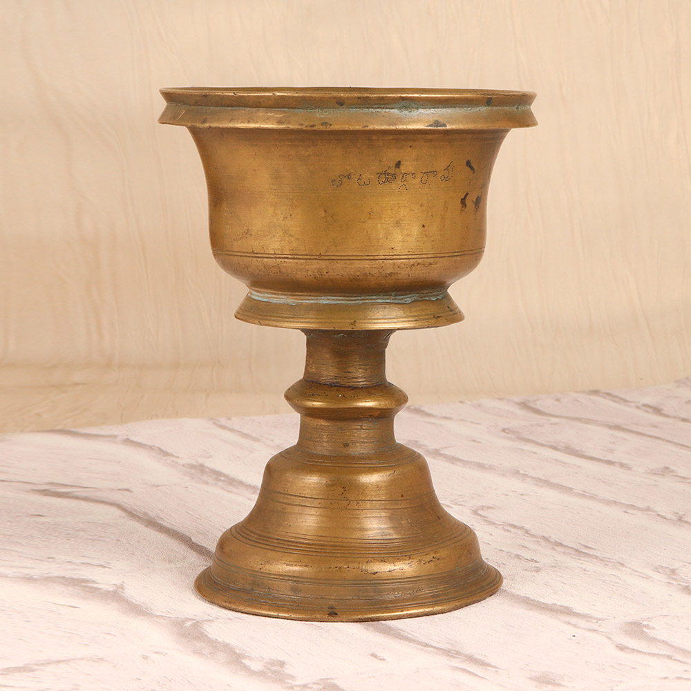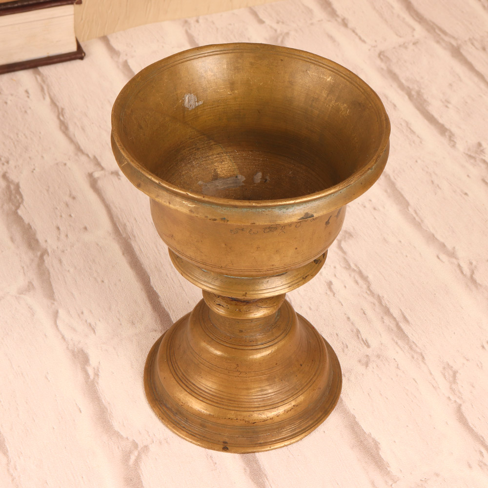This exquisite vintage brass holy water cup is a must-have for anyone looking to infuse their space with the rich cultural heritage of South Indian art. Meticulously crafted from high-quality brass, this cup emanates an air of reverence and sacredness, making it the perfect vessel for holding holy water during your spiritual rituals and ceremonies. The plain brown finish lends it a timeless, understated charm that allows it to seamlessly blend into any decor, whether you're adorning a meditation space, prayer room, or living area. With its durable construction, this holy water cup will maintain its elegant beauty for years to come, becoming a cherished part of your spiritual journey. Elevate your daily practice and create a deeper connection to your faith by incorporating this stunning brass cup into your routine. Whether you're a devout practitioner or simply appreciative of South Indian art and culture, this holy water cup is a beautiful and functional addition that will infuse your space with a sense of reverence and tranquility.