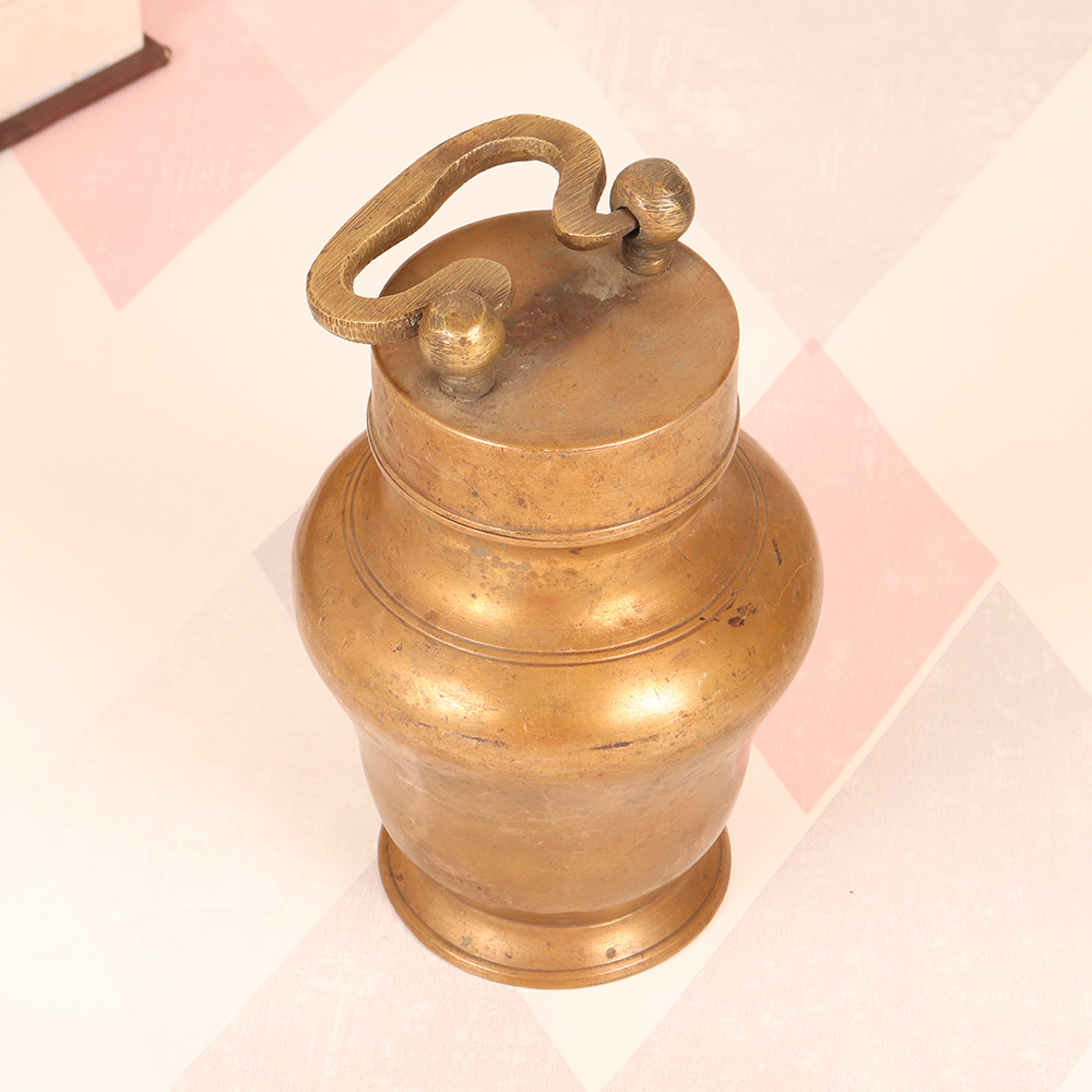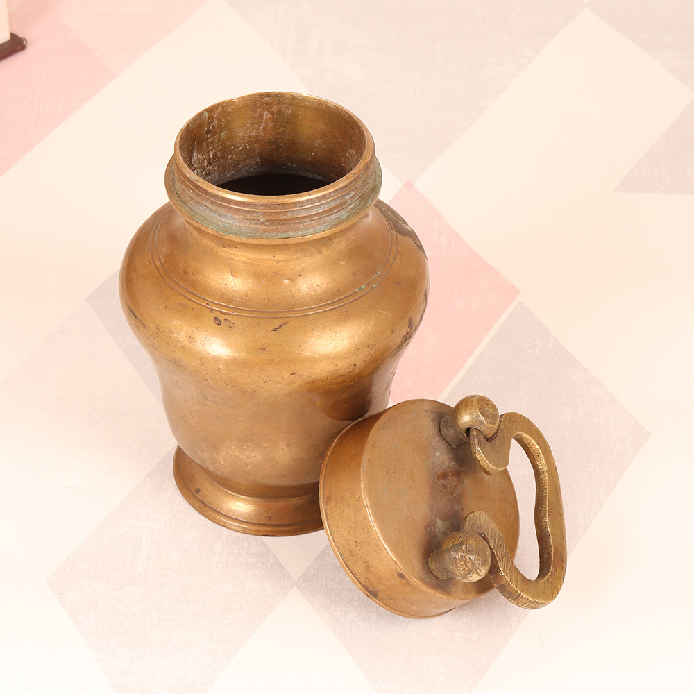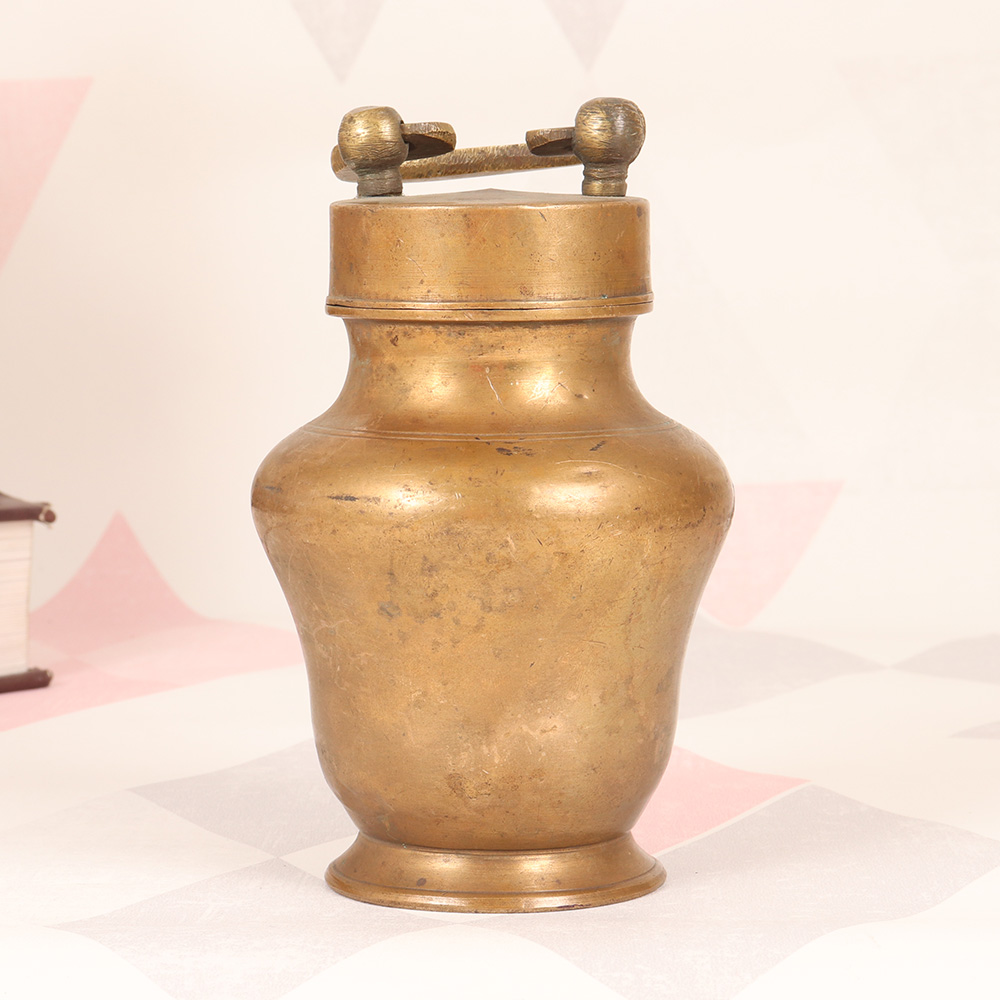 Immerse yourself in the rich cultural heritage of South India with this exquisite vintage brass holy water pot. Meticulously handcrafted using time-honored techniques, this stunning vessel is a testament to the enduring artistry of the region. The durable brass construction and plain brown finish lend an air of understated elegance, while the lidded design and convenient handle make it a practical addition to your spiritual practice. Whether you use it to bless your home, cleanse your body, or simply admire its beauty, this holy water pot will infuse your space with a sense of reverence and tranquility. Suitable for practitioners of Hindu, Buddhist, or other spiritual traditions, this vintage brass masterpiece is a must-have for anyone seeking to deepen their connection to the divine. Elevate your daily rituals with this timeless and versatile accessory, and let it become a cherished centerpiece in your sacred sanctuary.